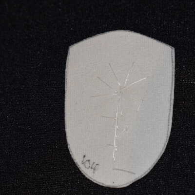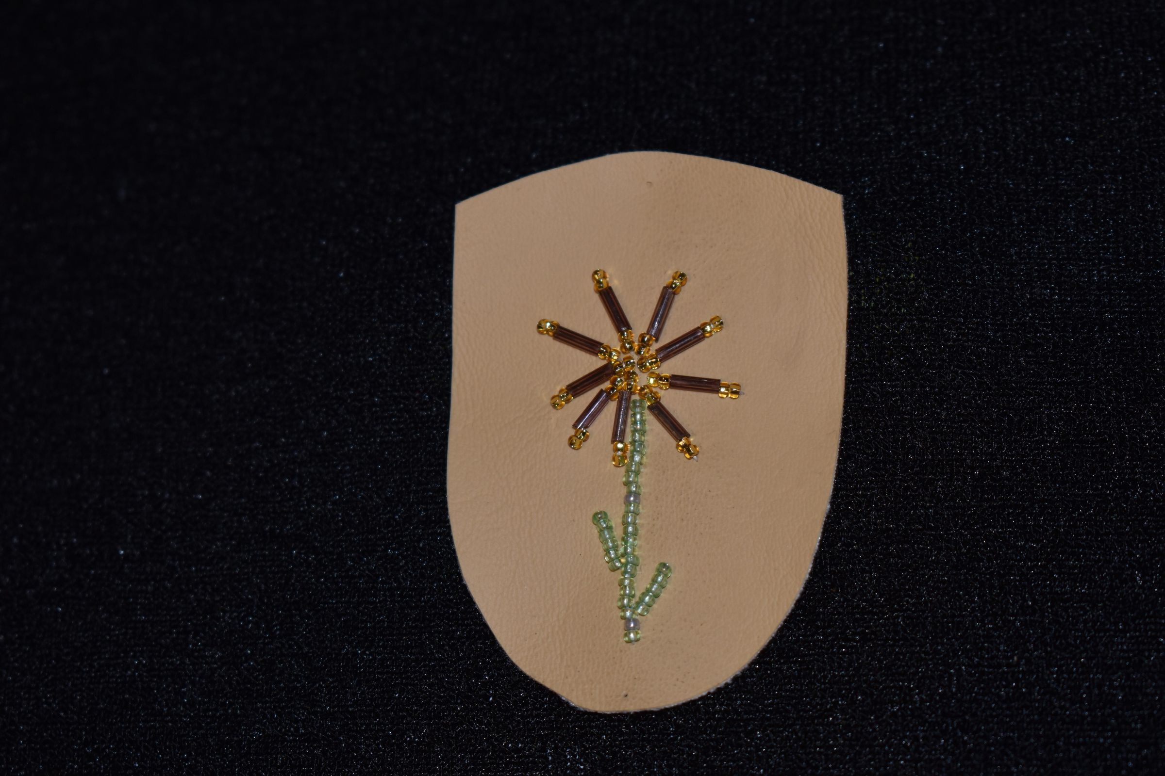 Purple glass bugle bead used for petals. Gold and green glass seed beads were used for the flower and leaves and stem. Beaded on vinyl.Cataloged By
