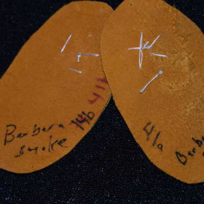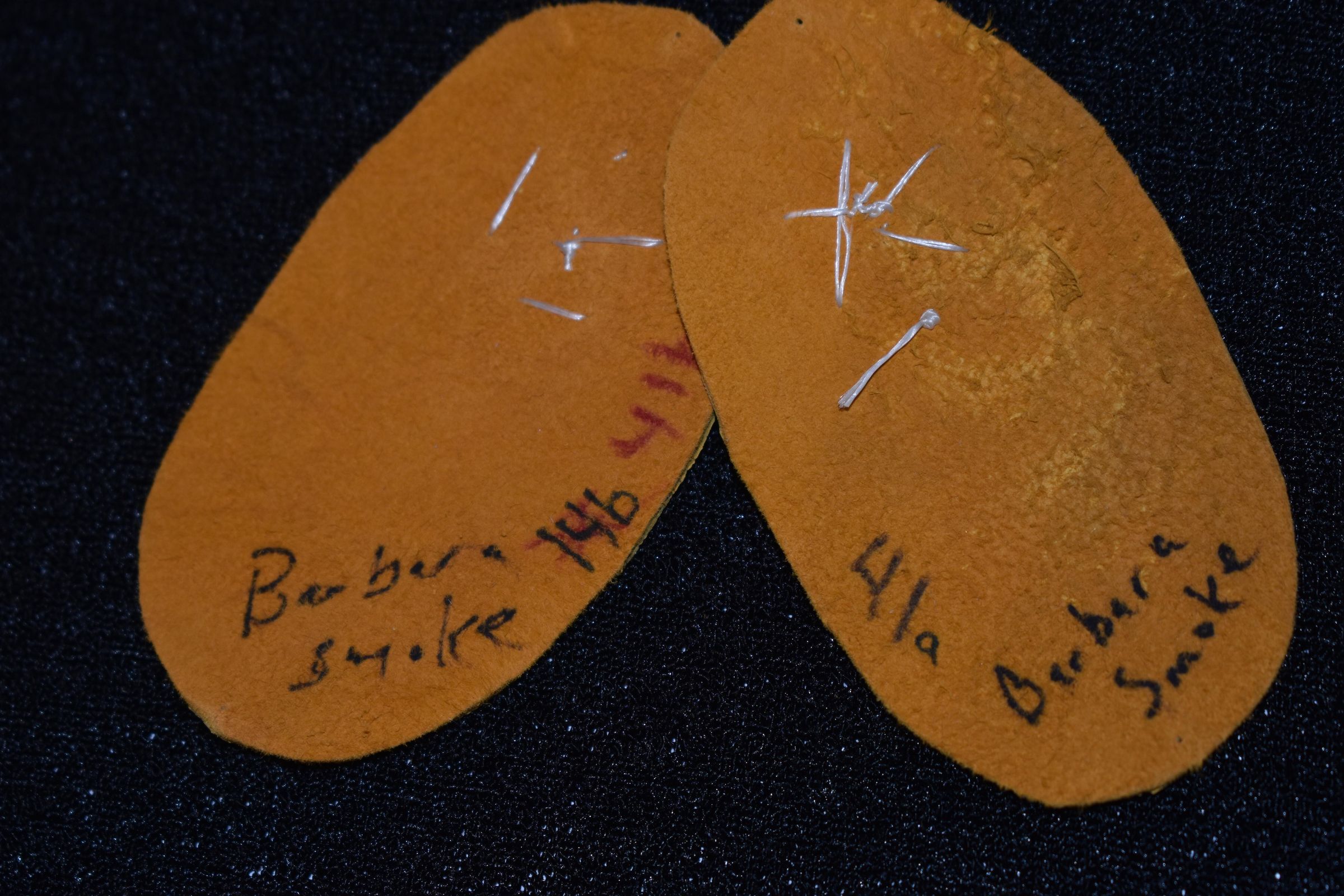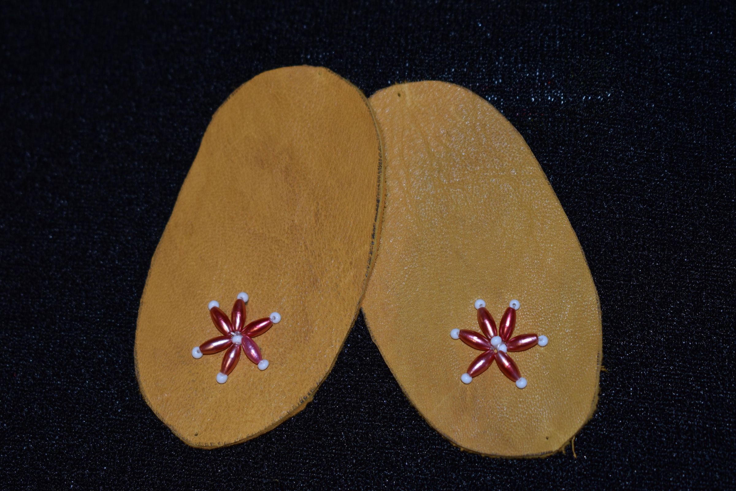 Vamps donated by Barbara Smoke. Pink rice beads and white glass seed beads were used on leather.