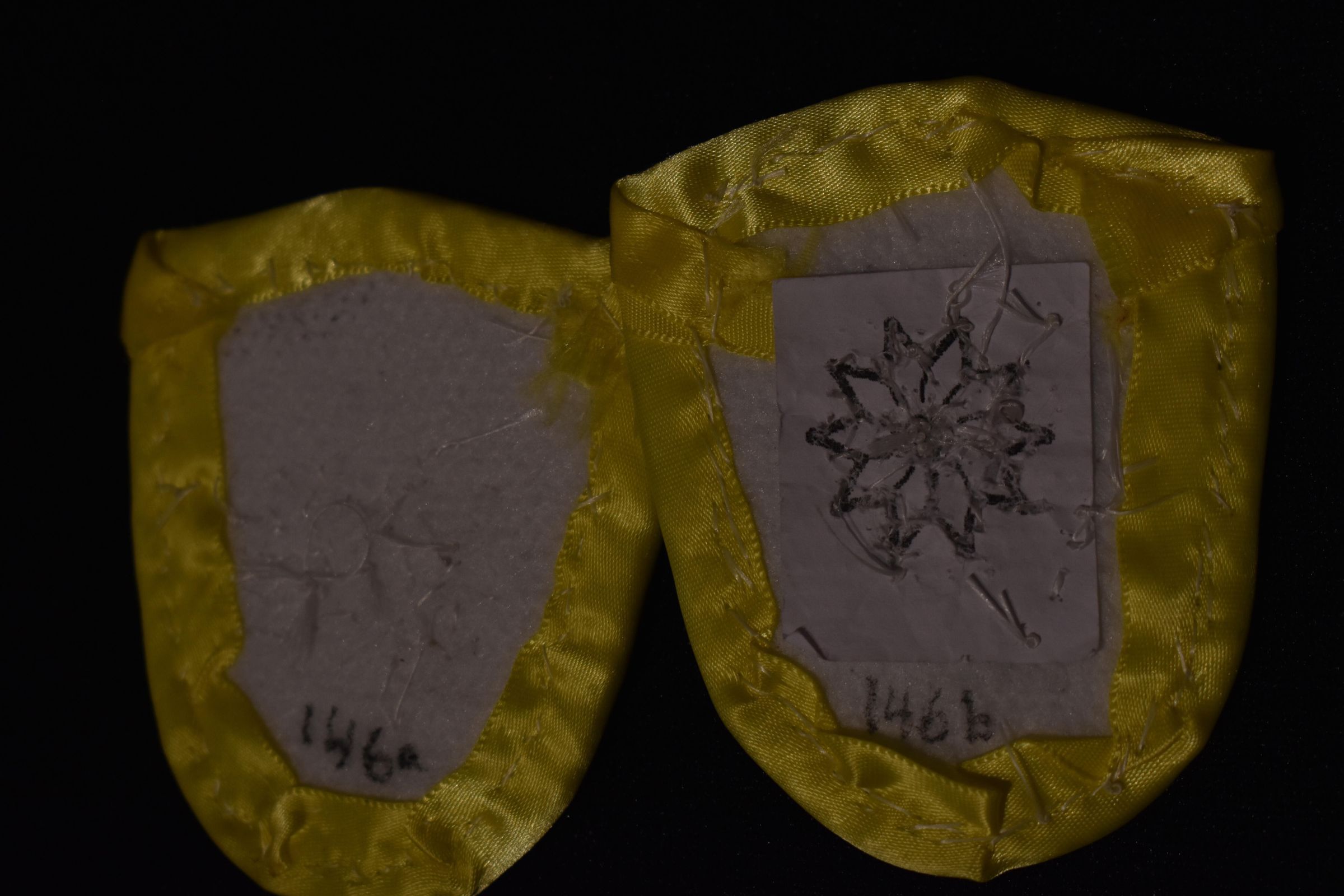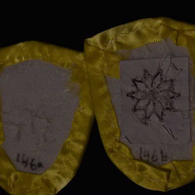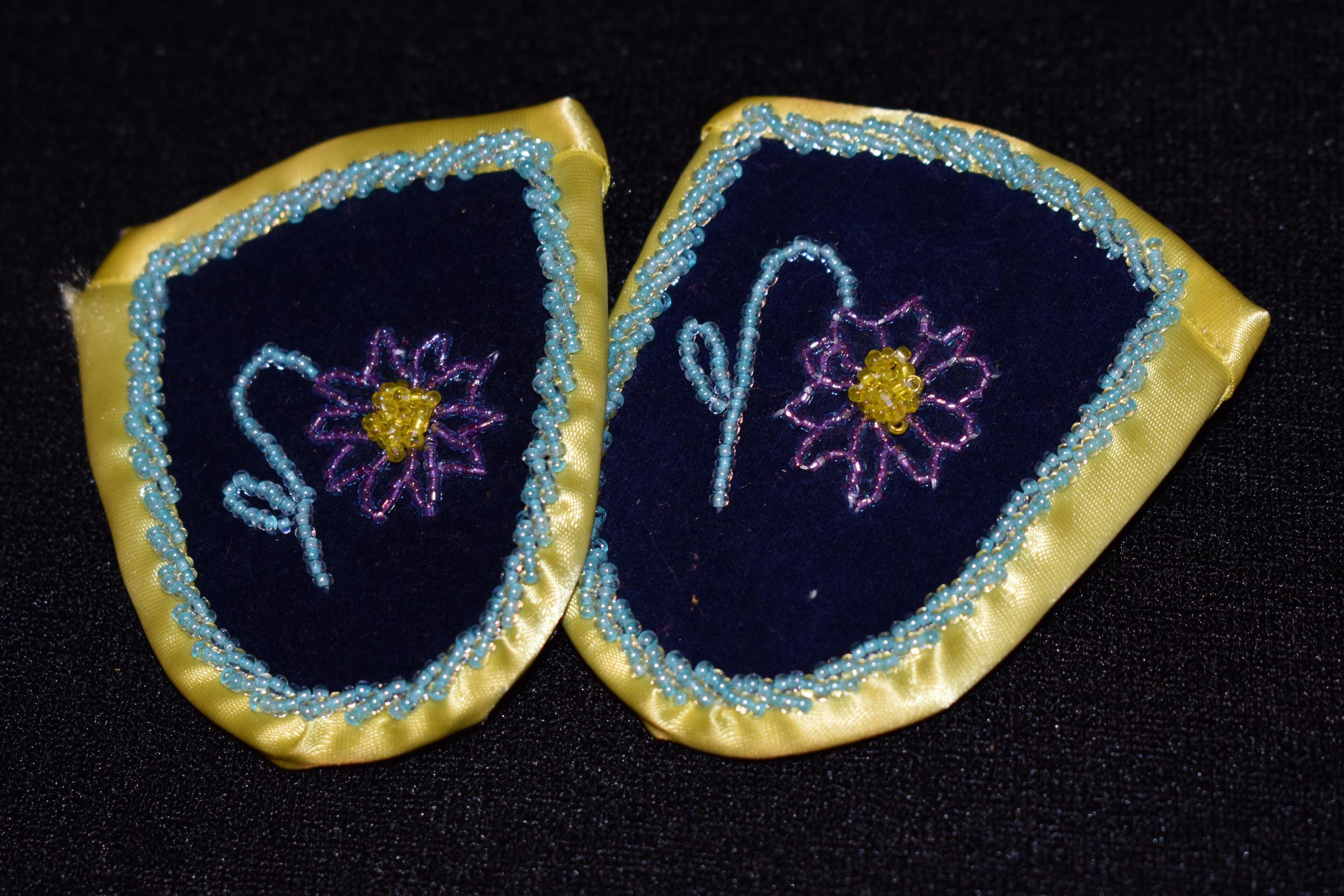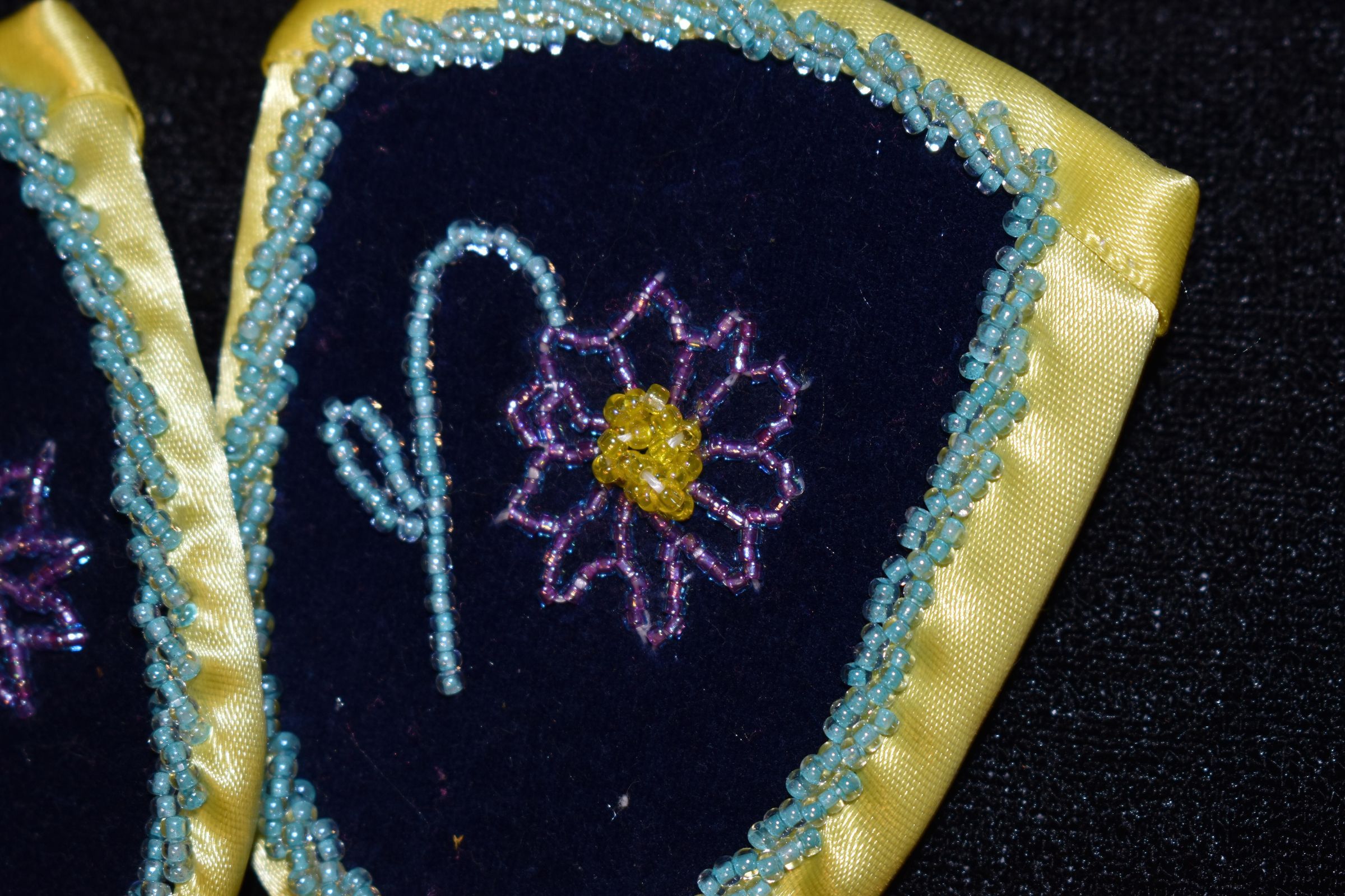 Yellow, purple, and blue glass seed beads on pellon and velveteen. Edged with ribbon.Cataloged By