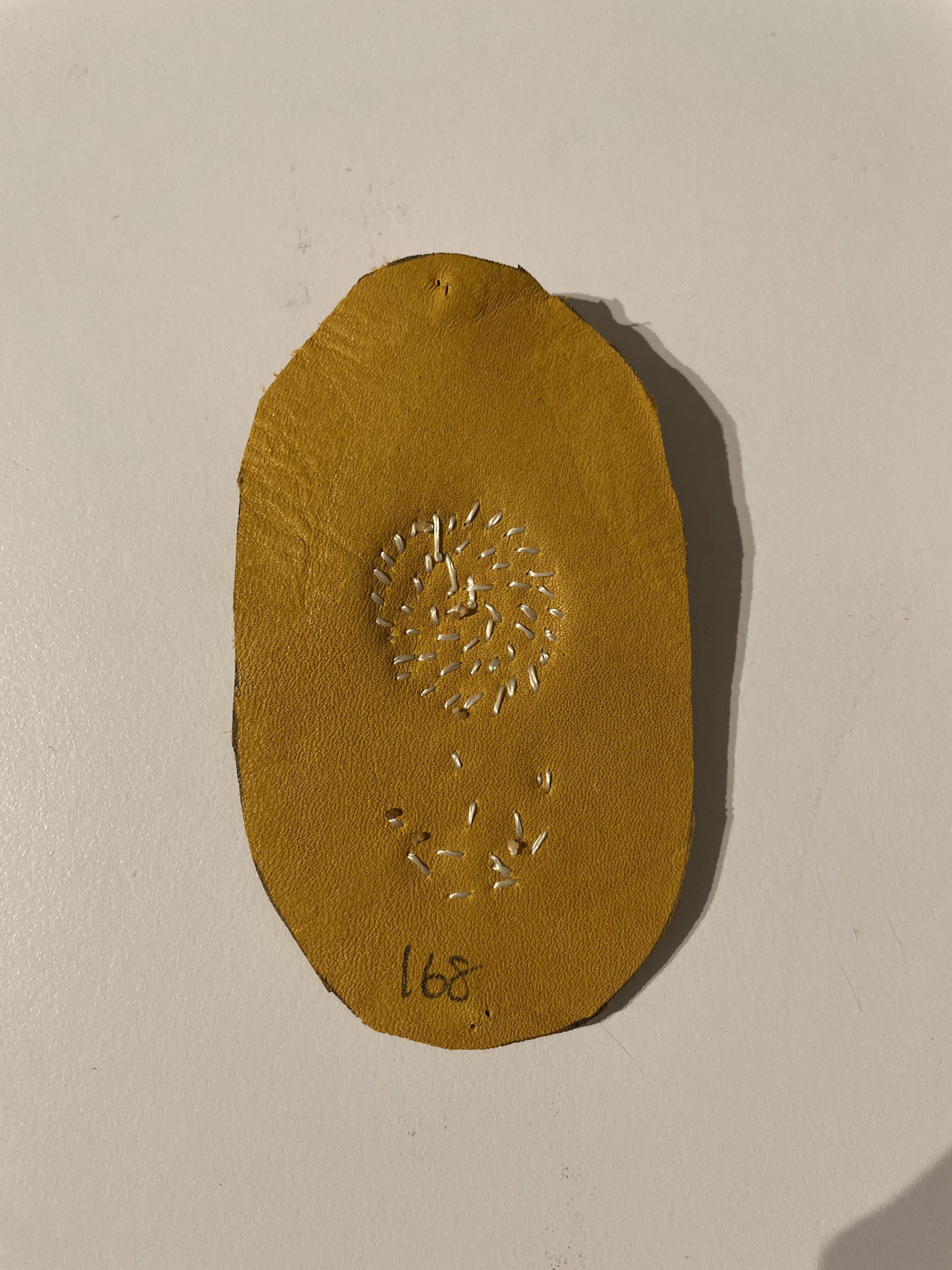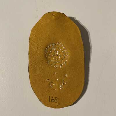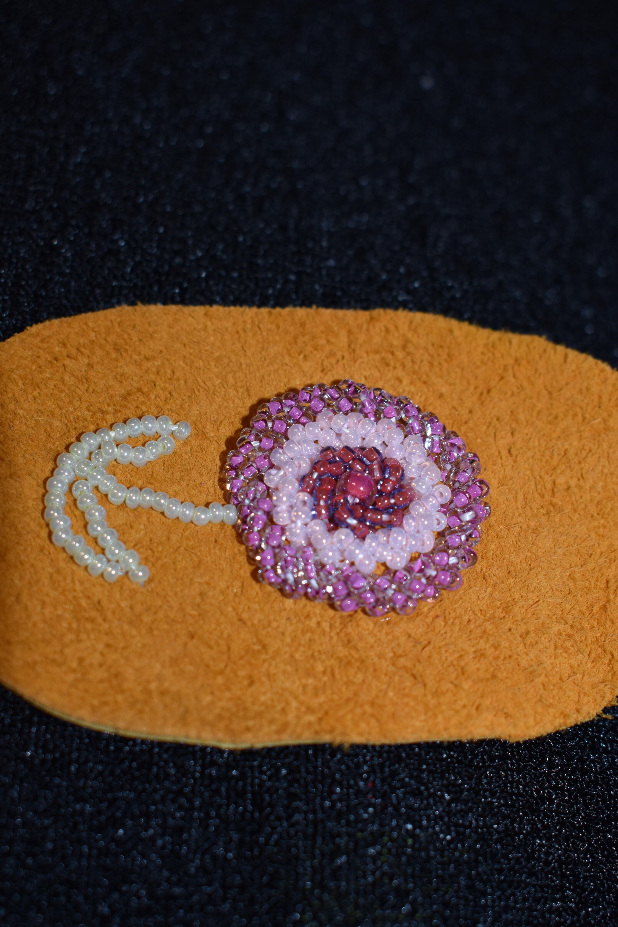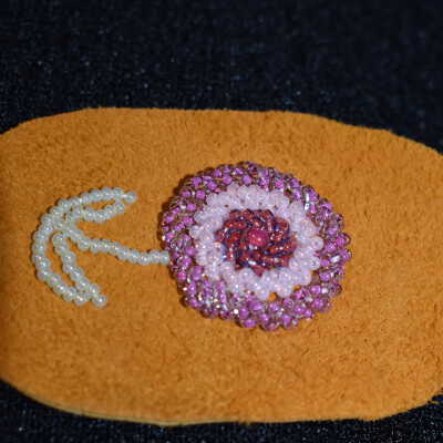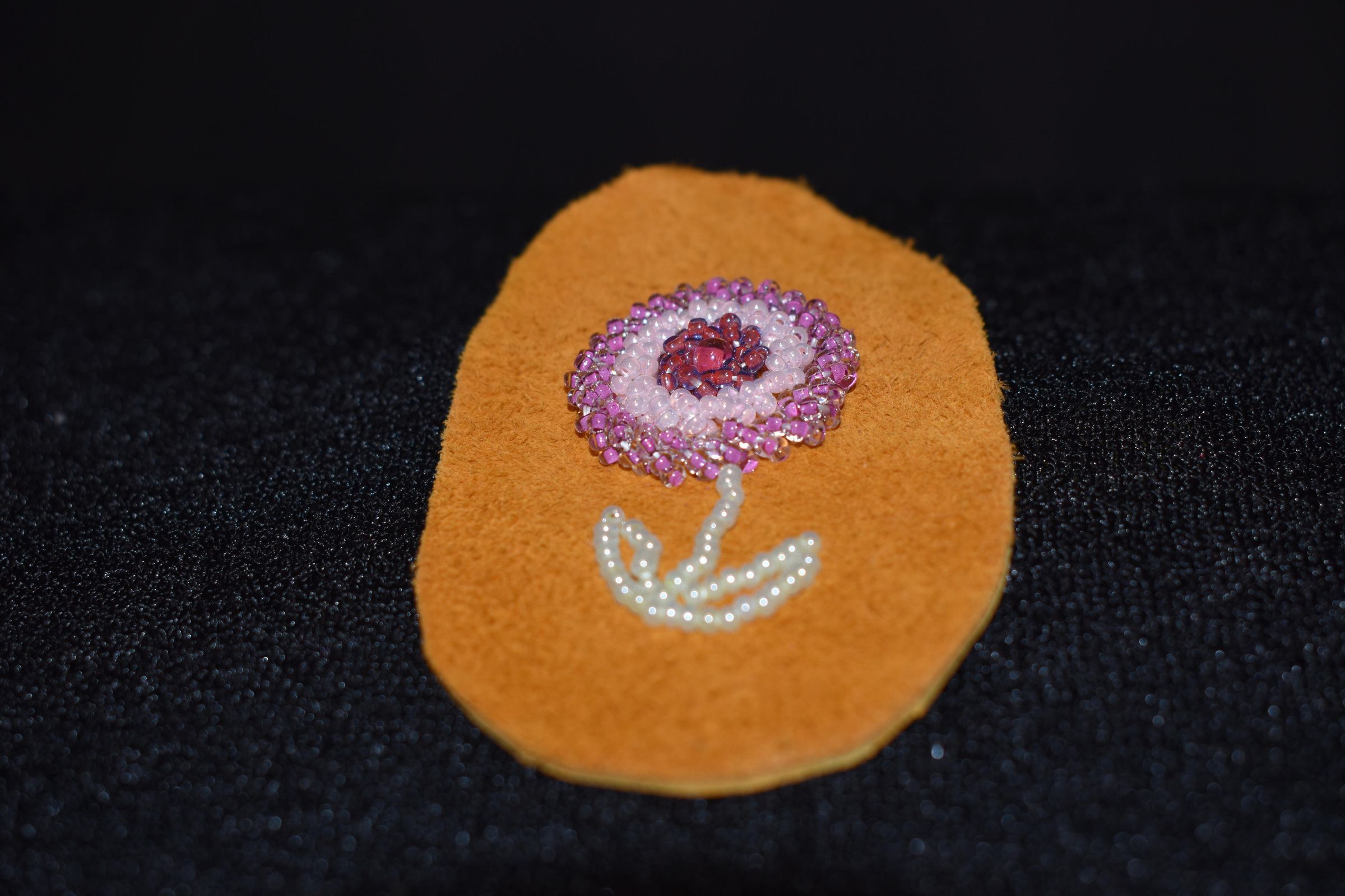 large pink glass bead for the flower centre, pink glass seed beads for the petals. green glass seed beads were used for the stem and leaves. Beaded on leather.Cataloged By