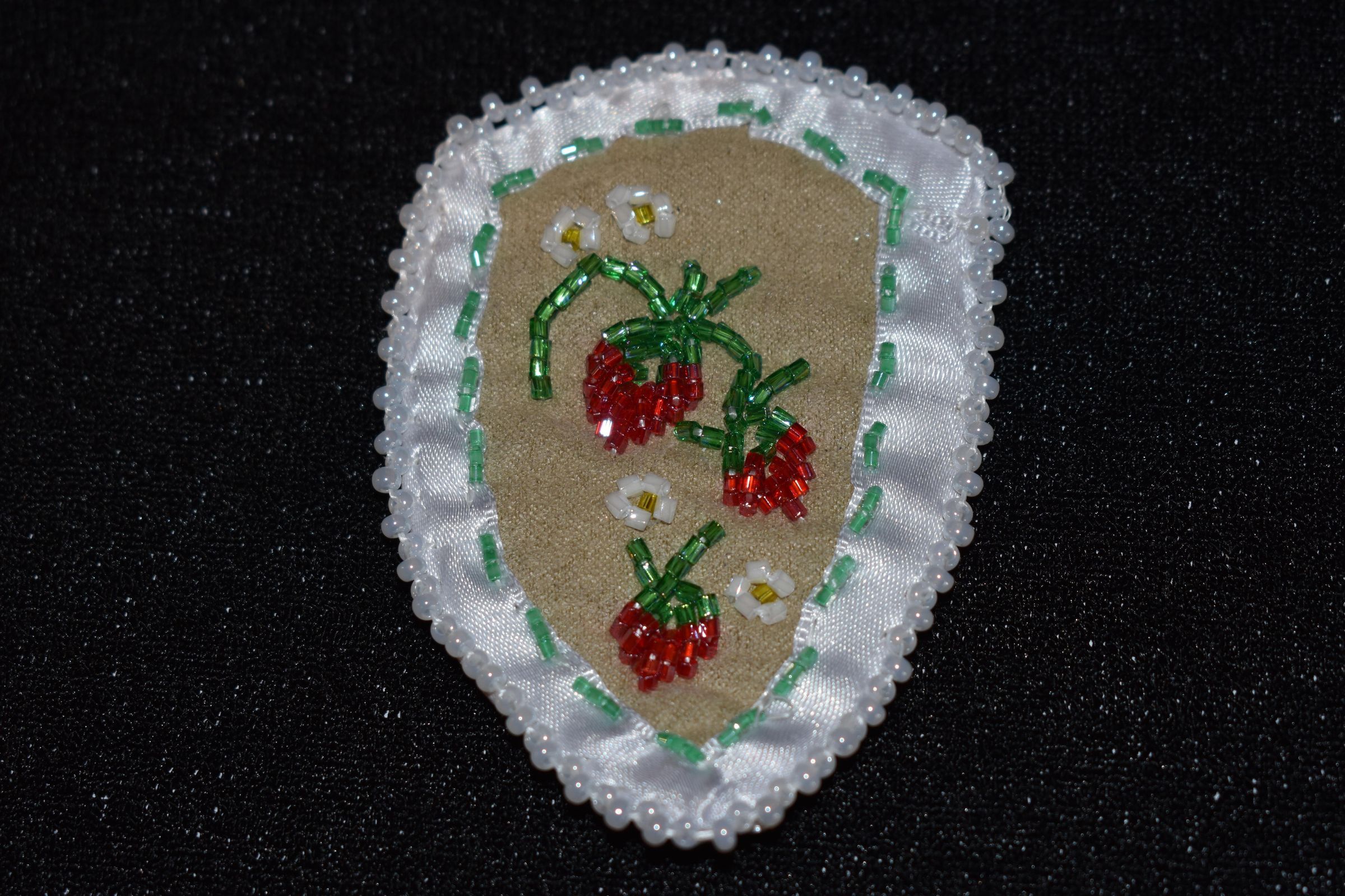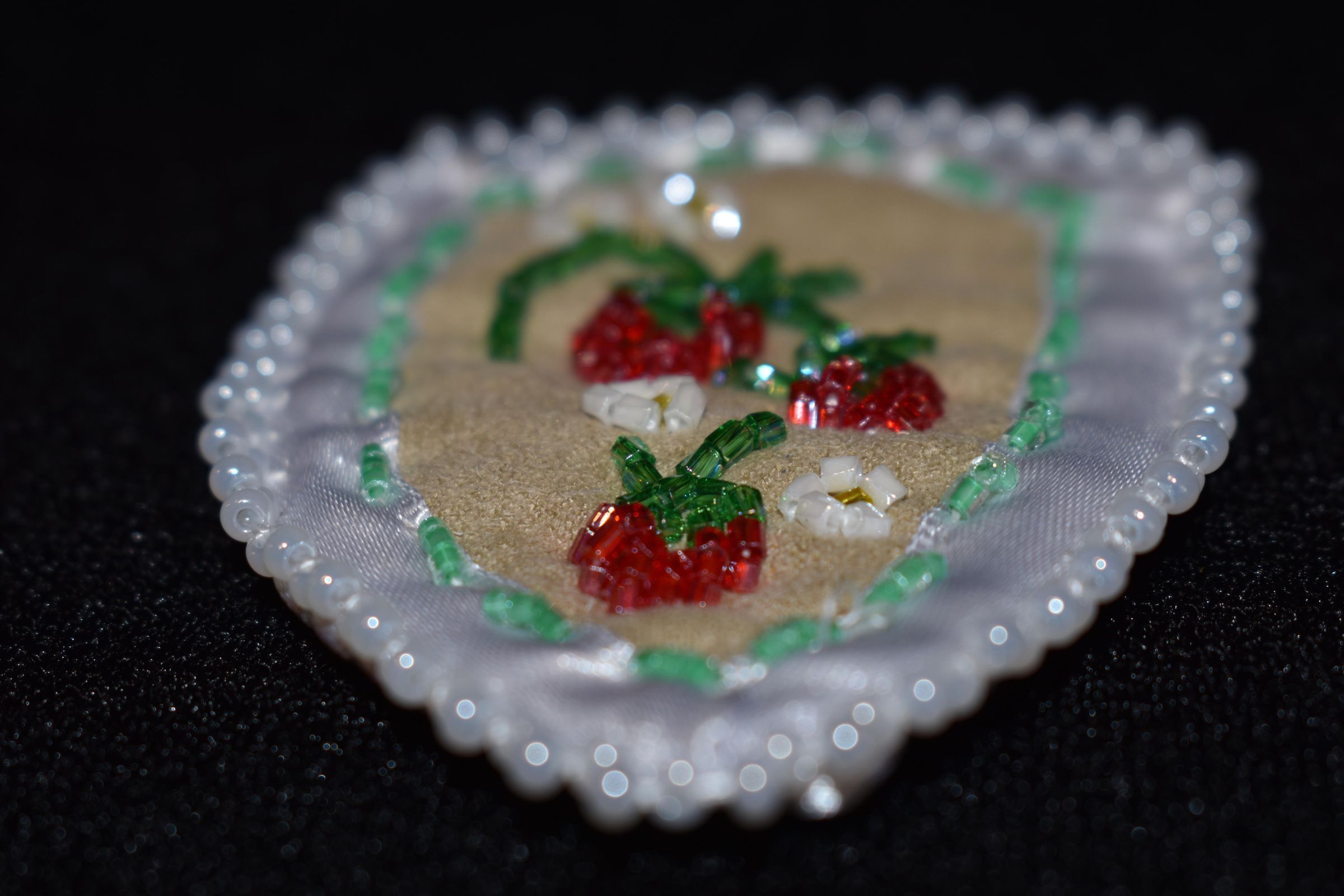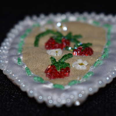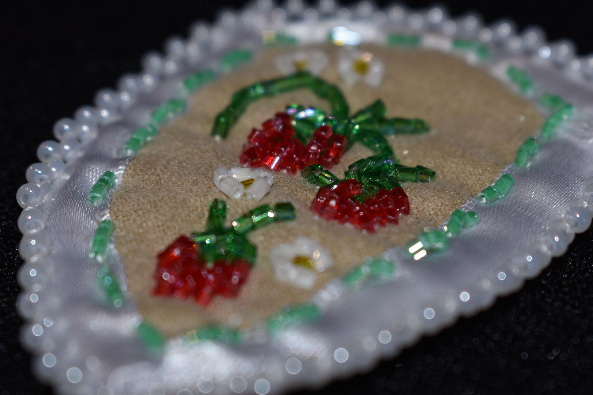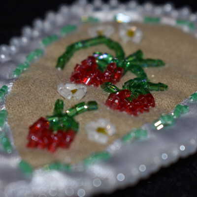 Red, green, white, and yellow glass two cuts. White glass seed beads. Beaded on pellon and faux suede, with white ribbons on the edge.Cataloged By