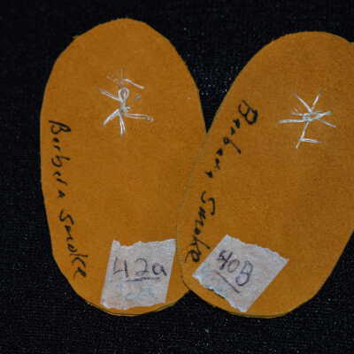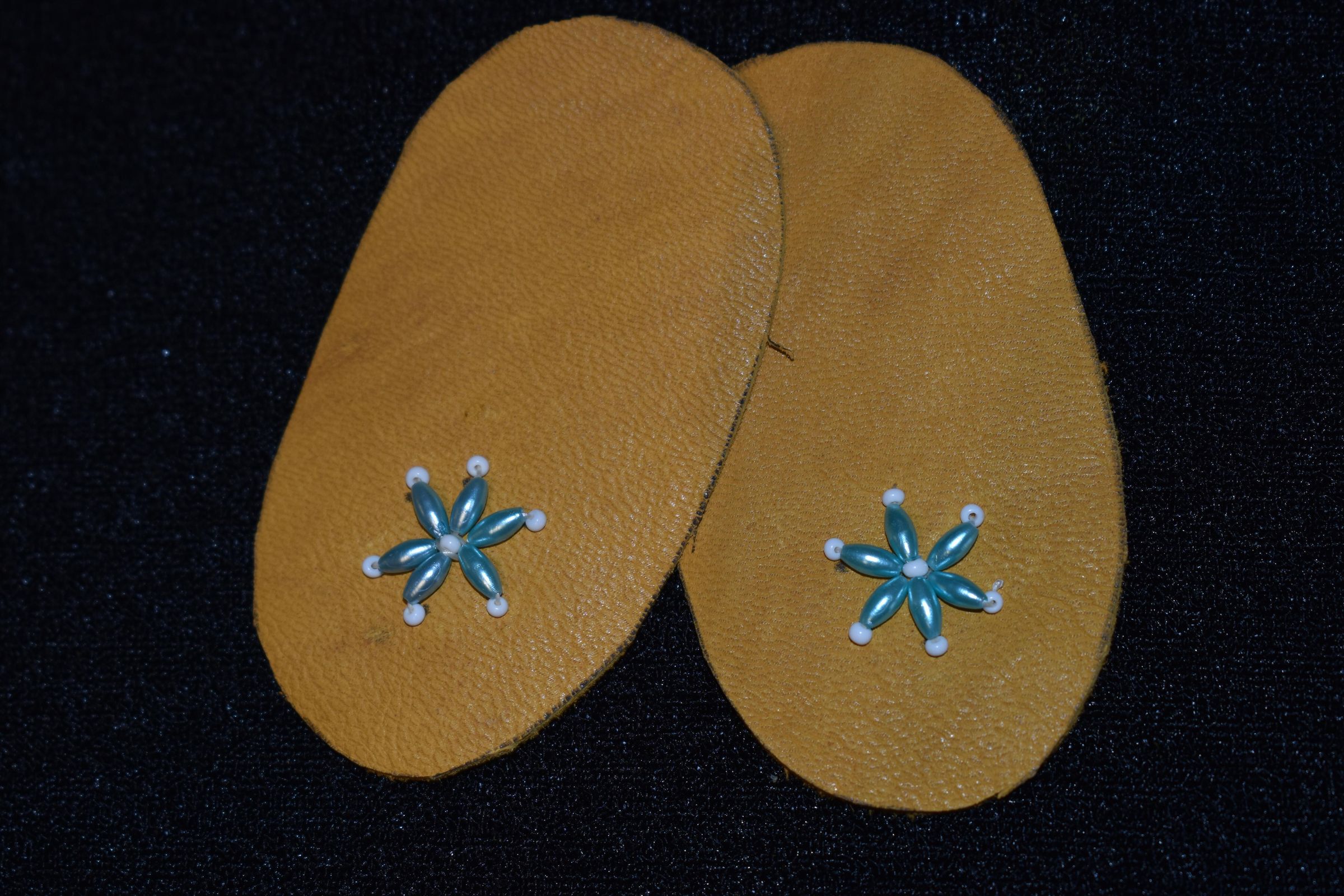 Vamps donated by Barbara Smoke. Blue rice beads and white glass seed beads were used on leather.