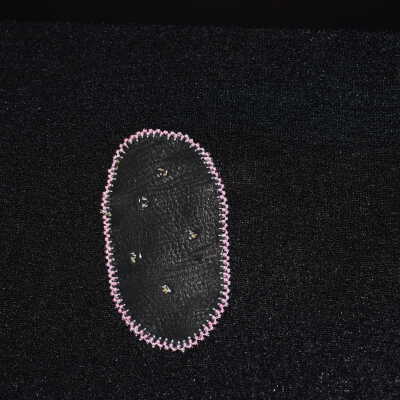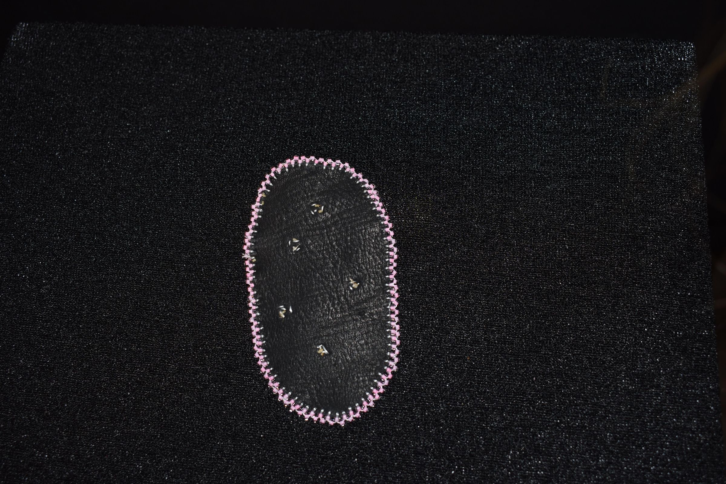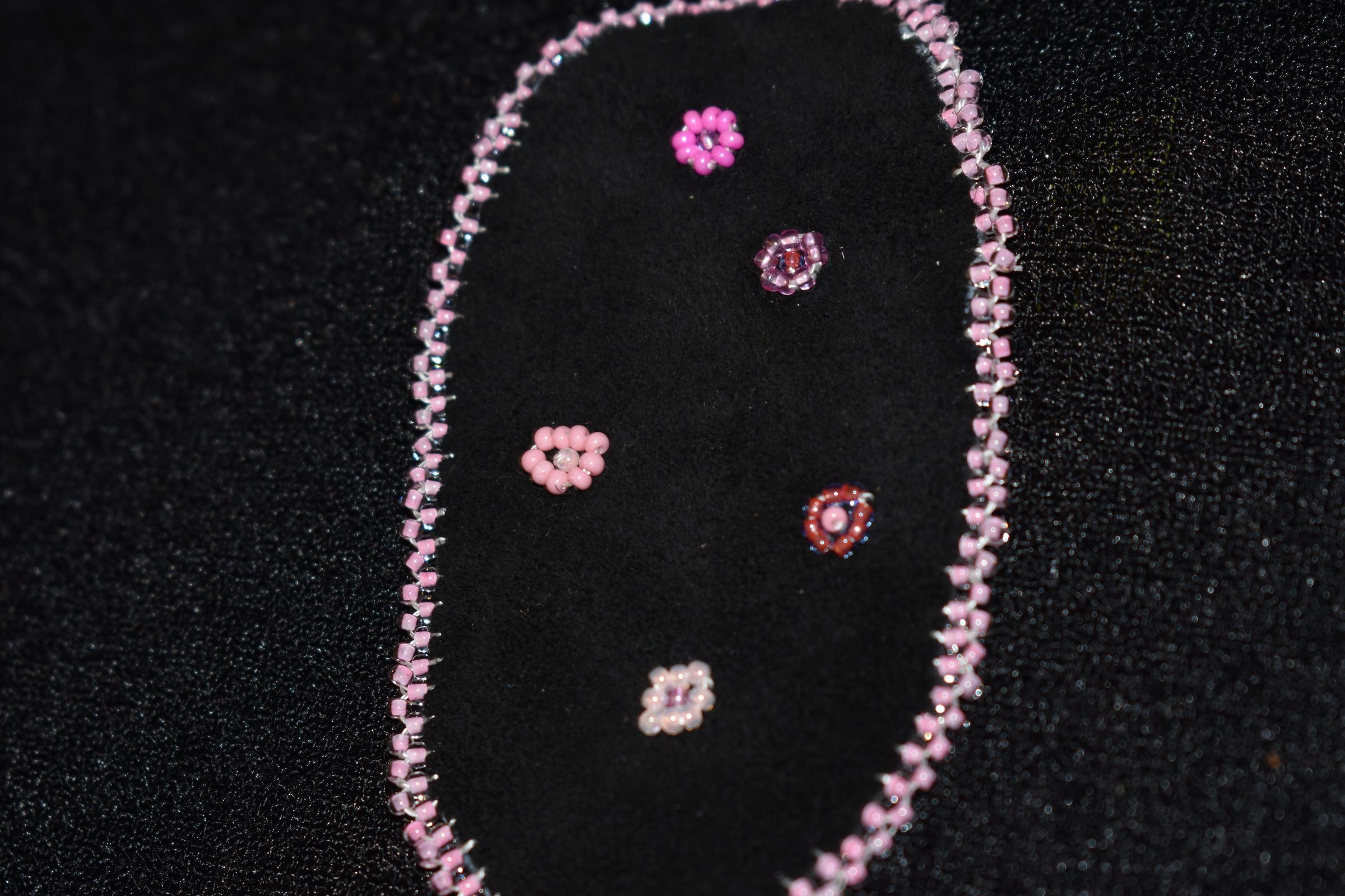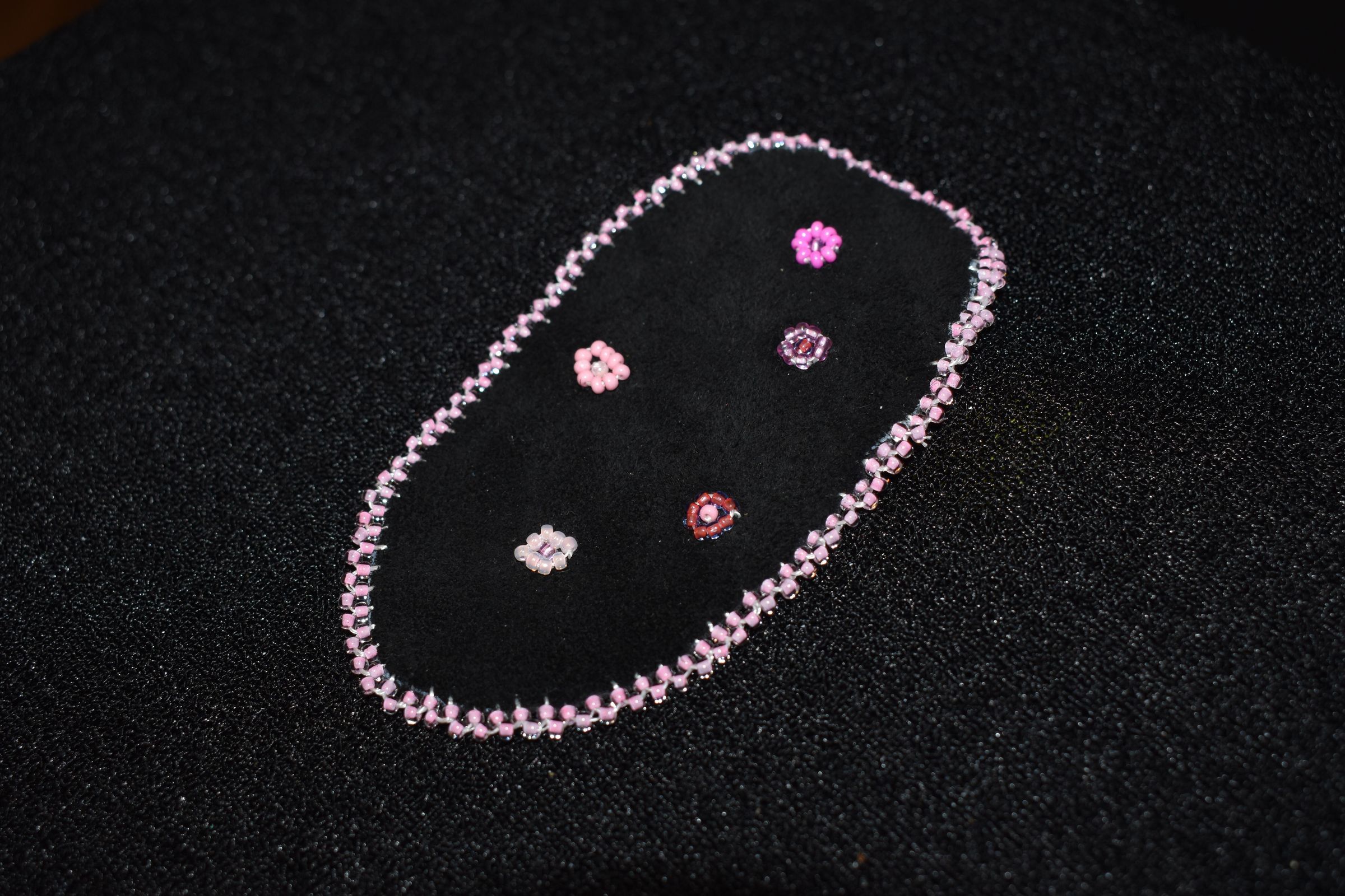 pink glass seed beads were used for the flowers and edging, beaded on leather.Cataloged By
