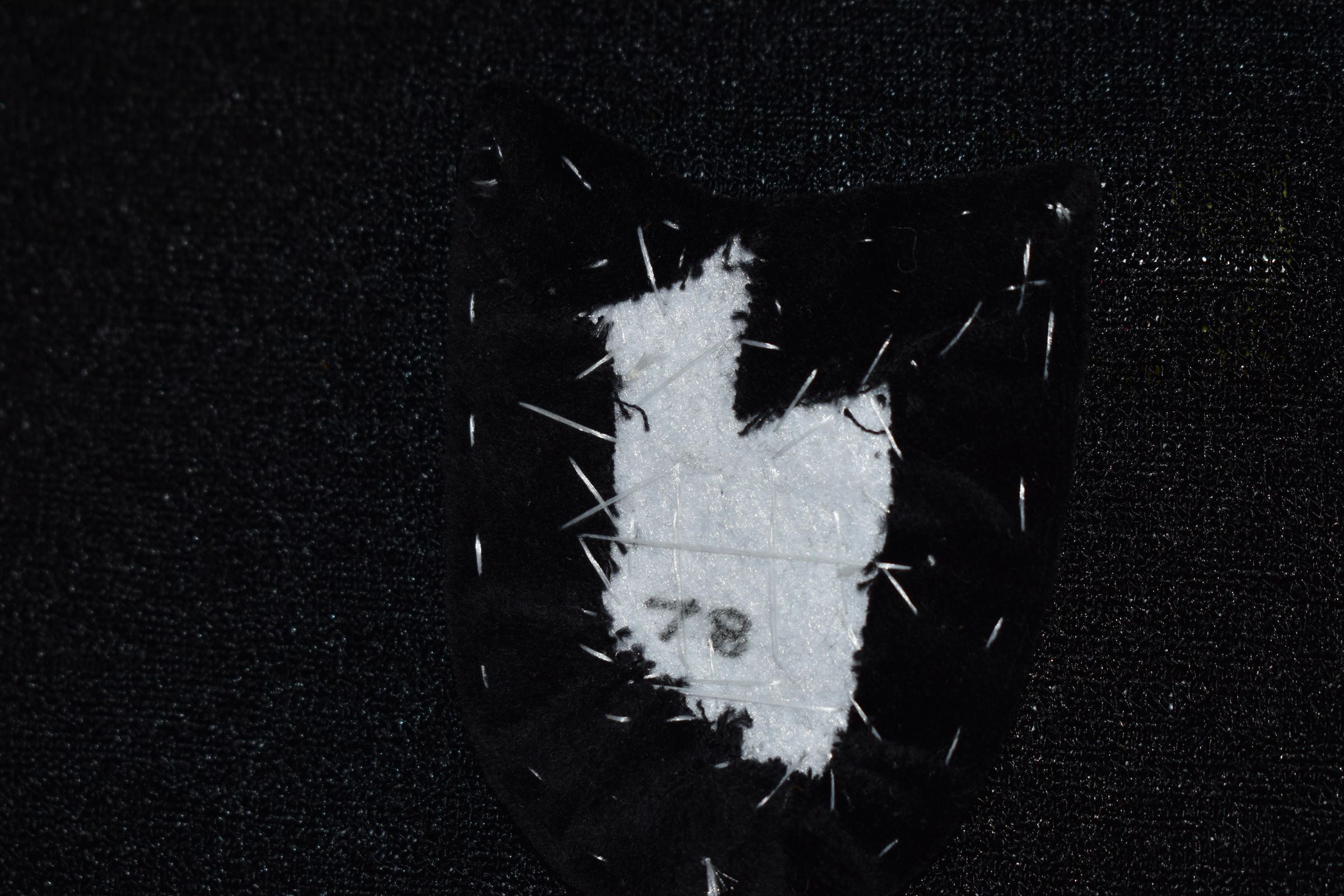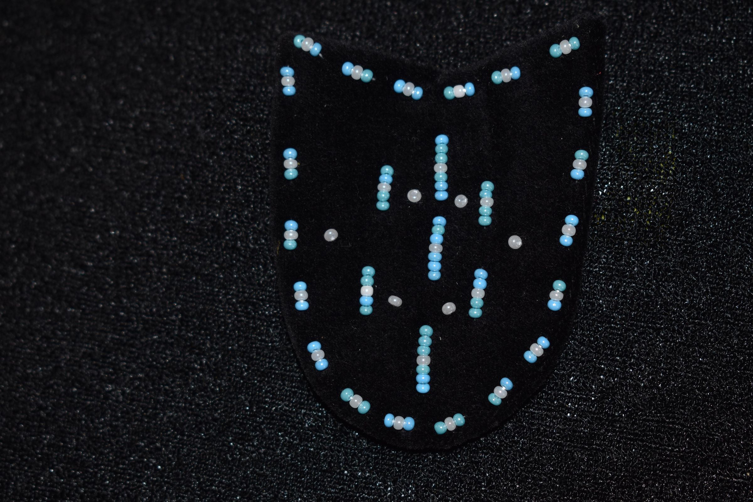 Vamp donated by Jackie Cree. Blue and white glass seed beads on pellon and faux suede.