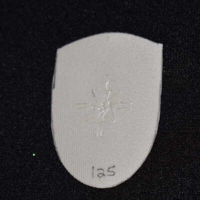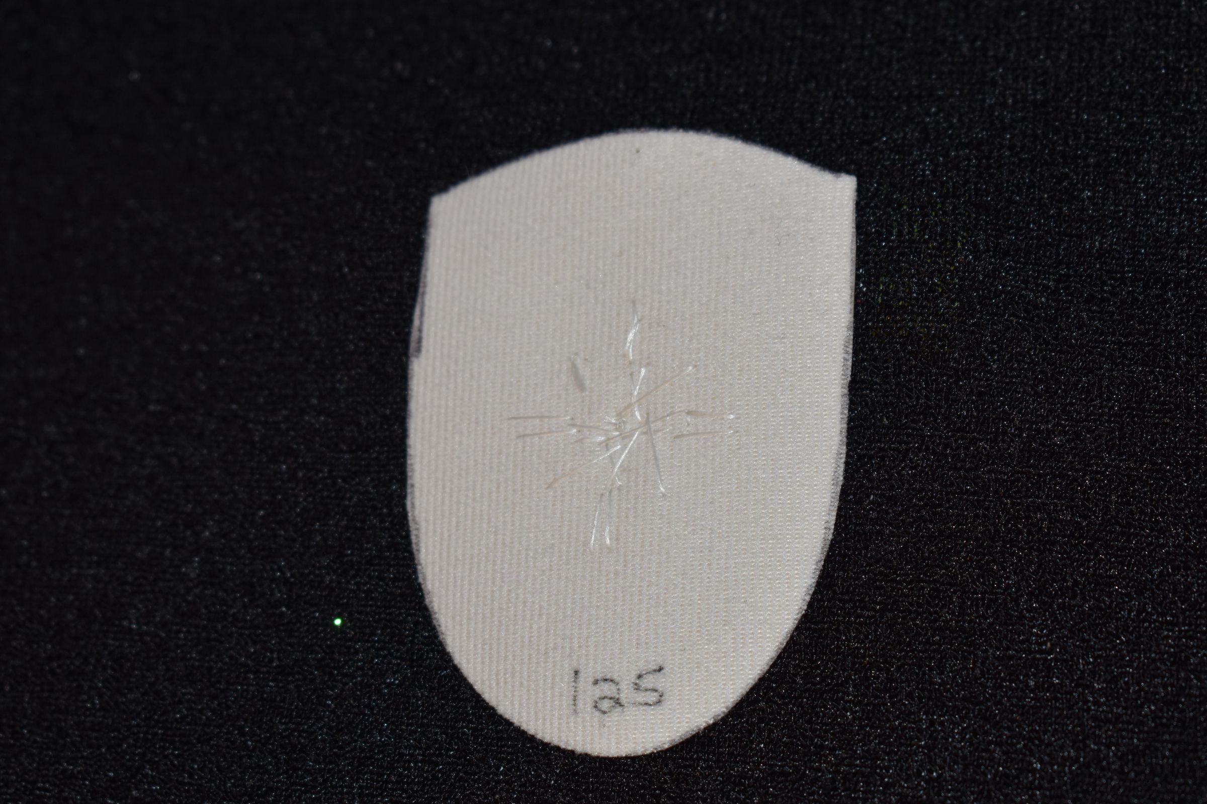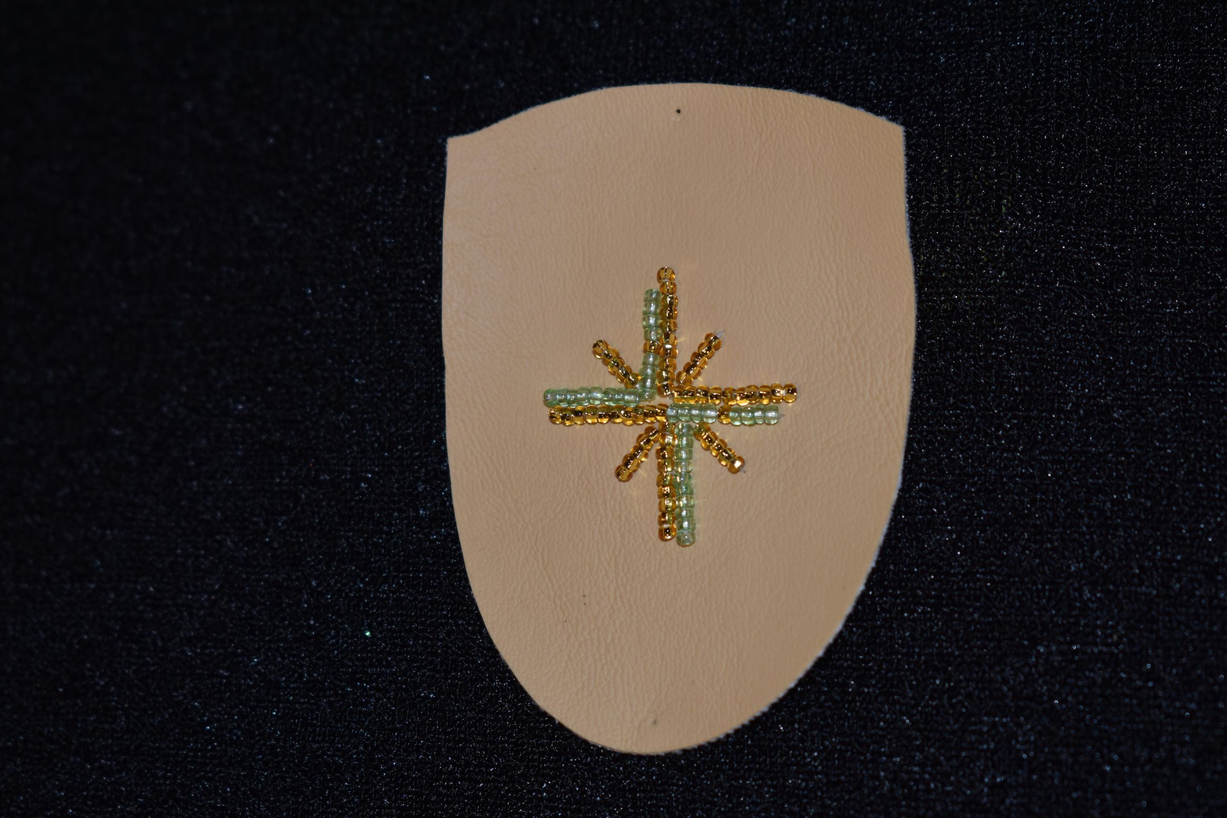 Vamp donated by Jackie Cree. Gold and teal glass seed beads on vinyl.
