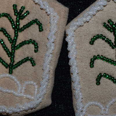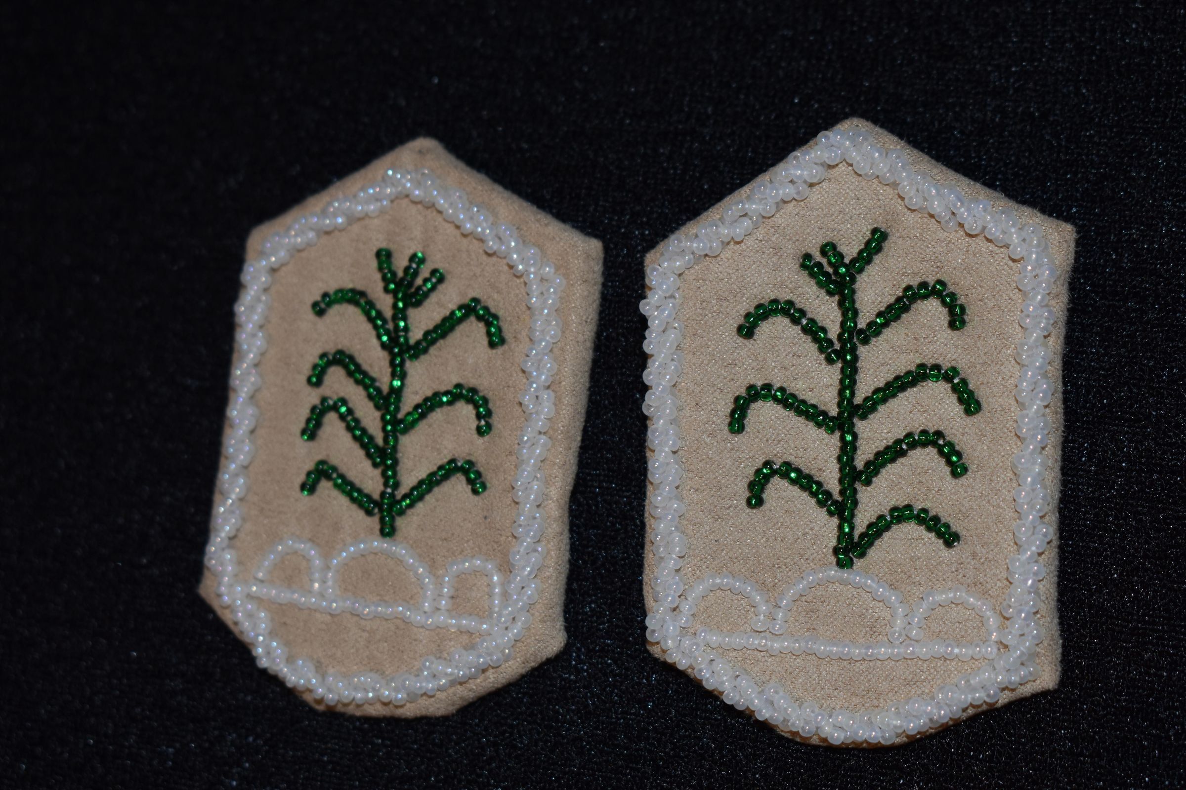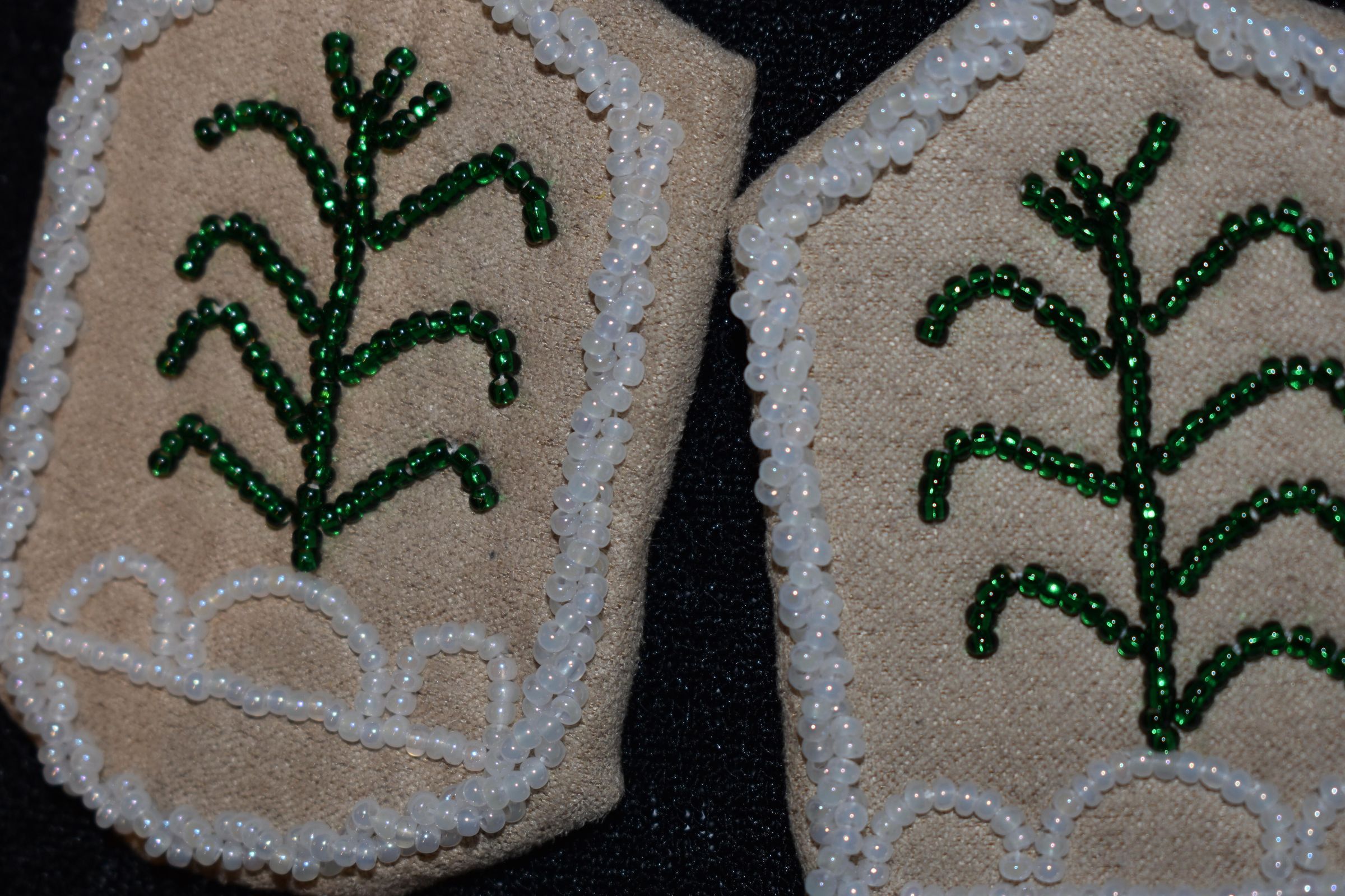 green glass seed beads were used for the corn stalks. White glass seed beads were used along the edge and under the corn. Beaded on pellon and faux suede.Cataloged By