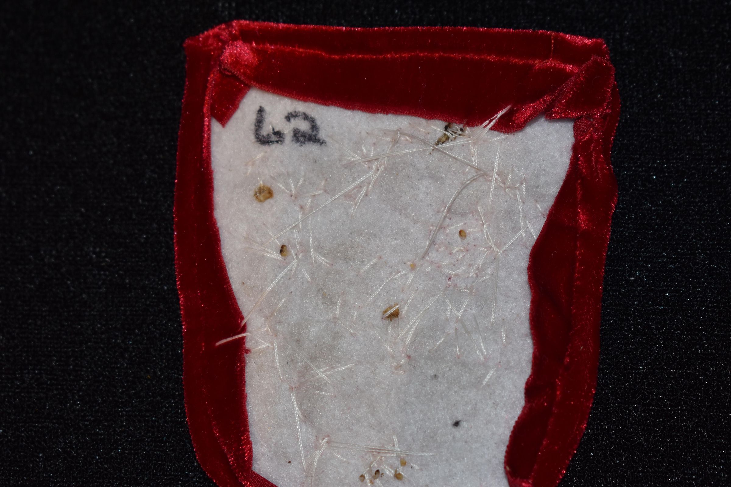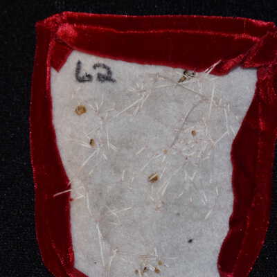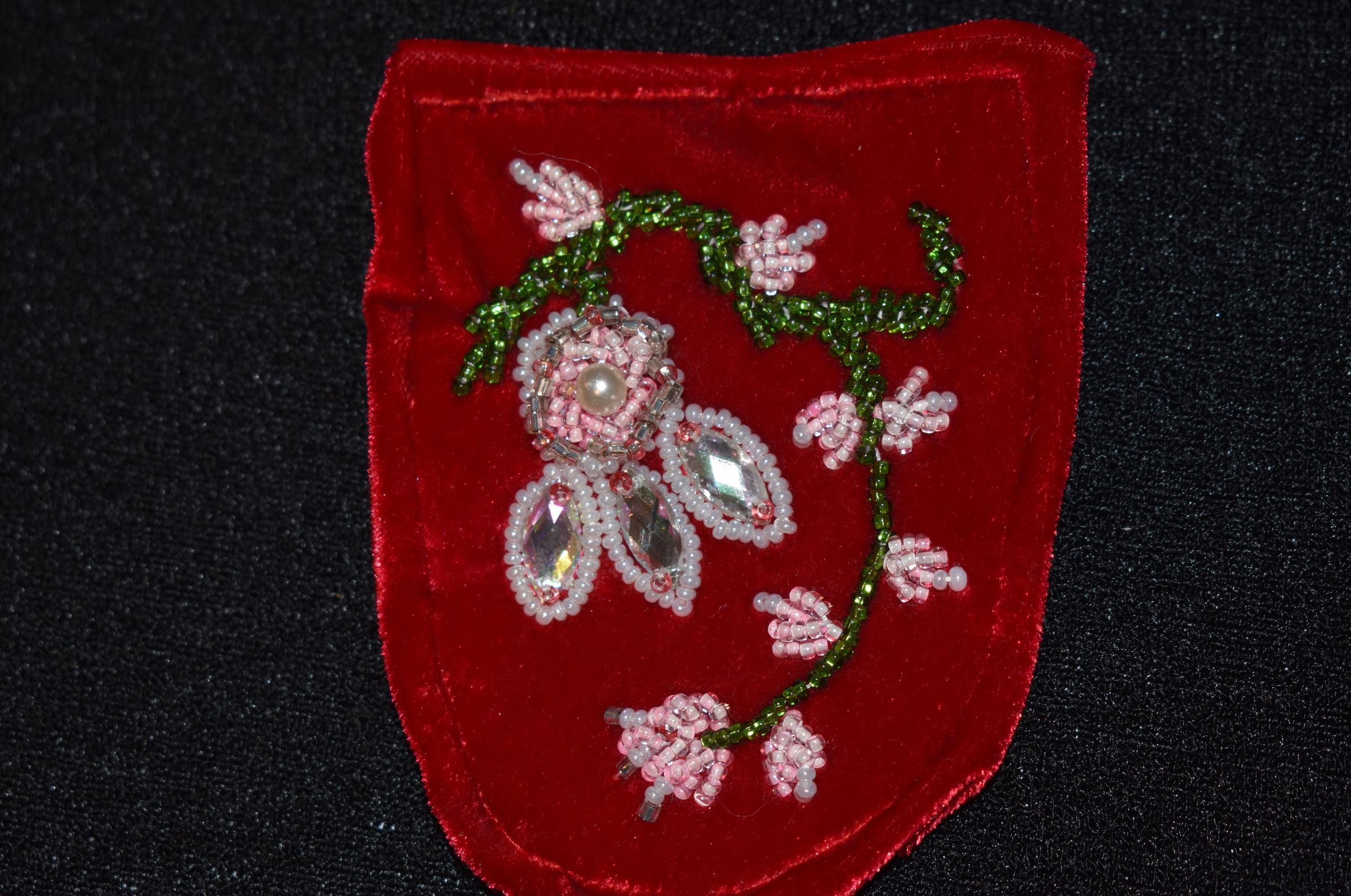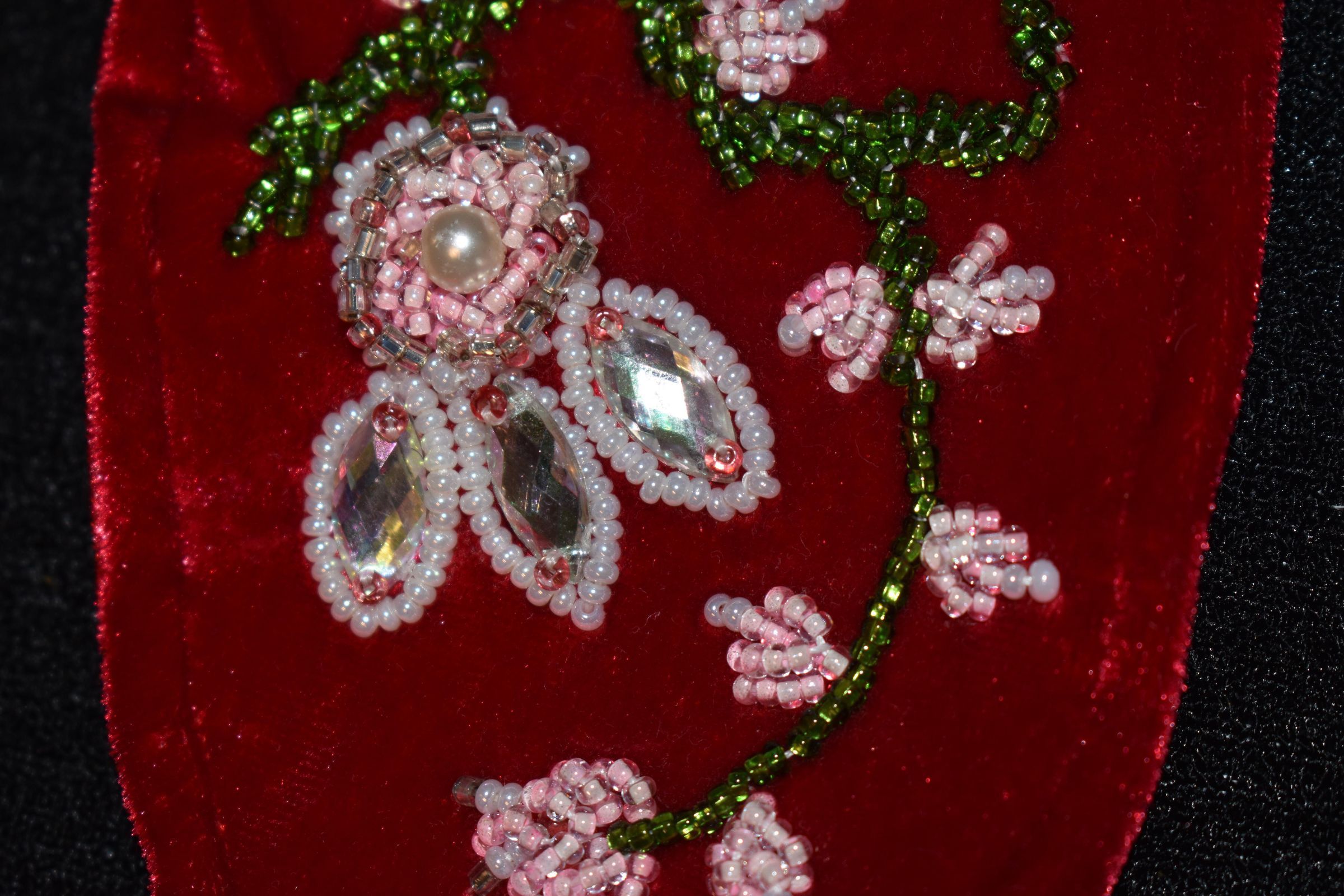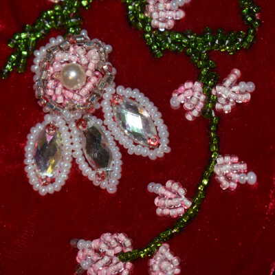 Jewel center for flowers. Pink, white, silver glass seed beads used for the petals. Green glass seed beads used for the vines. Pink glass seed beads used for leaves. Beaded on pellon and red velveteen.Cataloged By