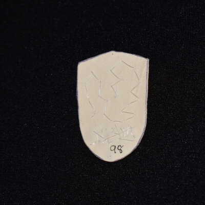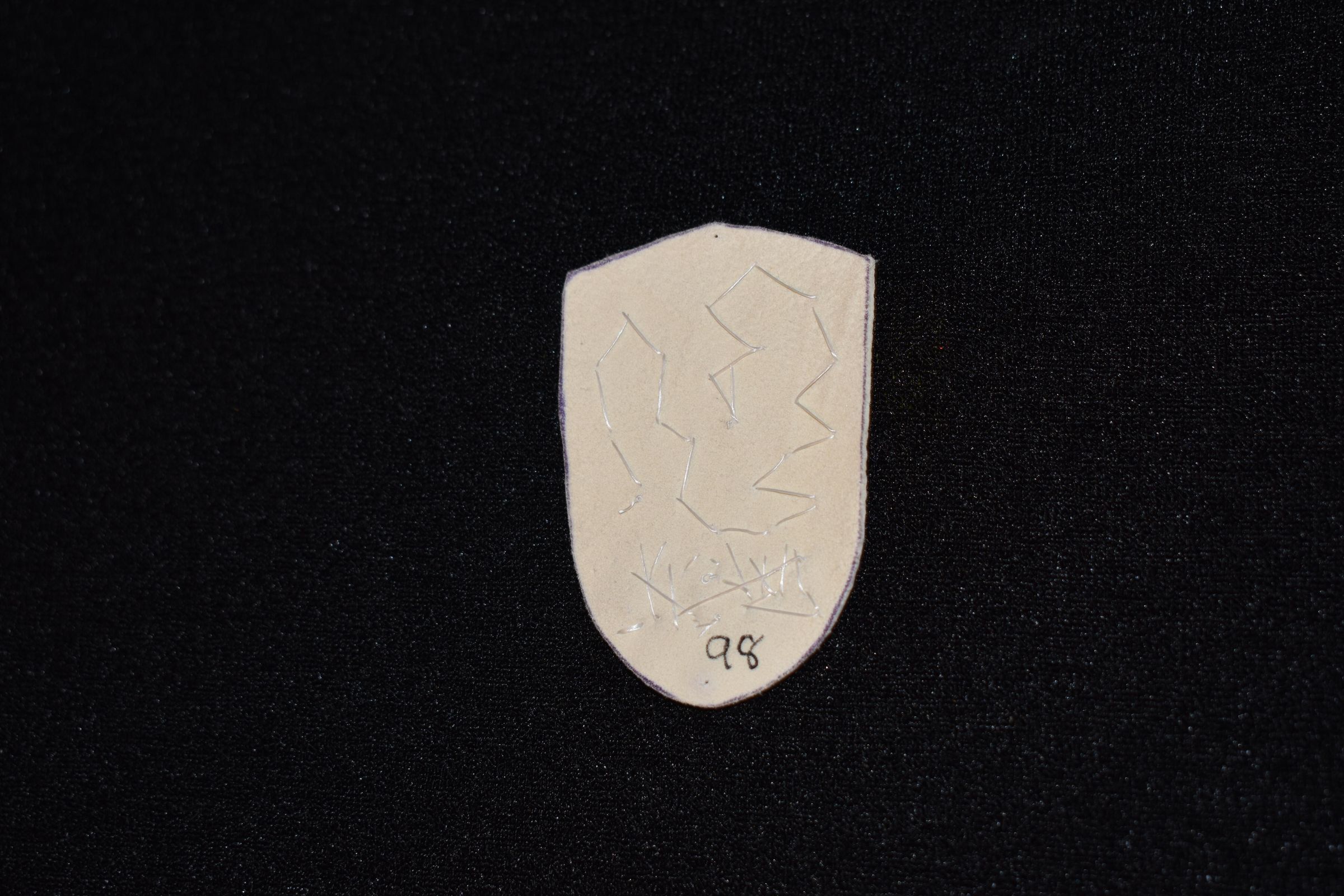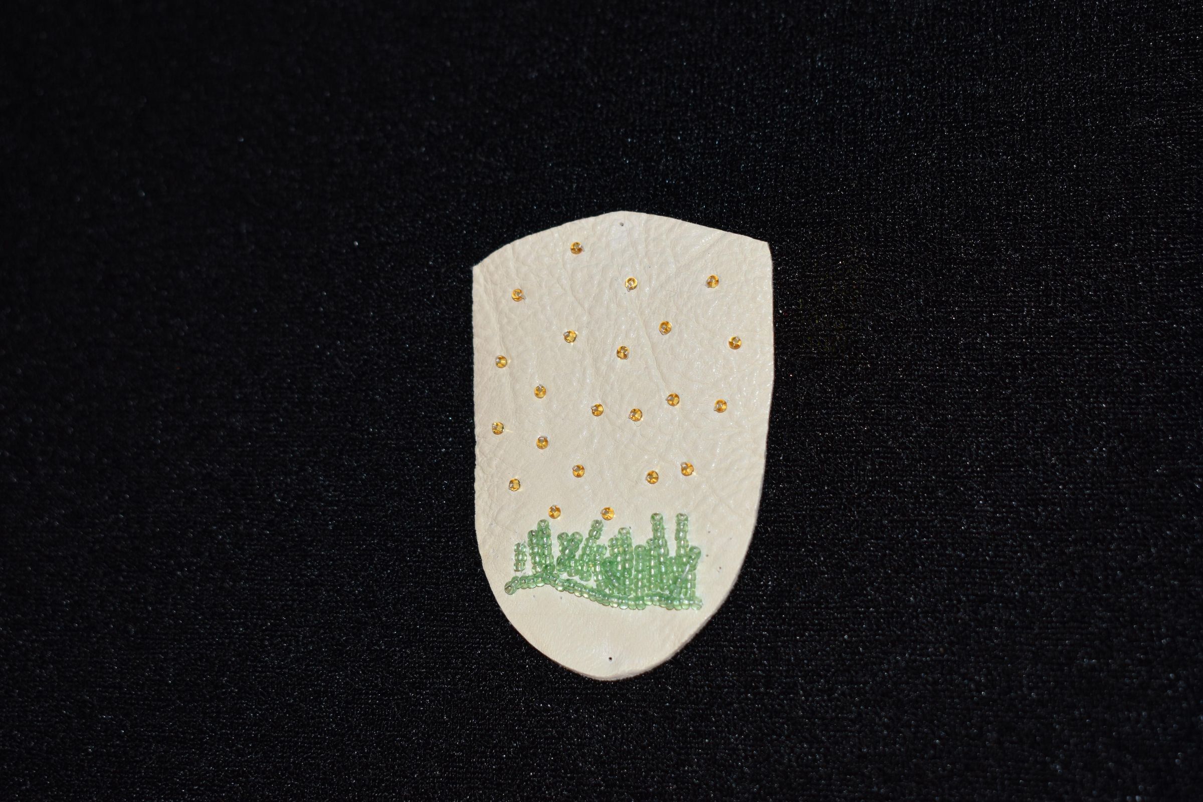 Vamp donated by Jackie Cree. Green and gold glass seed beads on leather.