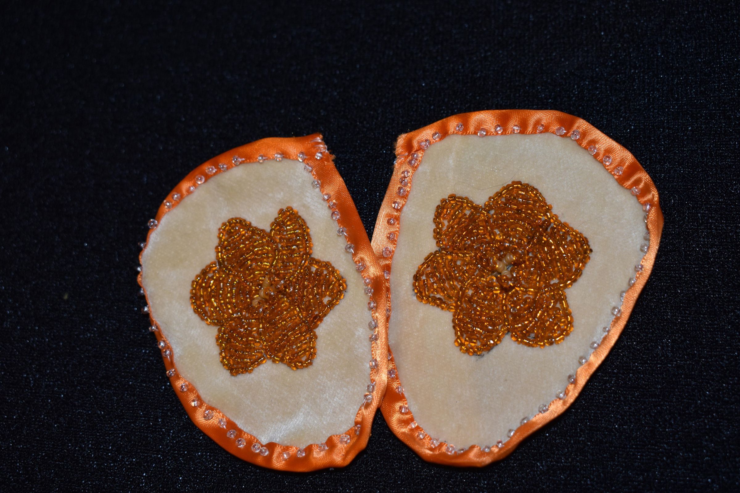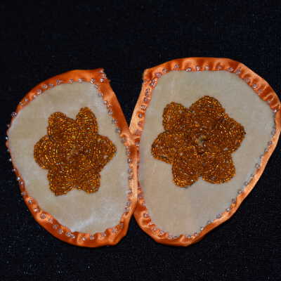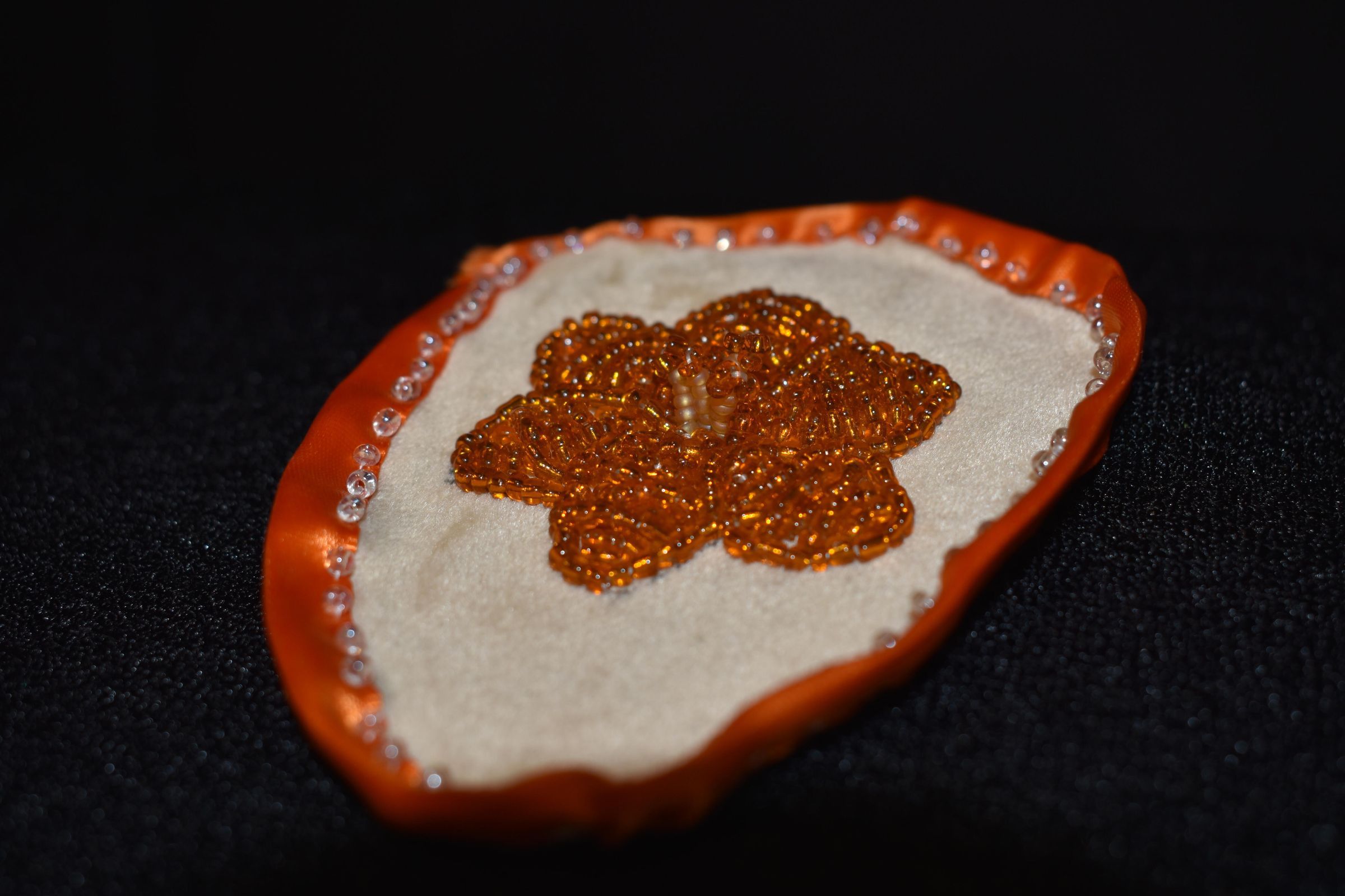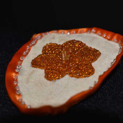 Orange and clear glass seed beads on pellon and velveteen, ribbon edging.Cataloged By