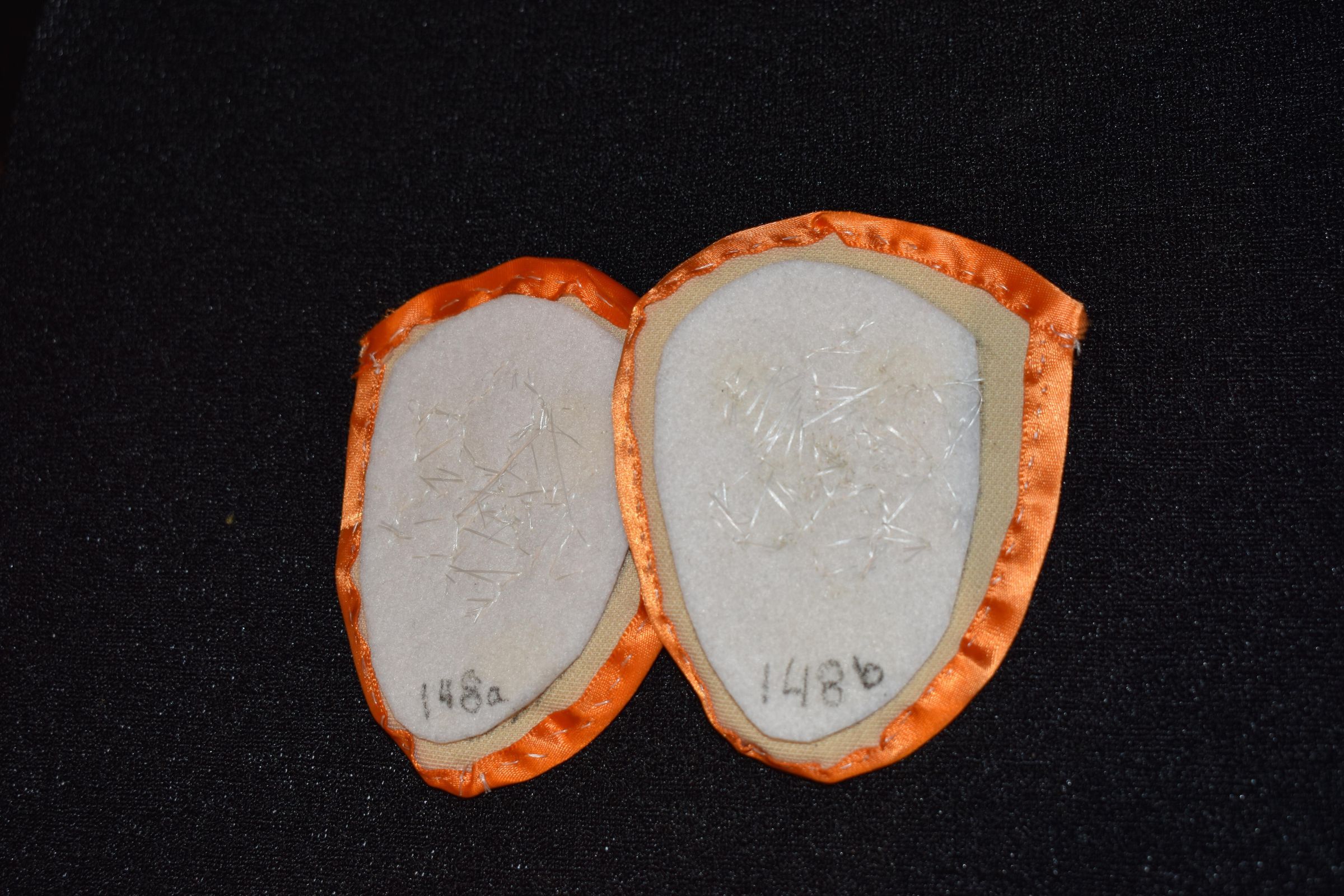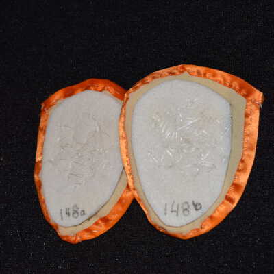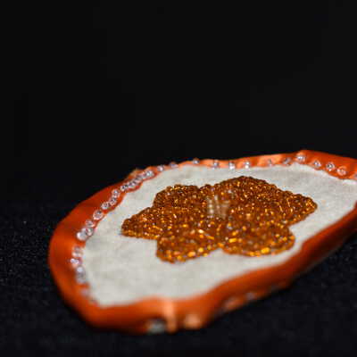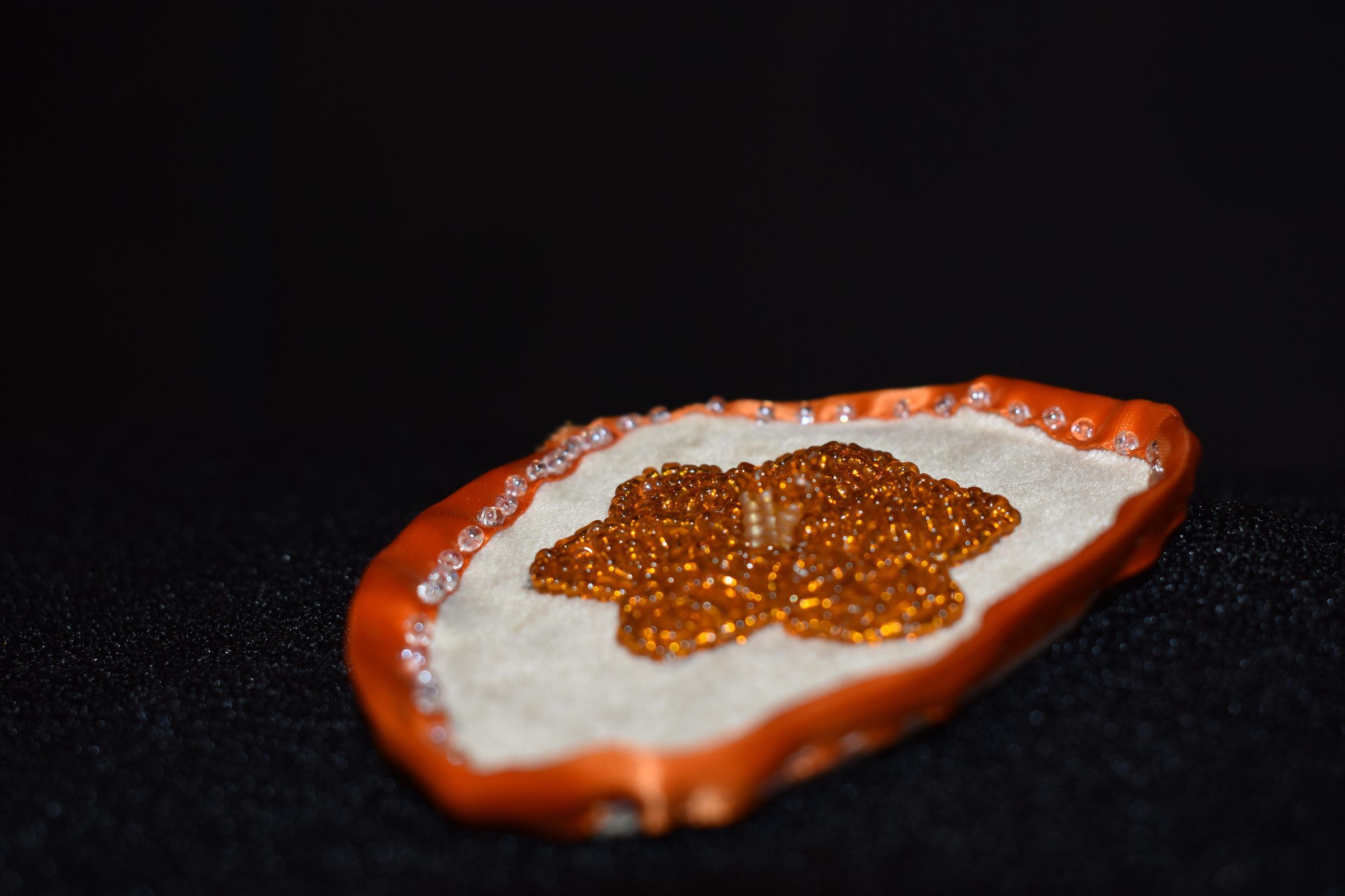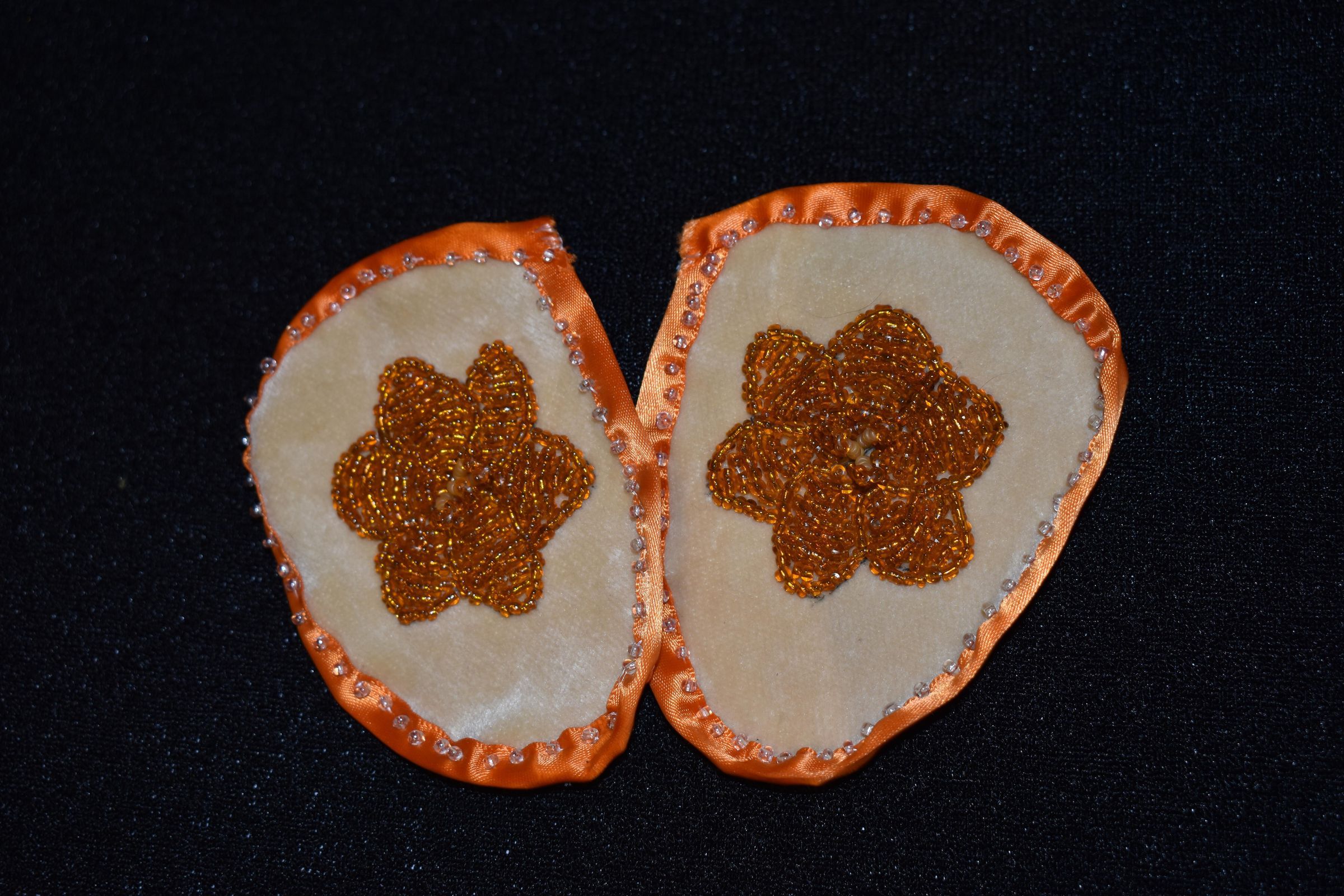 Orange and clear glass seed beads on pellon and velveteen, ribbon edging.Cataloged By
