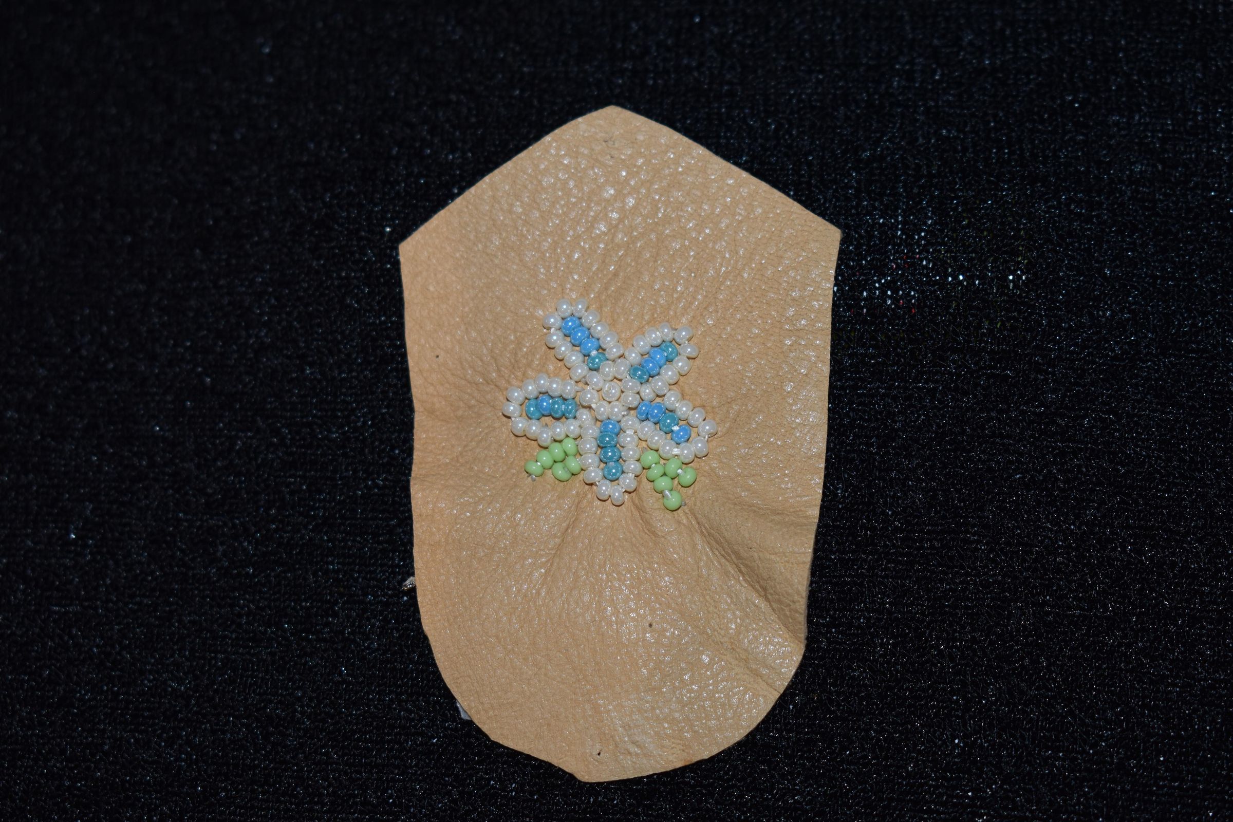 White and blue glass seed beads were used to make a flower, green glass seed beads were used for the leaves. Beaded on tan leather.Cataloged By