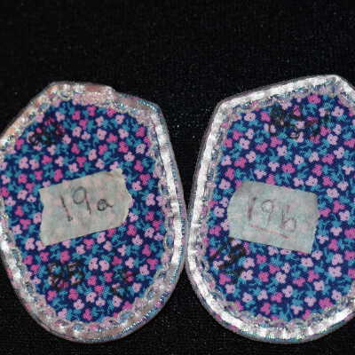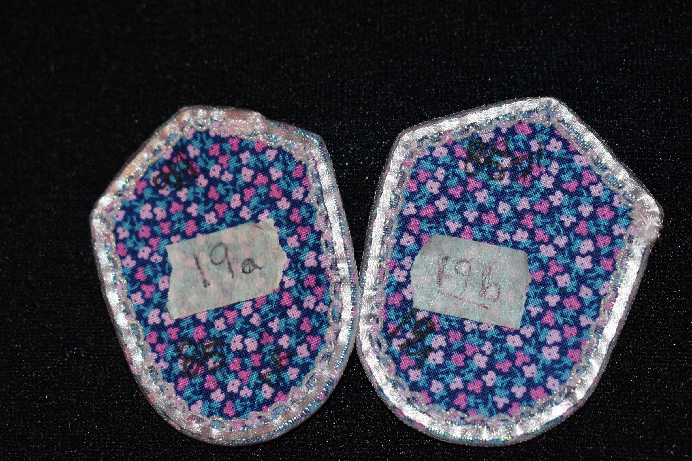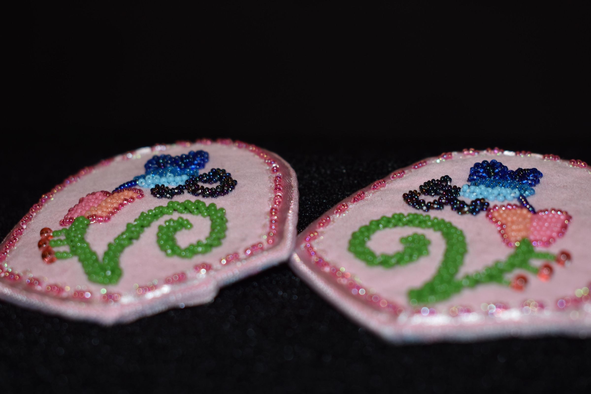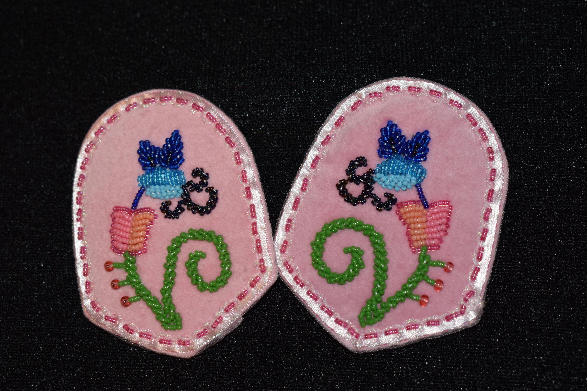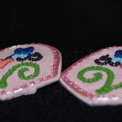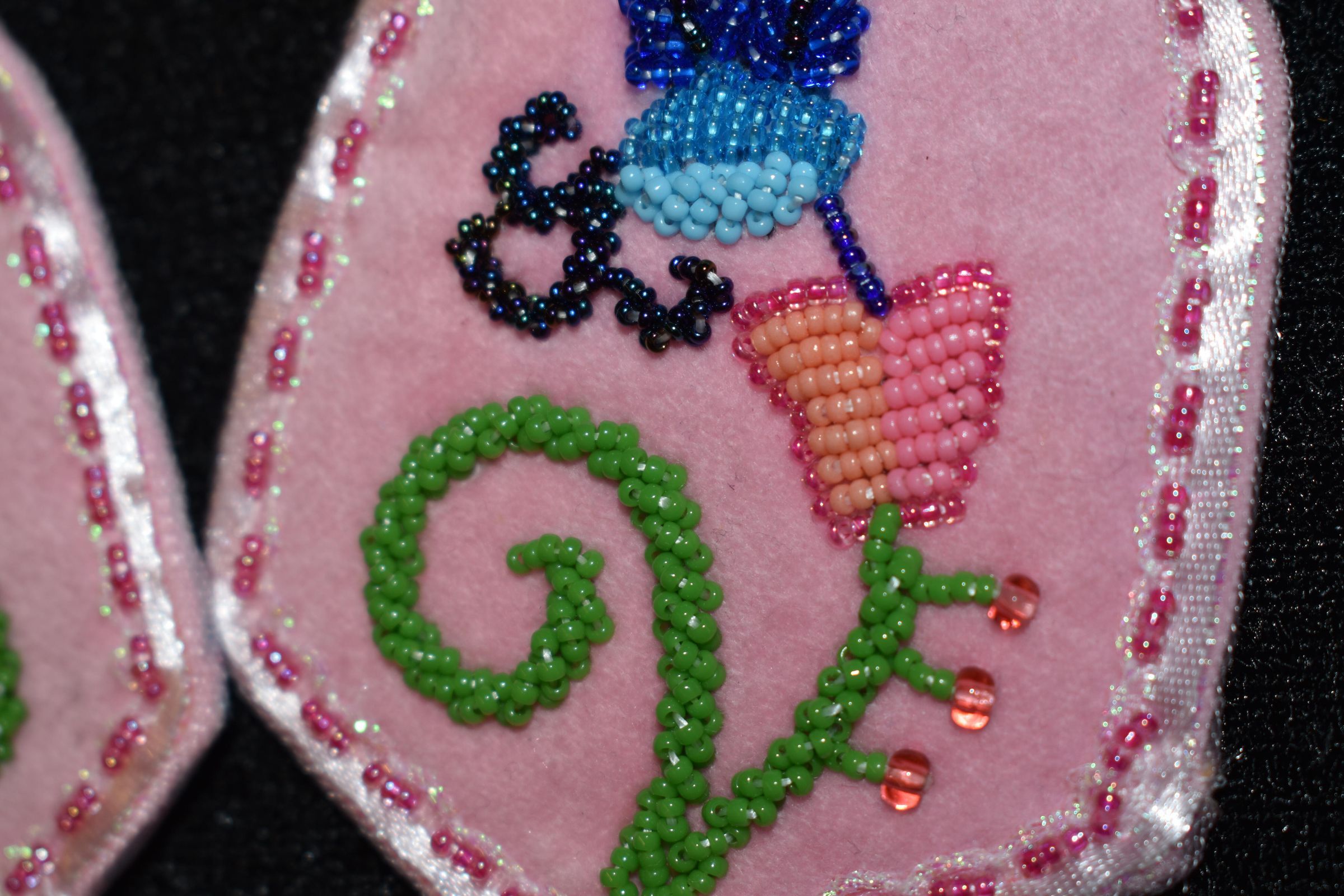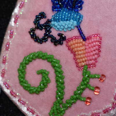 Blue, black, pink, orange, and green glass seed beads are used and its beaded on pellon and faux suede with pink ribbon edging.Cataloged By