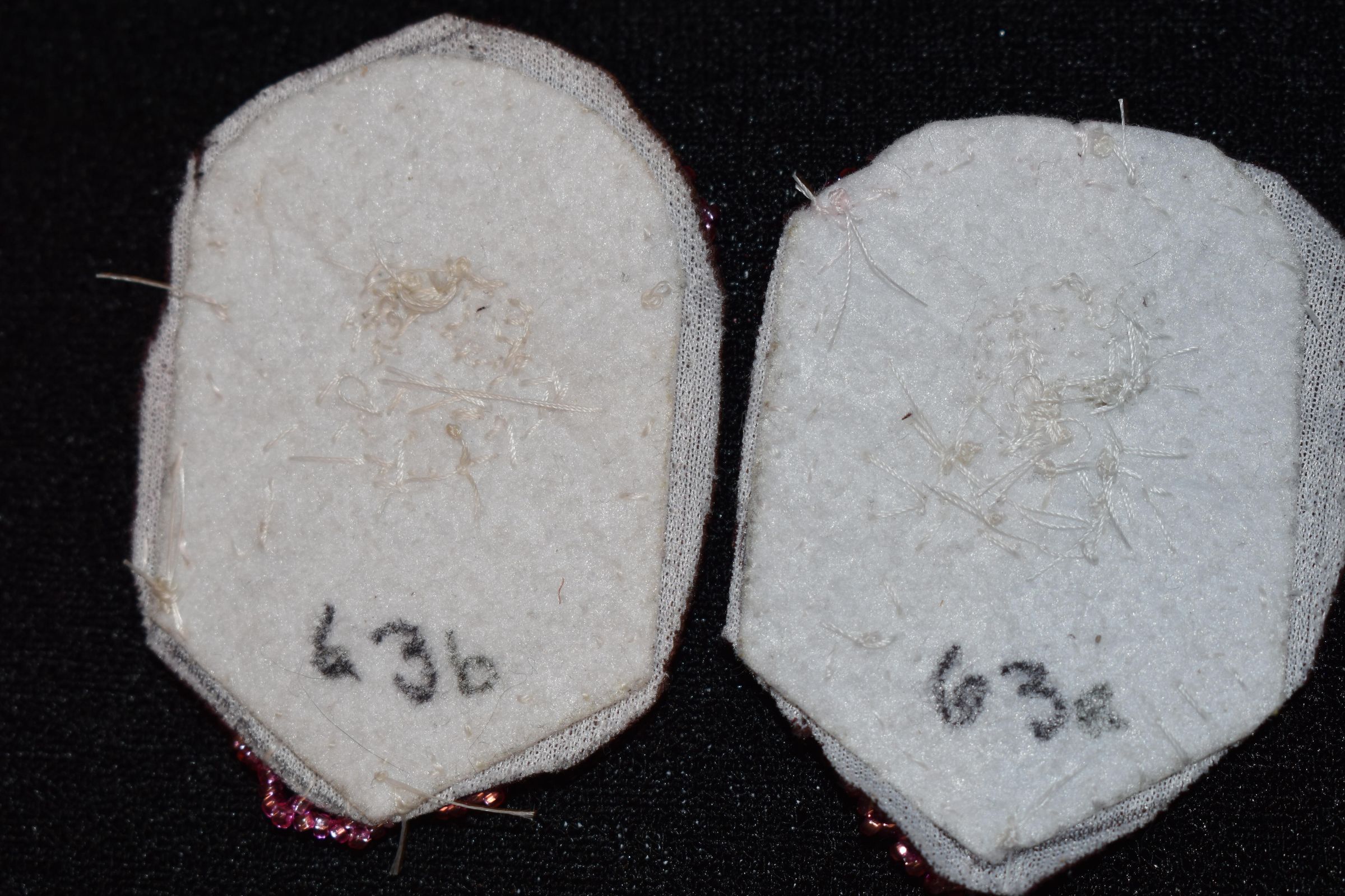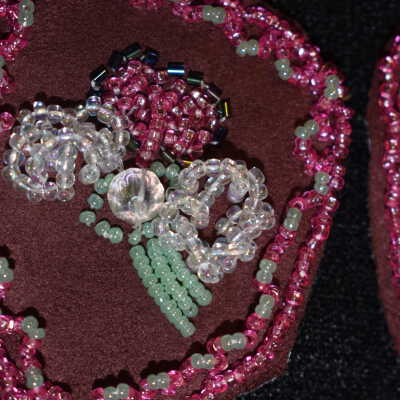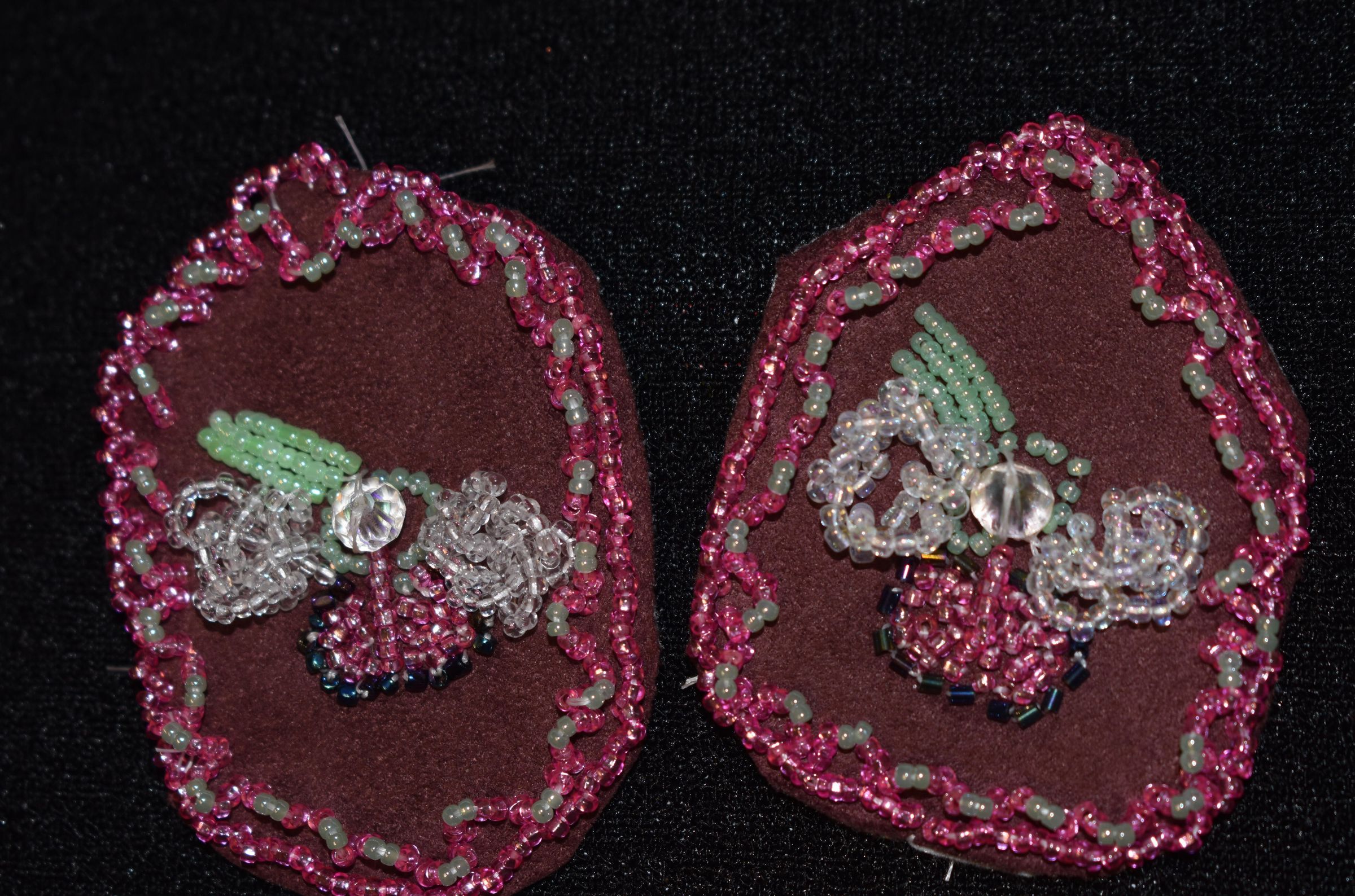 Clear glass bead was used for the centre. Pink, clear, and green glass seed beads were used to make a flower and leaves. Pink and green beads outlined the vamp. Beaded on pellon and faux suede.Cataloged By