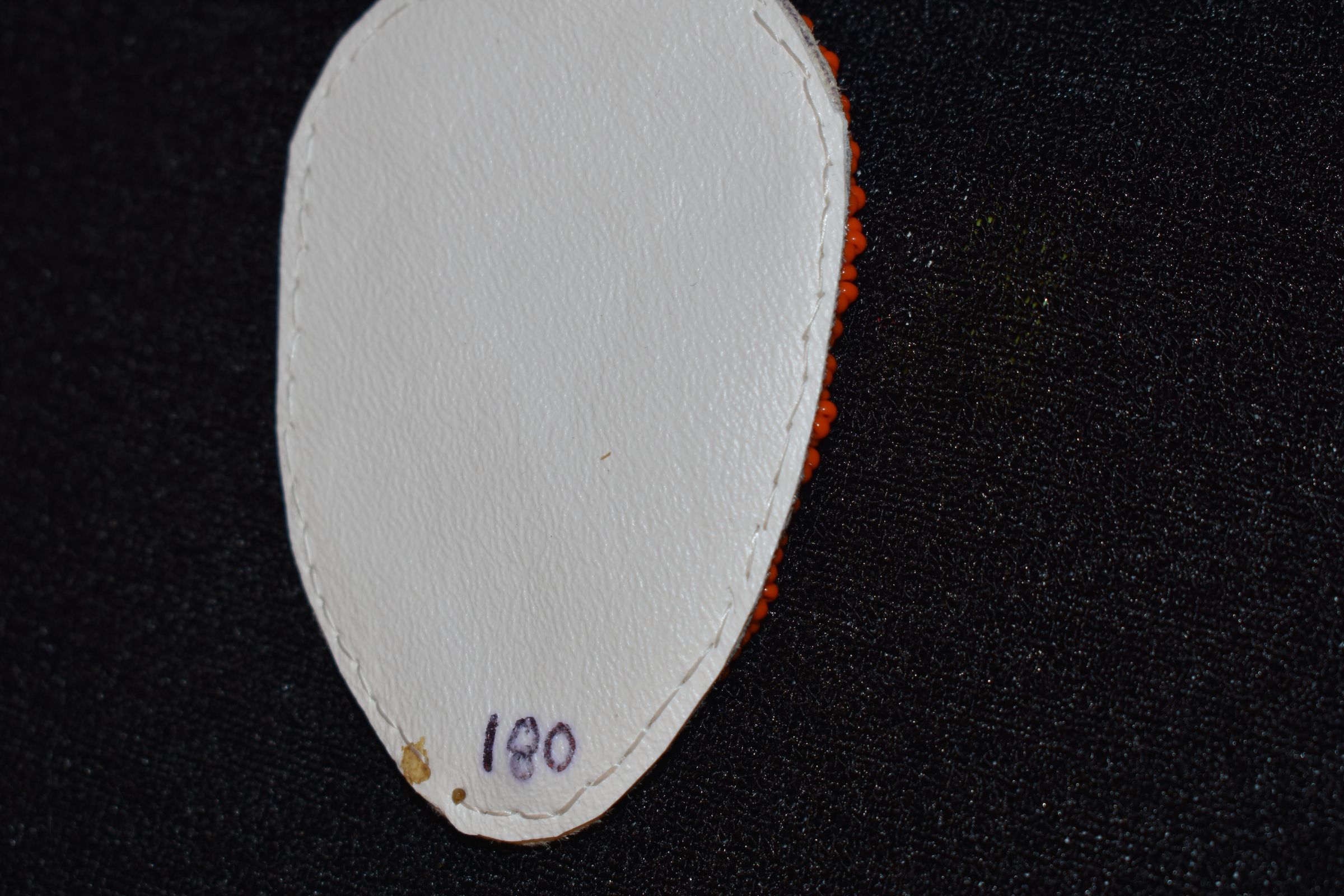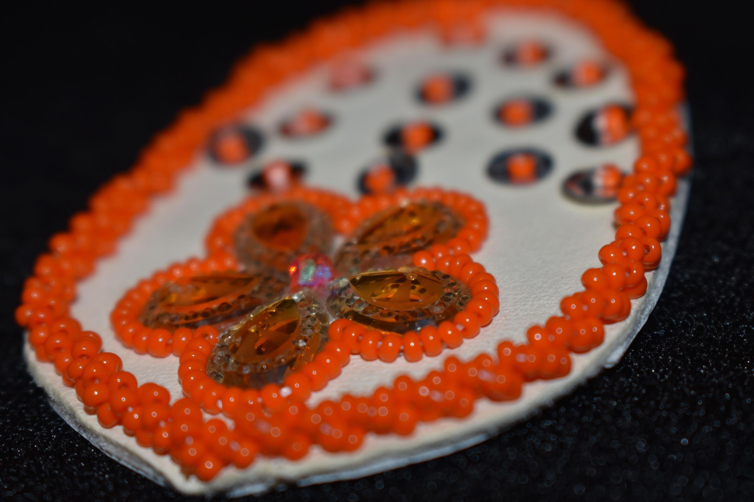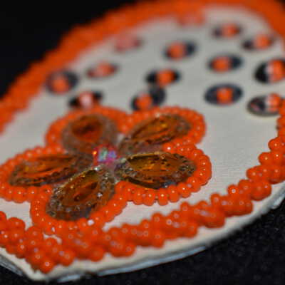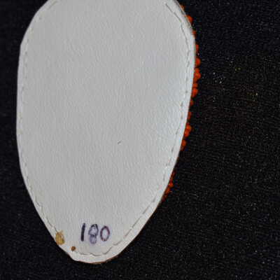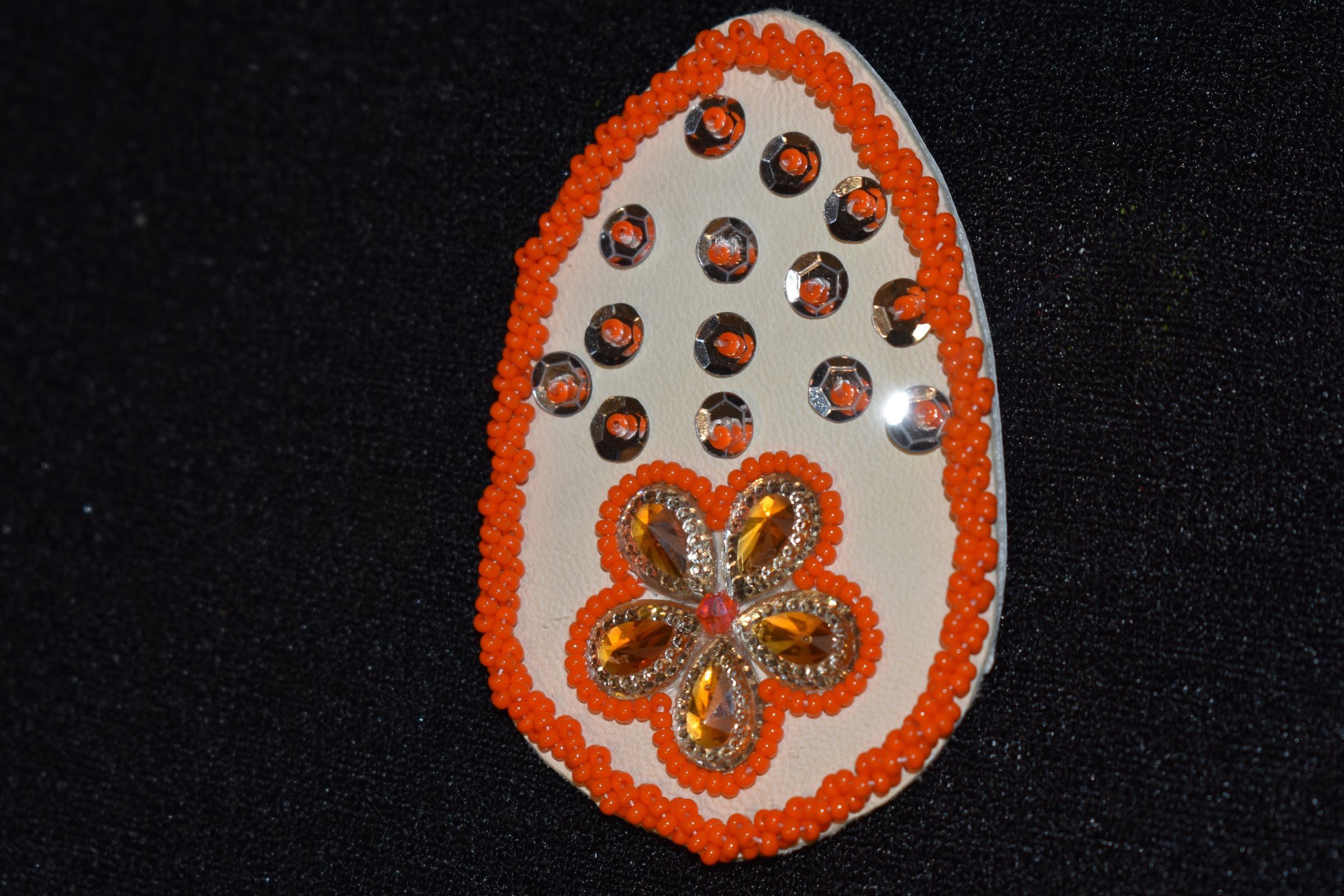Gem centers were used for the petals, with orange glass seed beads around the, sequins with orange glass seed beads are underneath, and orange glass seed beads were used for the along the edge in a rope stitch.Cataloged By