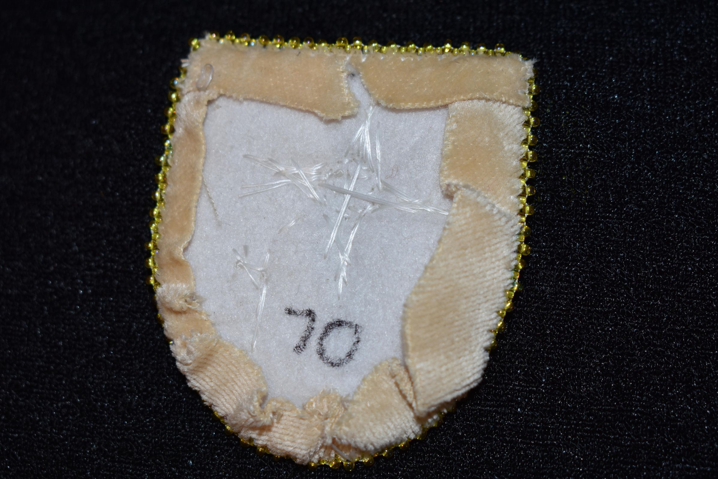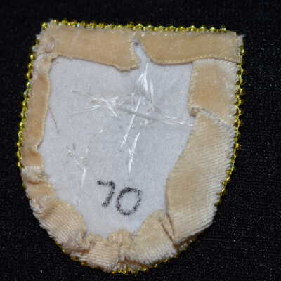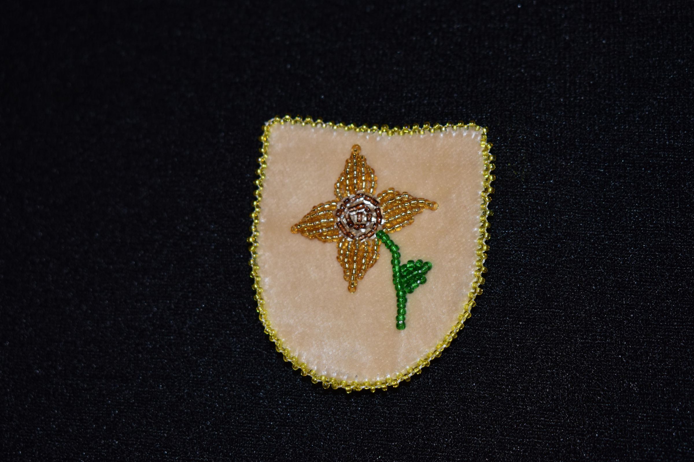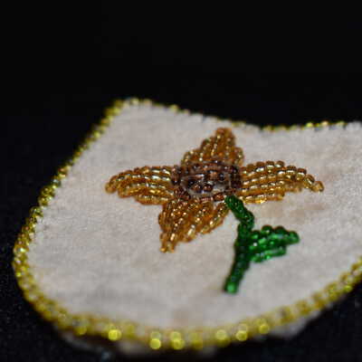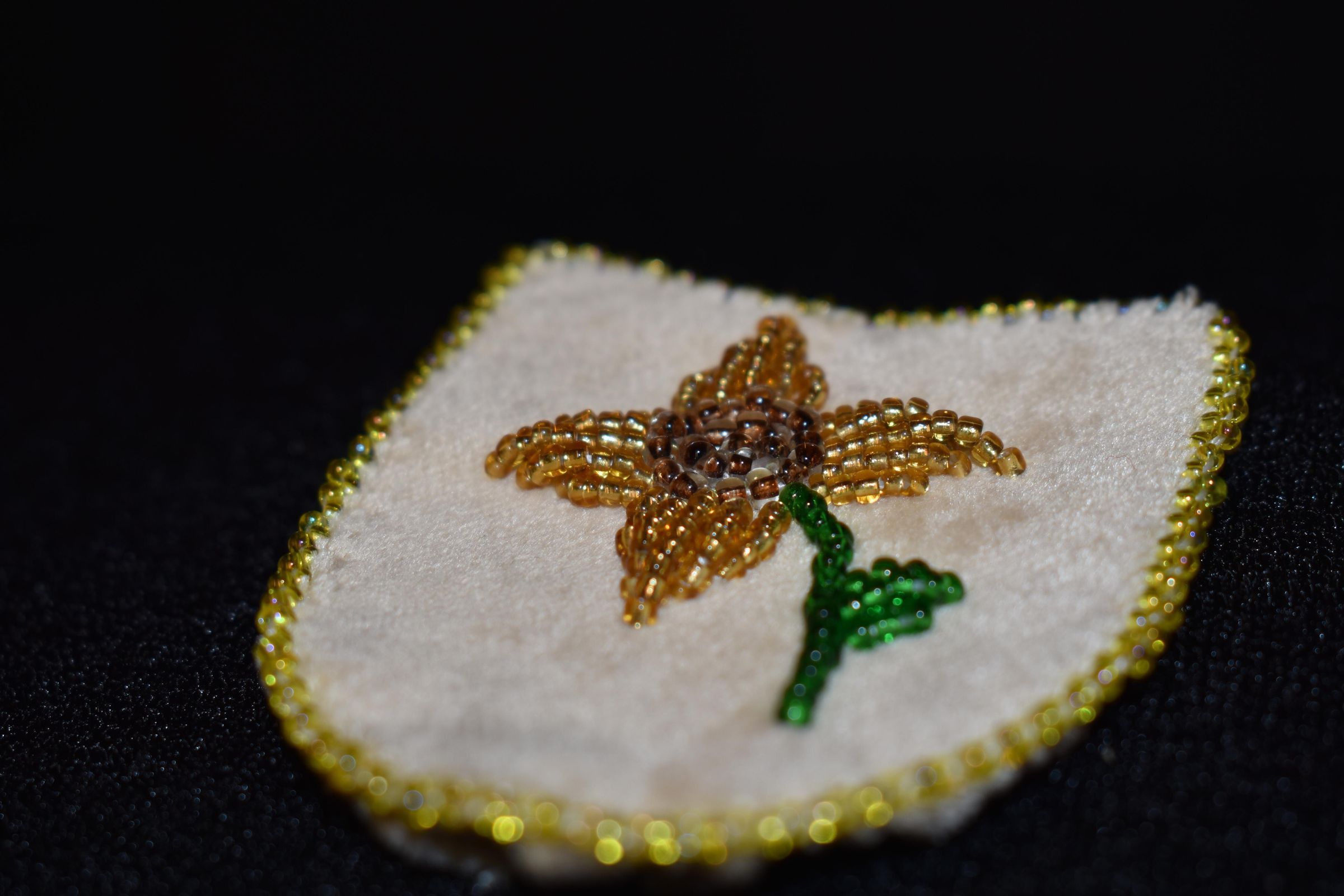 Brown beads used for the centre of the flower, gold glass seed beads used for the petals. Bead on pellon and faux suede. Edged with yellow glass seed beads.Cataloged By