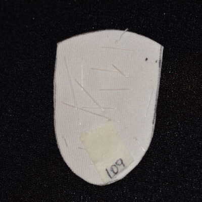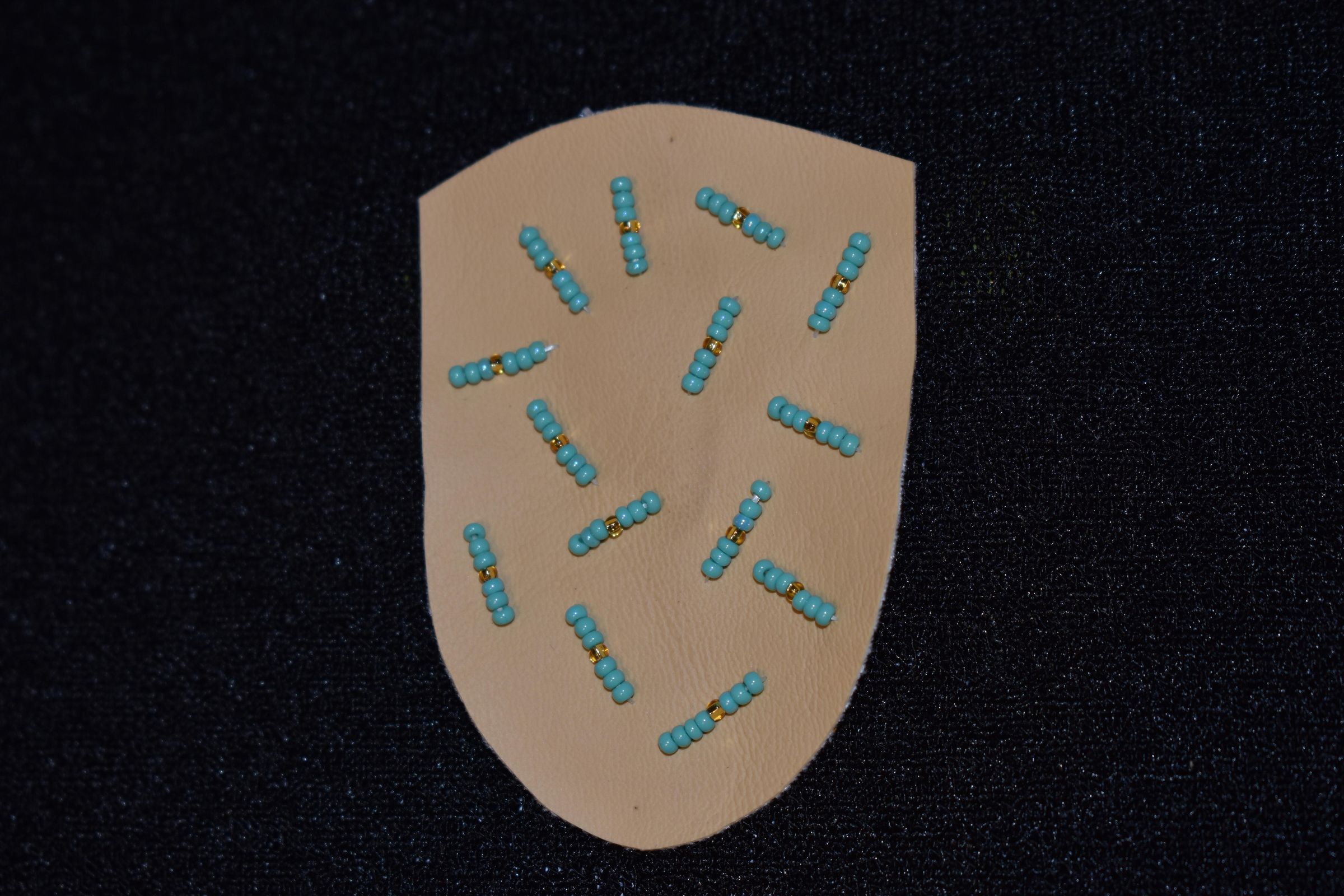 Vamp donated by Jackie Cree. Turquoise and gold glass seed beads on vinyl.