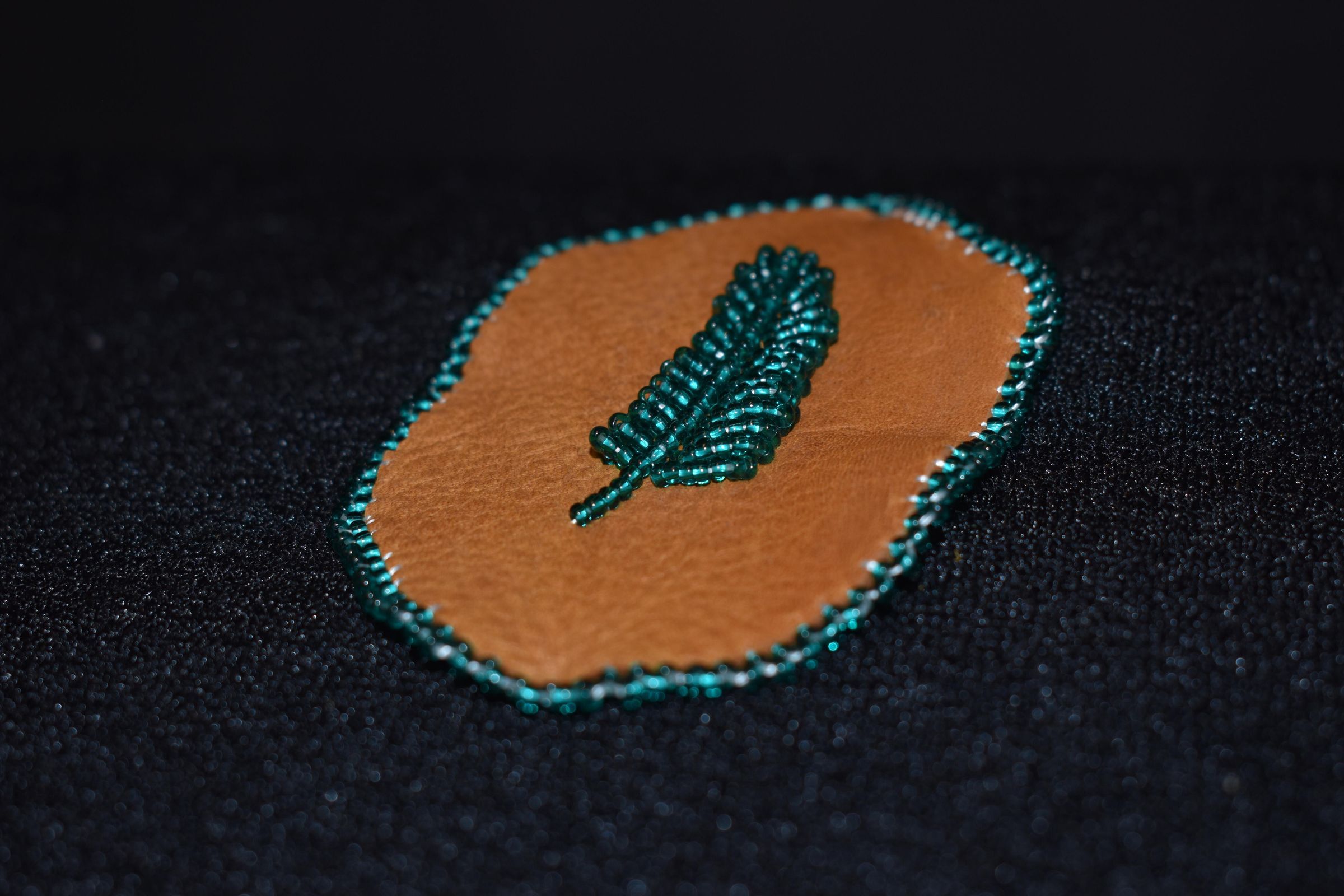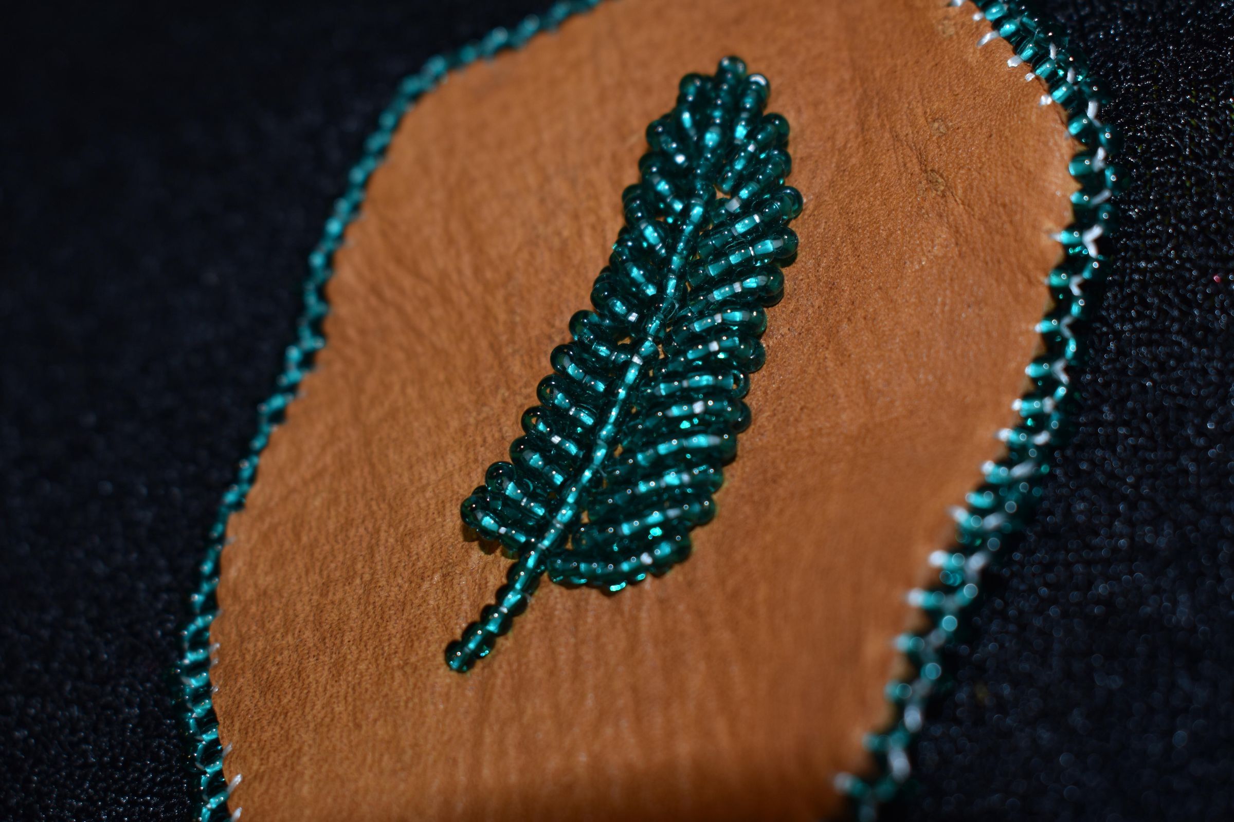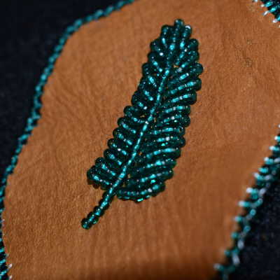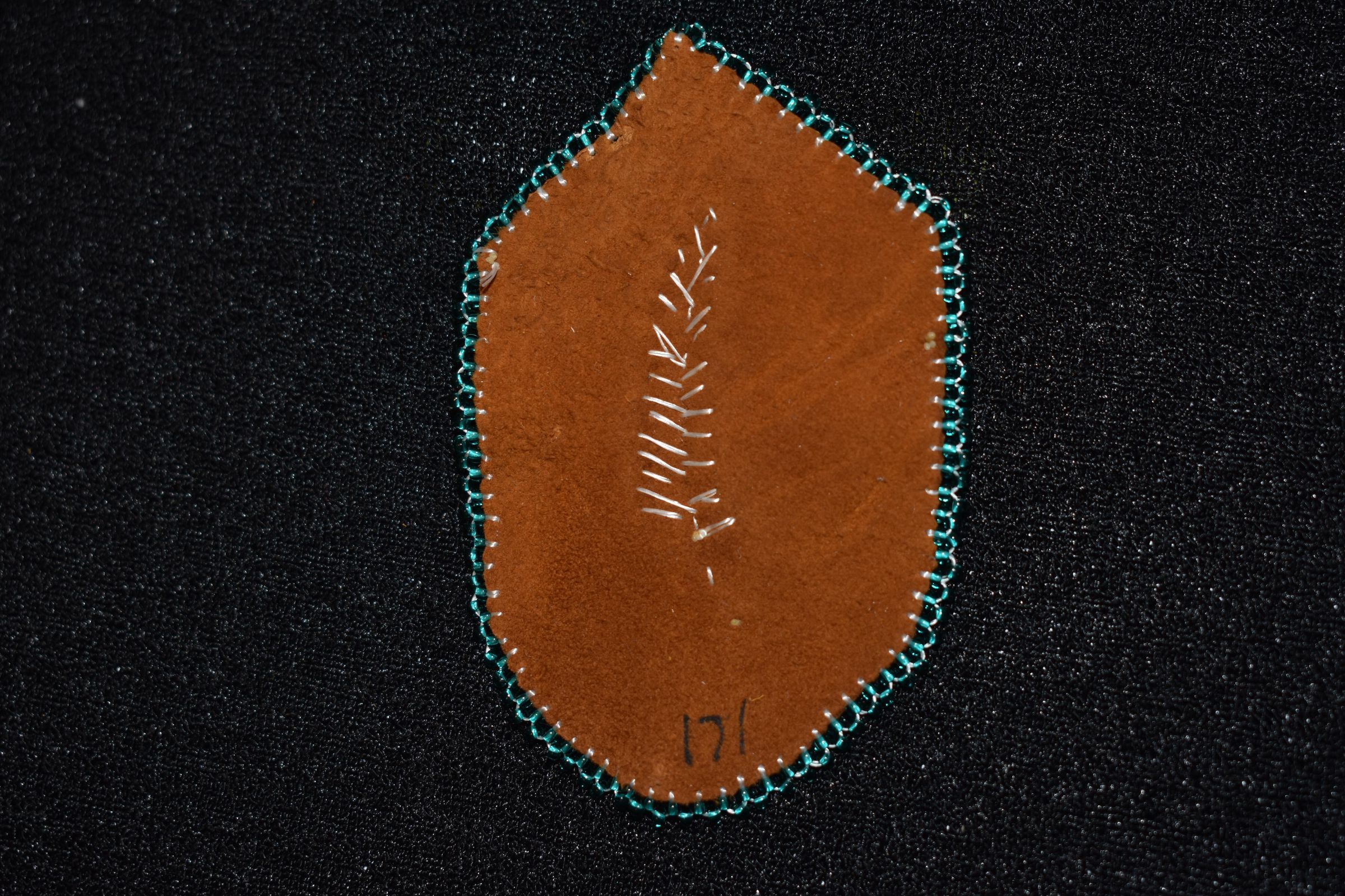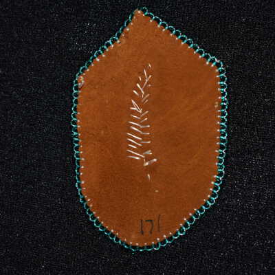 teal glass seed beads were used for the feather and edging, beaded on leather.Cataloged By