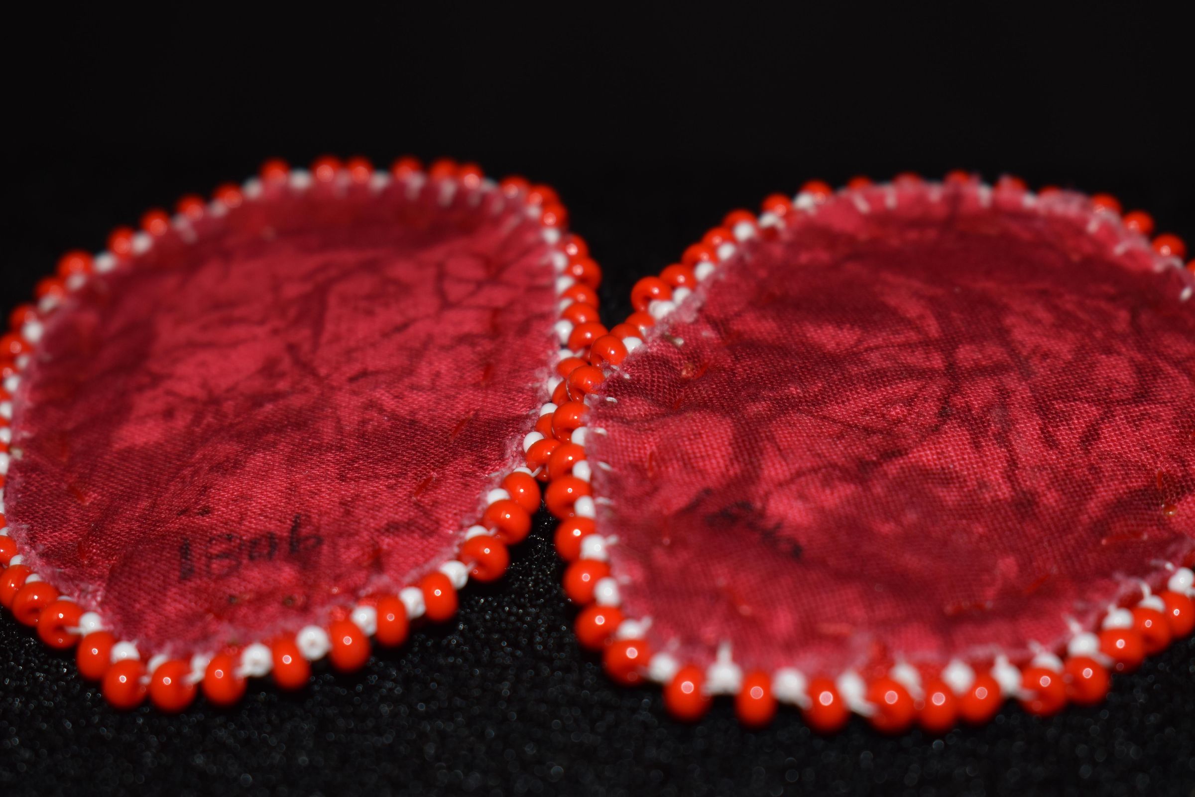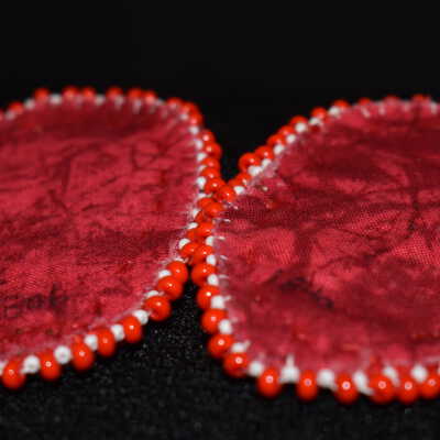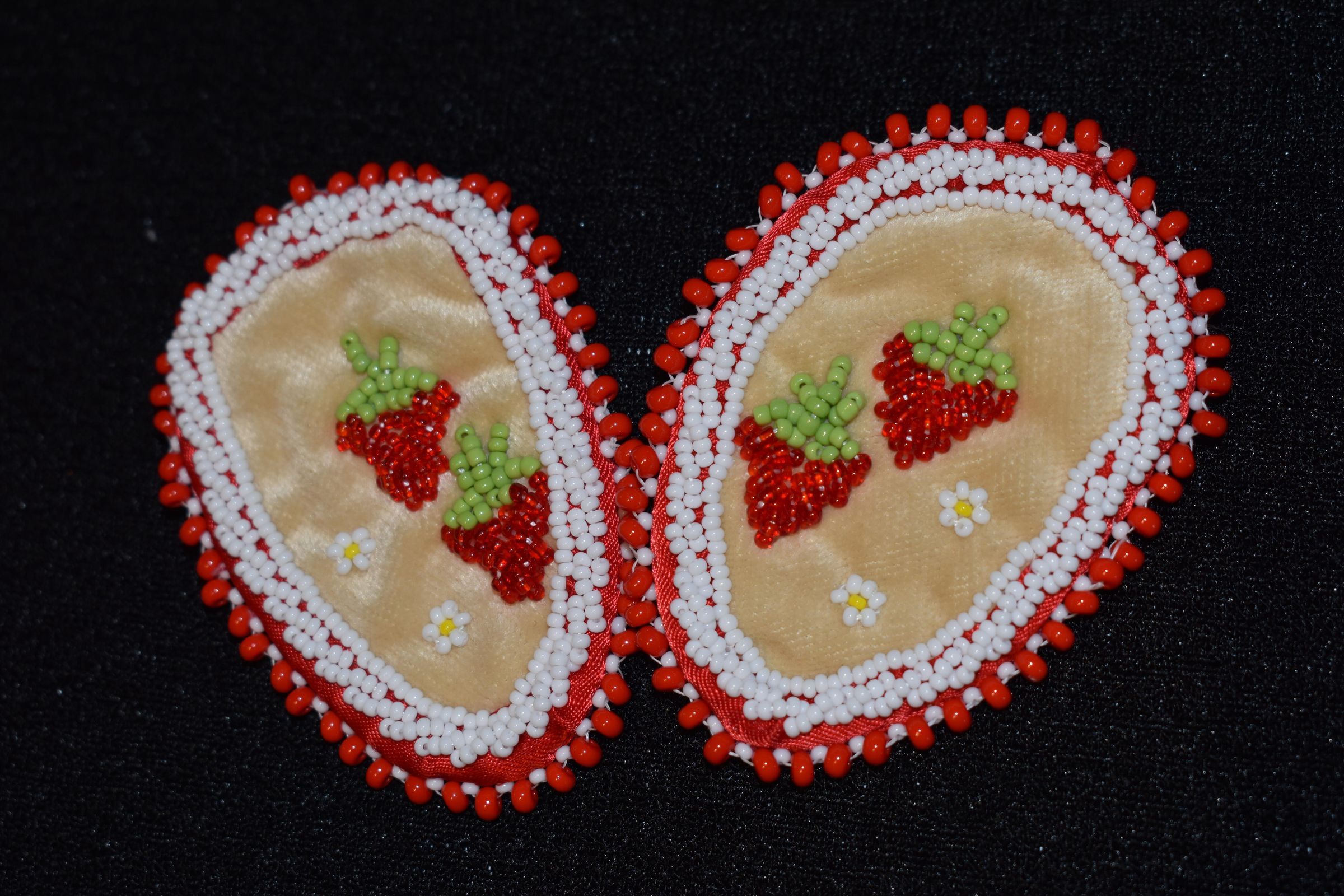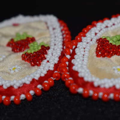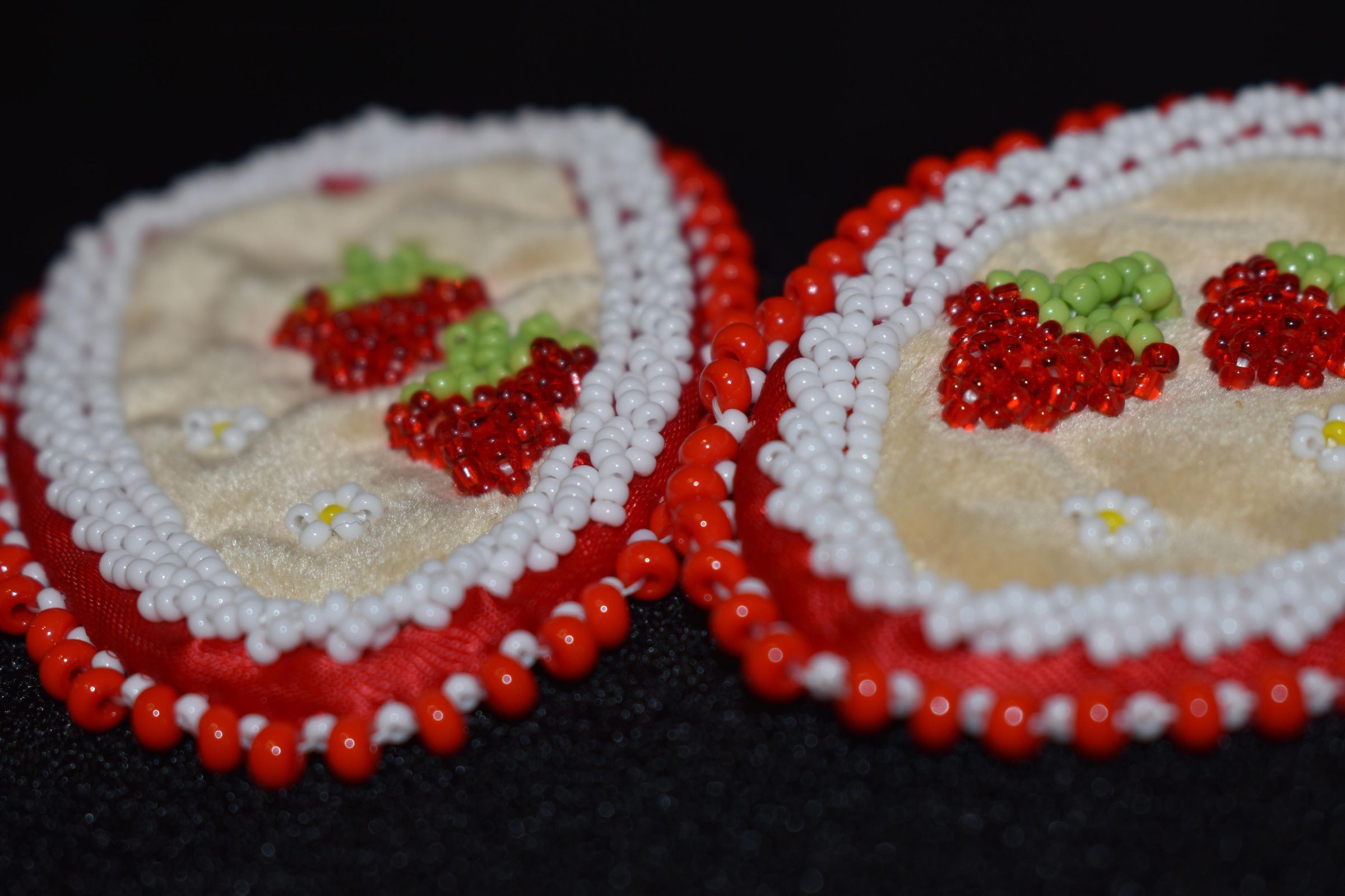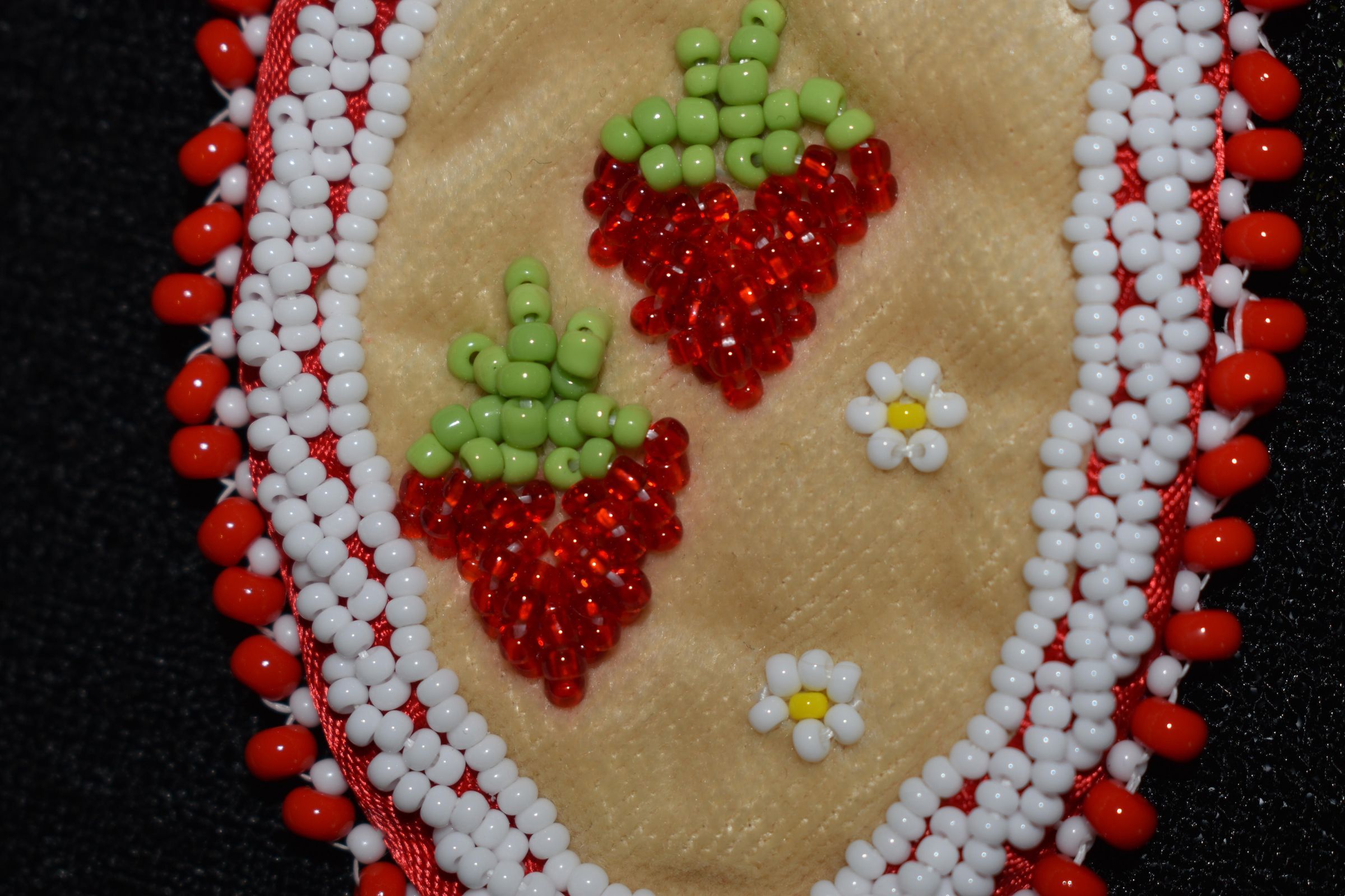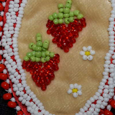 Red glass seed beads were used for the strawberries, green glass seed beads were used for the leaves, yellow and white glass seed beads were used for the flowers. White glass seed beads were stitched along the edges of the ribbon, in both a regular line and rope stitch. Large red beads and white glass seed beads were used for the edging. Beaded on pellon and faux suede with ribbon on the edge.Cataloged By