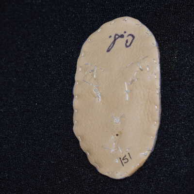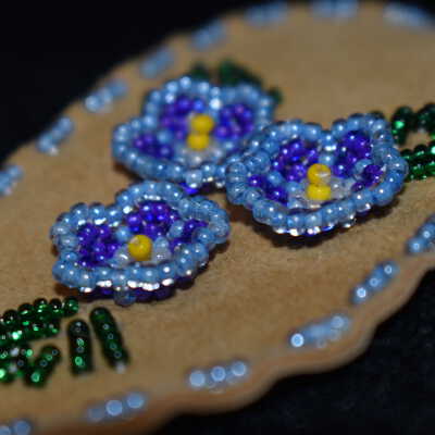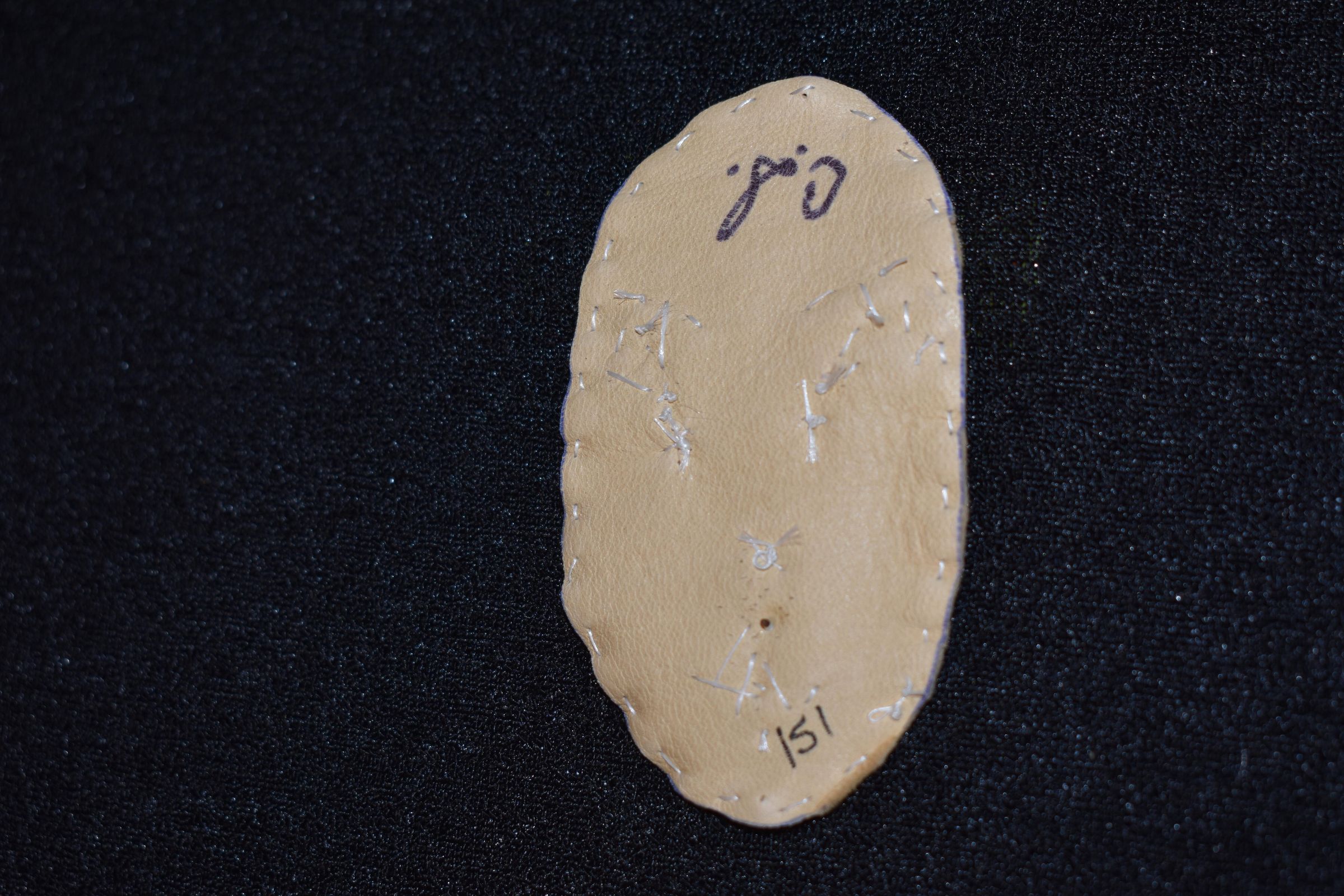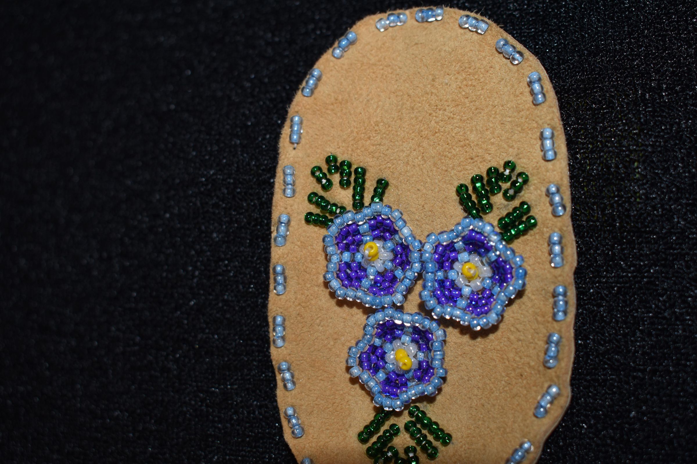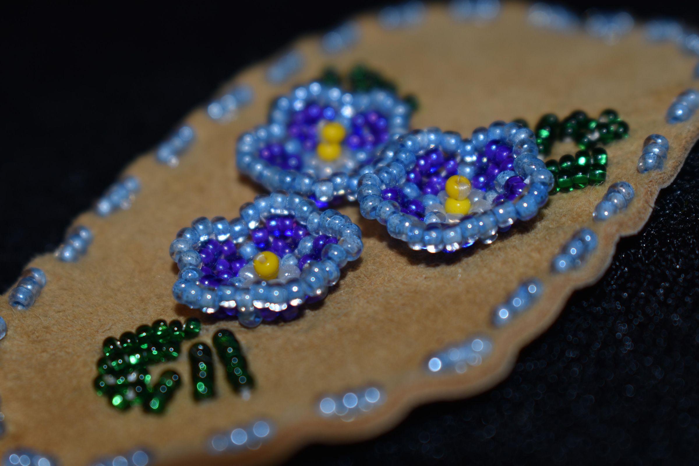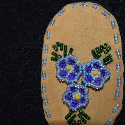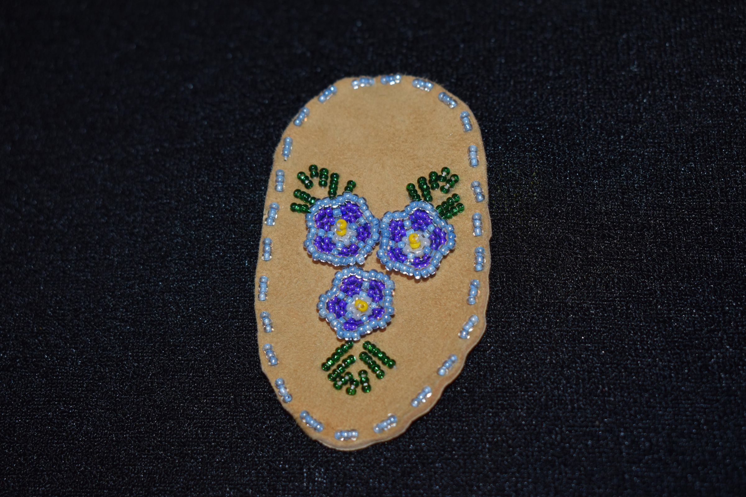 Yellow, purple, and blue glass seed beads were used for the flower. Green glass seed beads were used for the leaves. Bead on leather. Flowers are coming off the leather.Cataloged By