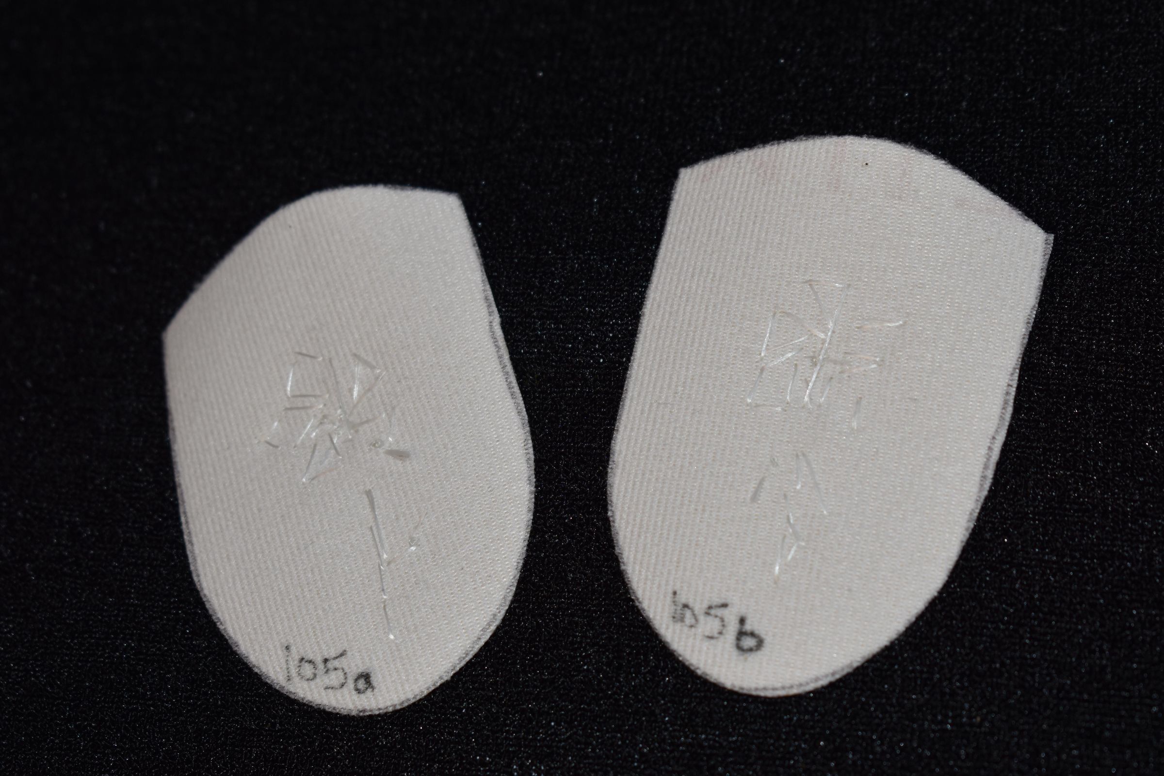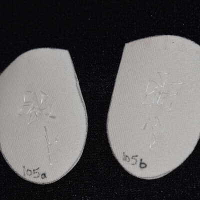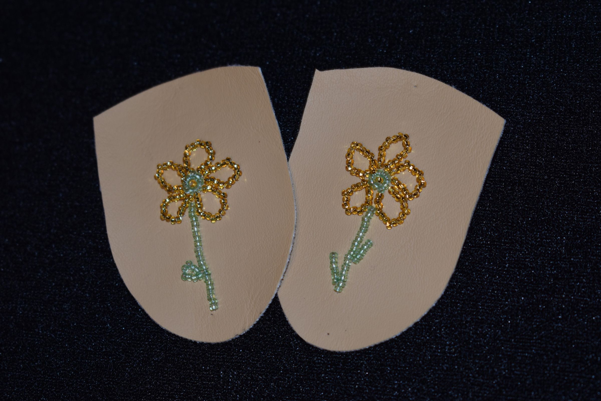 Vamps donated by Jackie Cree. Gold and green glass seed beads on vinyl.