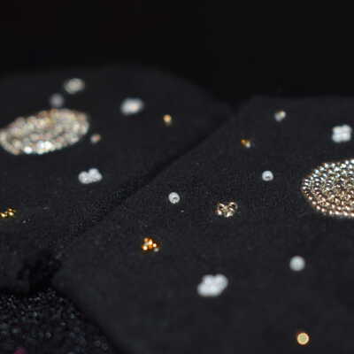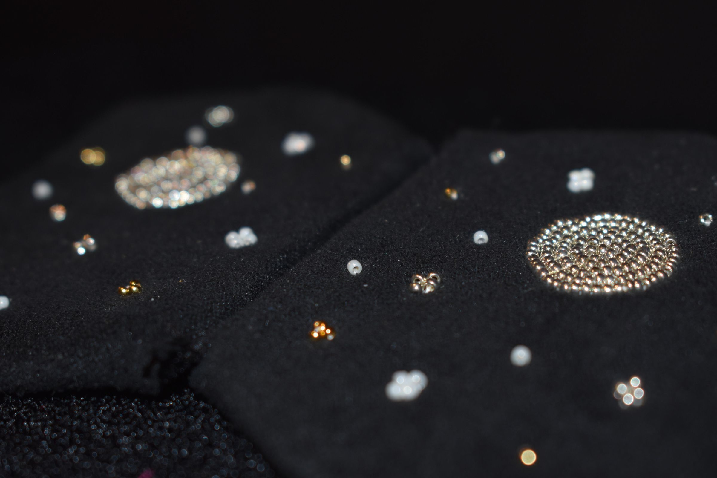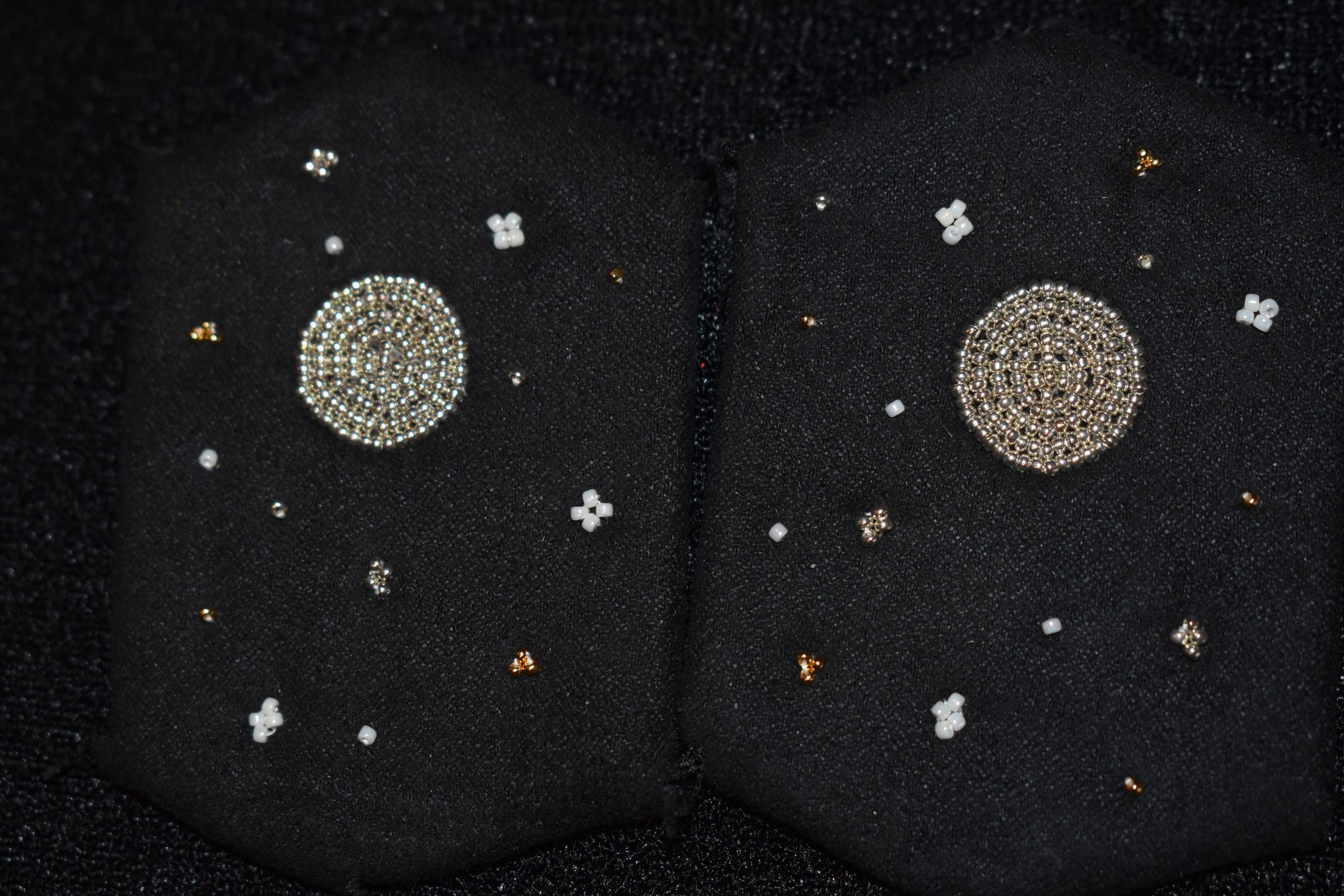 Silver glass seed beads were used to make moons. White glass delica beads were used as star. Gold and silver beads were also used as star. Beaded on pellon and faux suede.Cataloged By