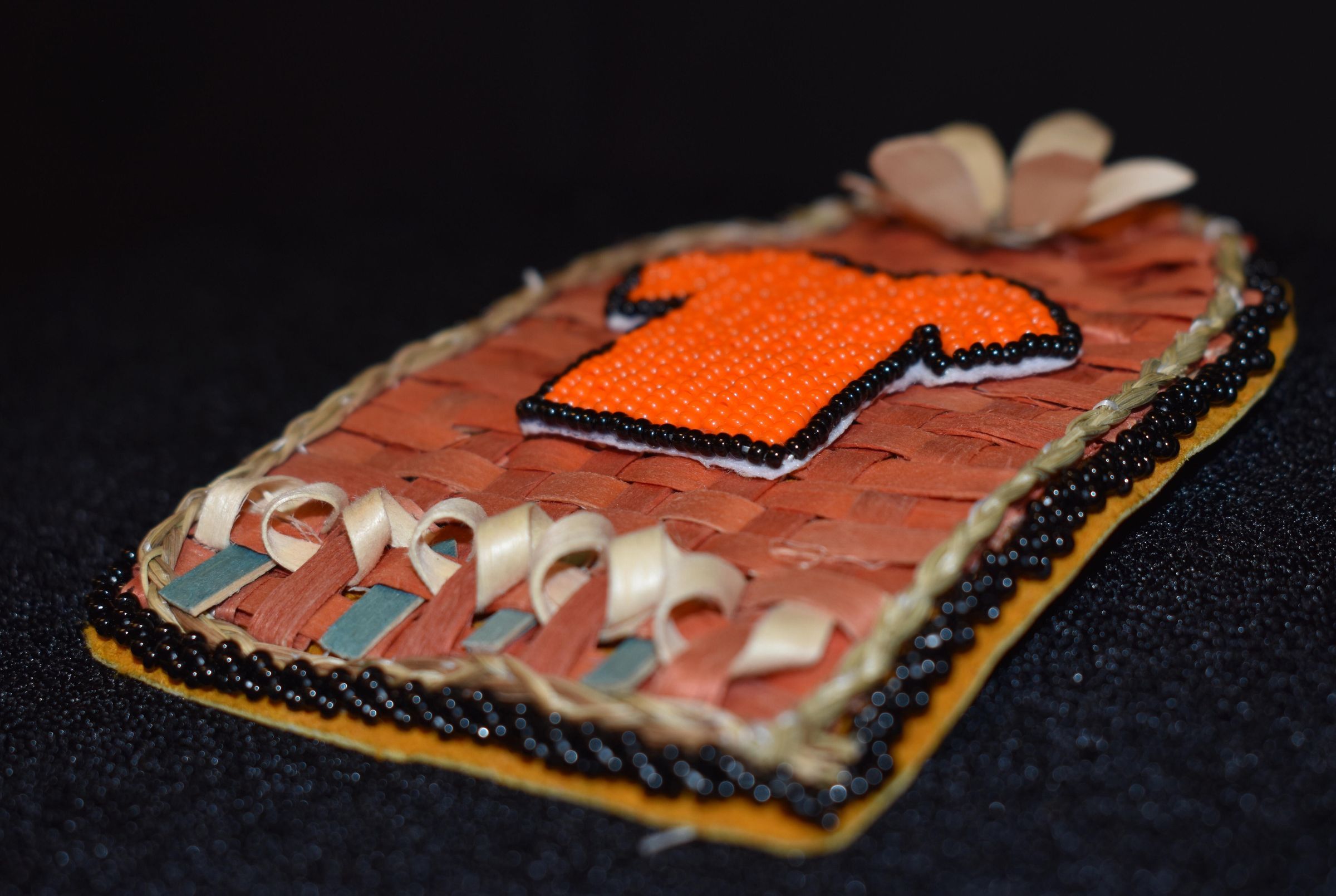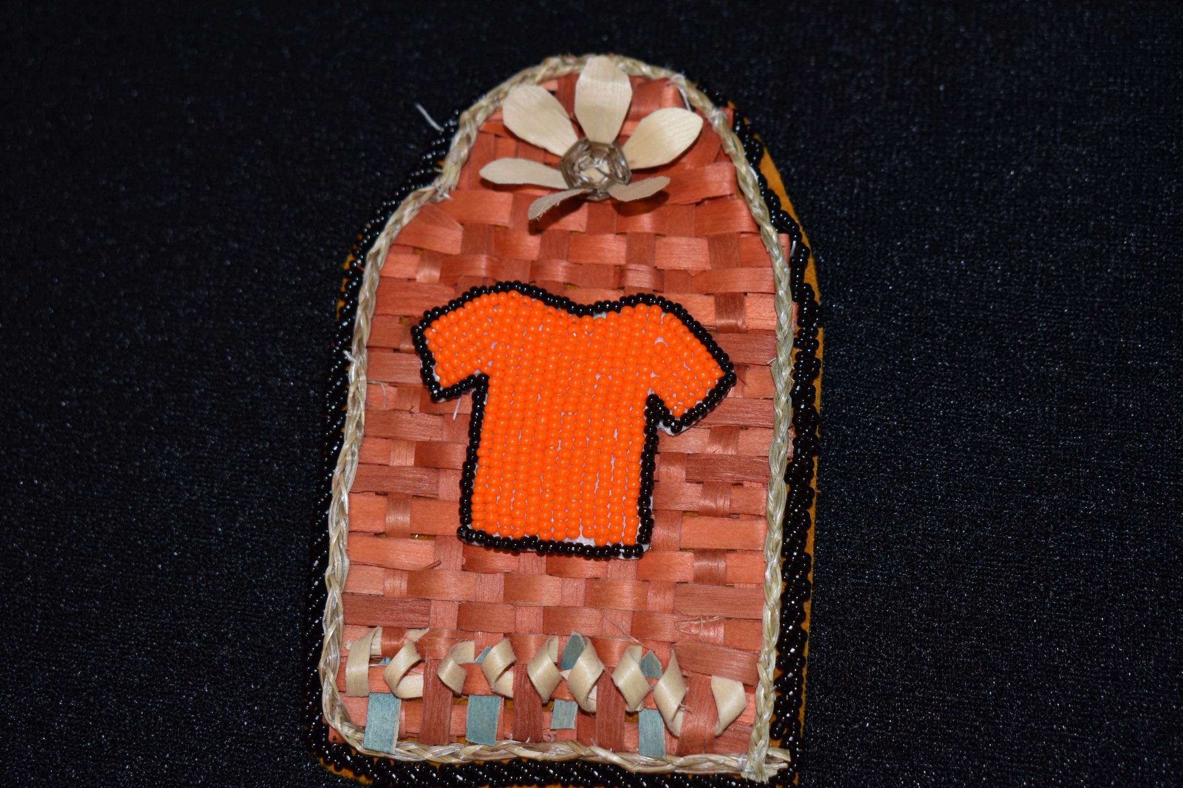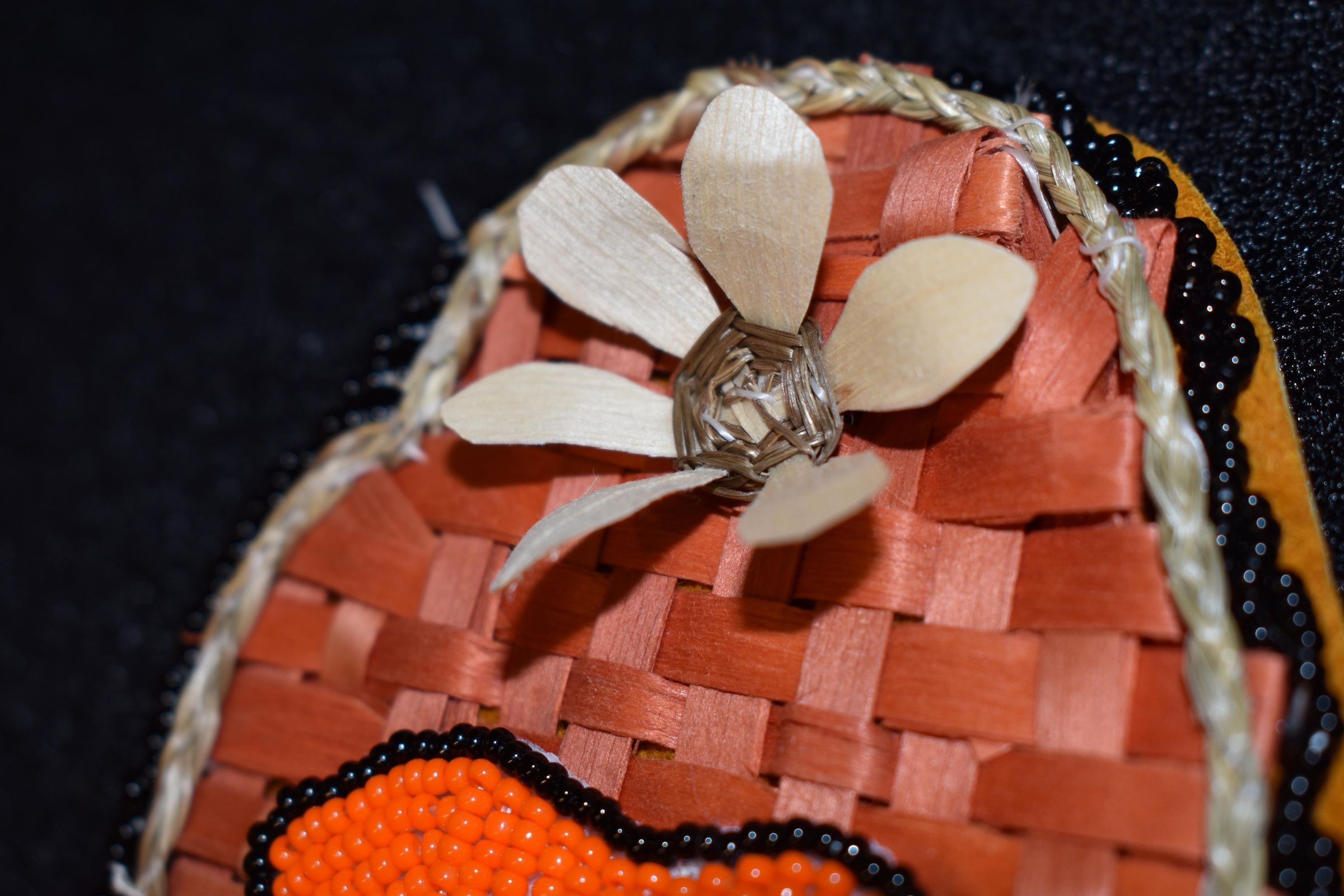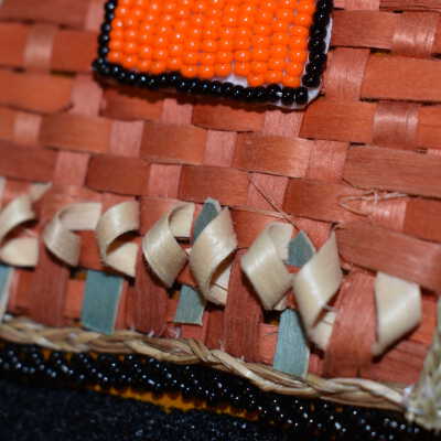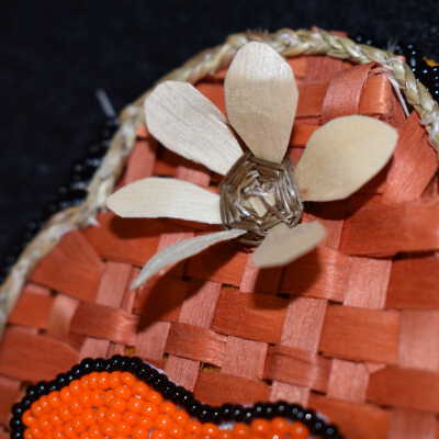 Basket - orange and blue dyed splints were used. Plain splints were used for bifaces design. Sweetgrass was placed around the edge. plain splint flower is on top.
