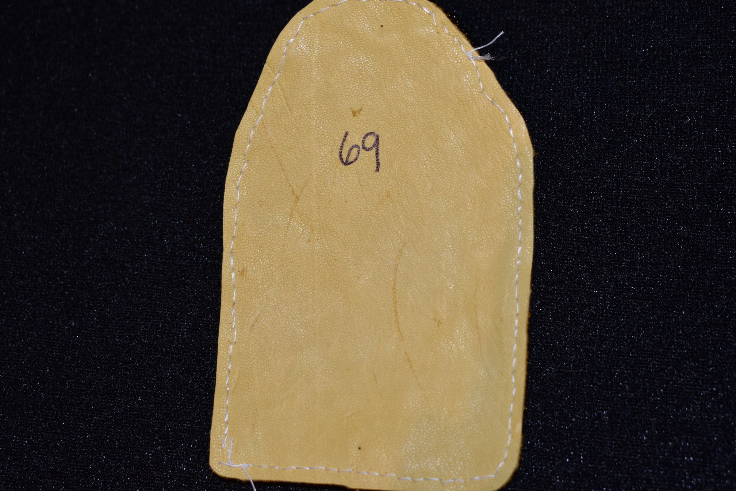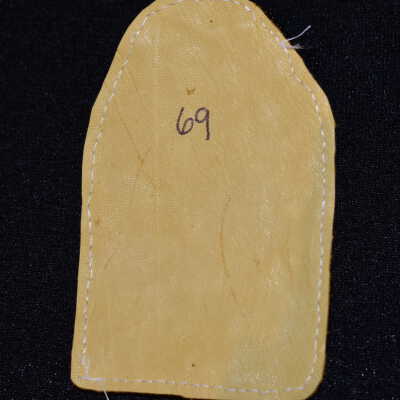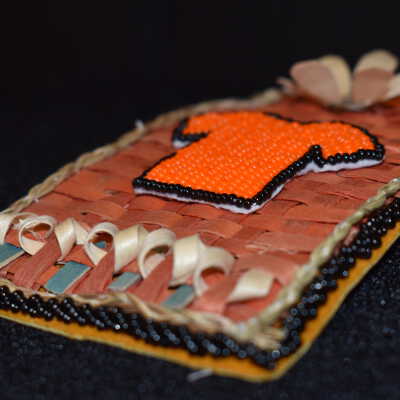 The whole thing is on leather, with black glass seed beads used around it in a rope stitch.Cataloged By