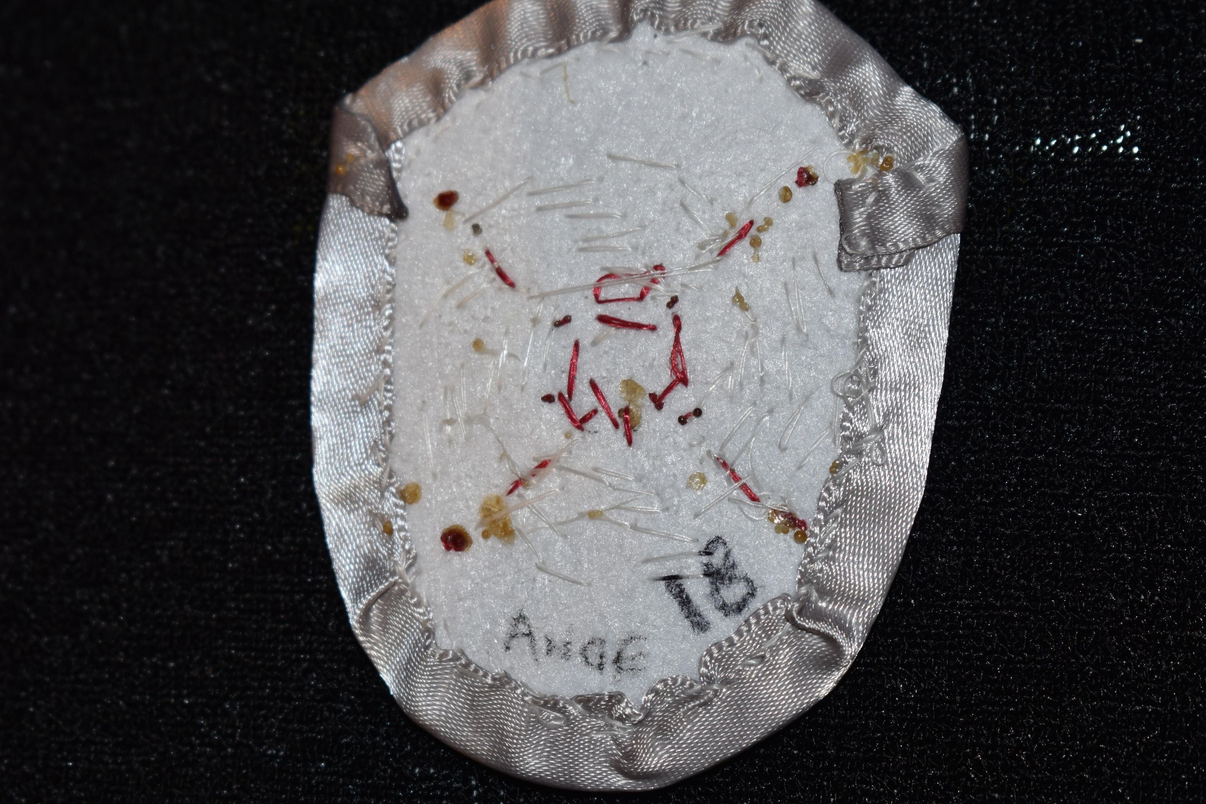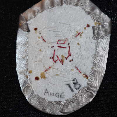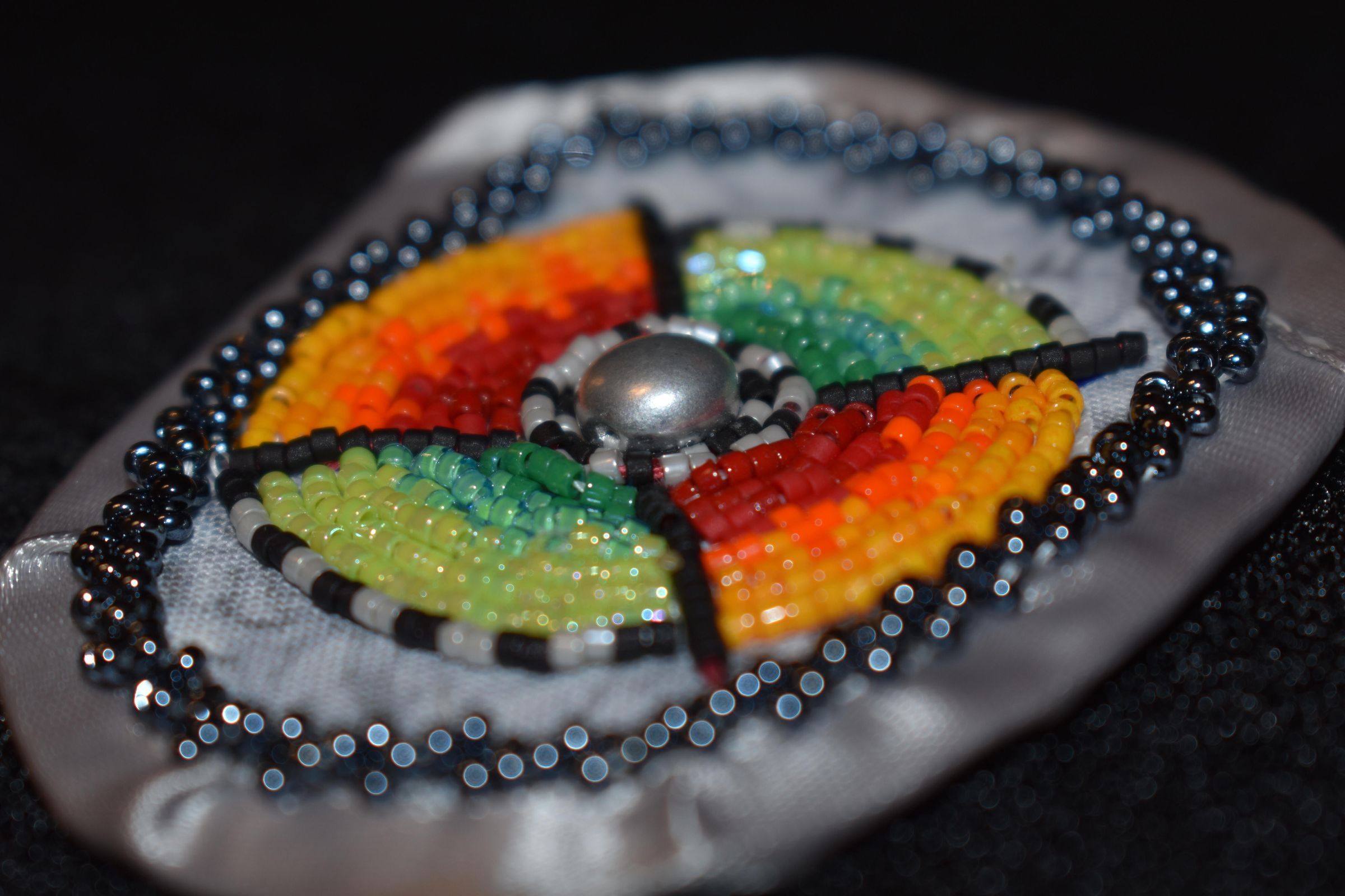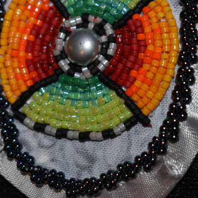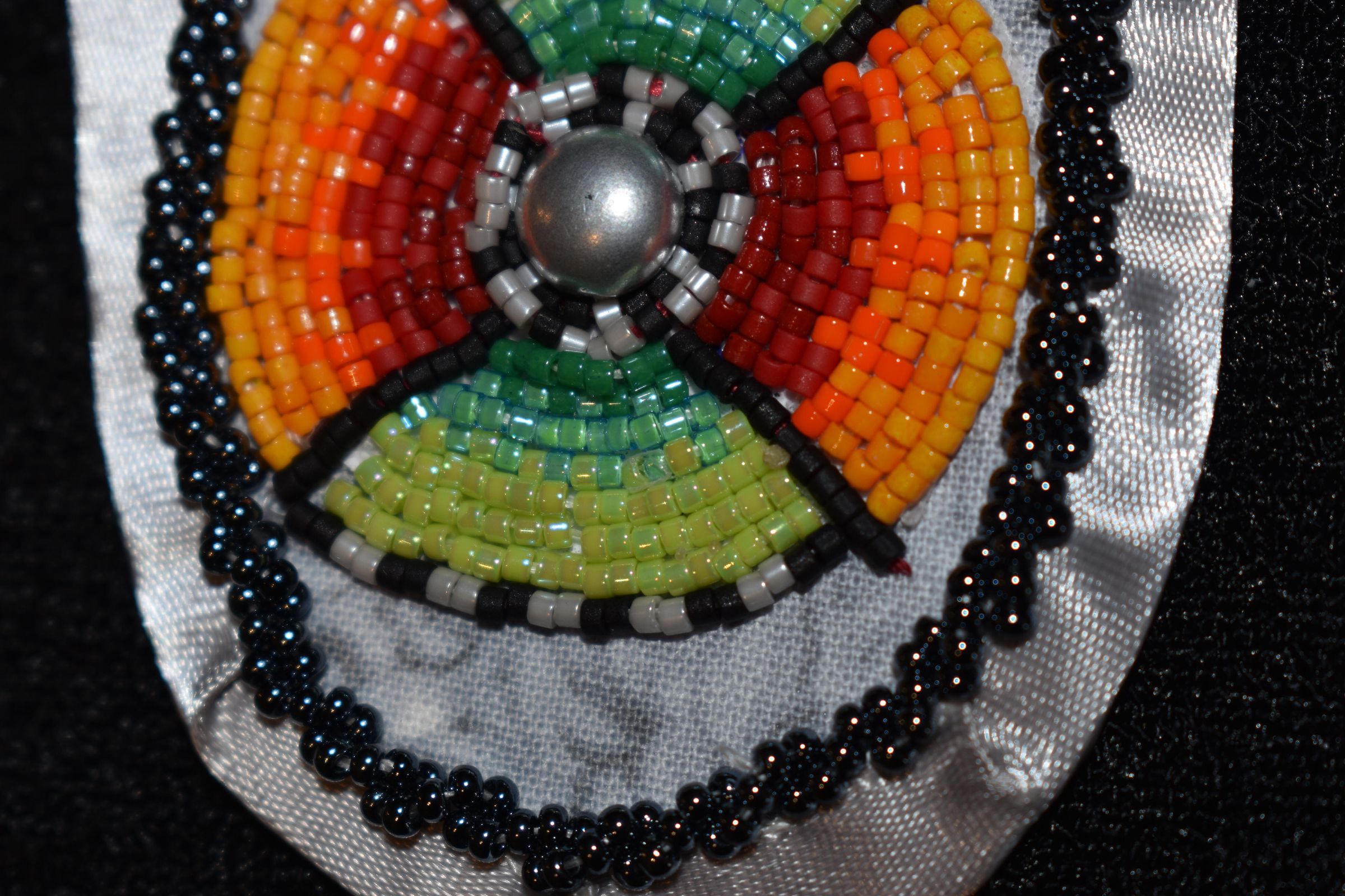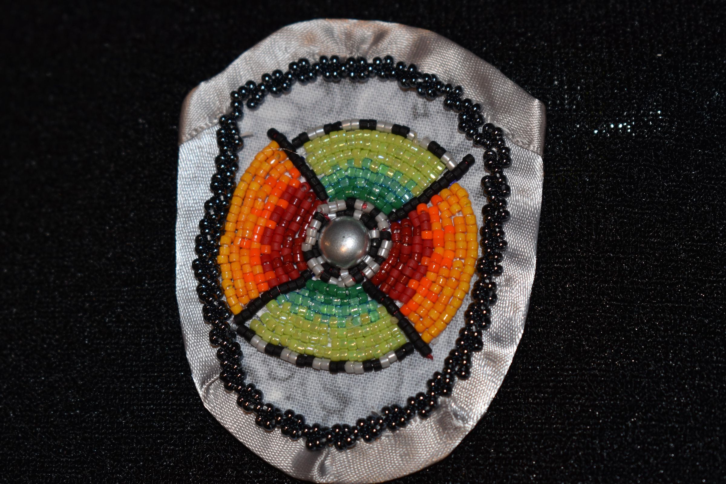 Red, orange, yellow, green, black, white, and dark grey delicate beads in a circle around a metal centre. Top and bottom are various shades of greens. Left and right of the circle have a red to yellow gradient. Beaded on pellon and calico material, with a grey ribbon edging. Along the ribbon is a grey rope stitch with black glass seed beads.Cataloged By