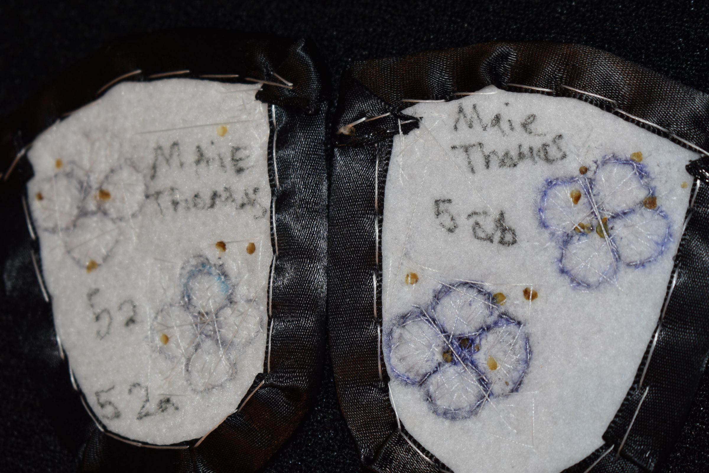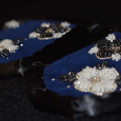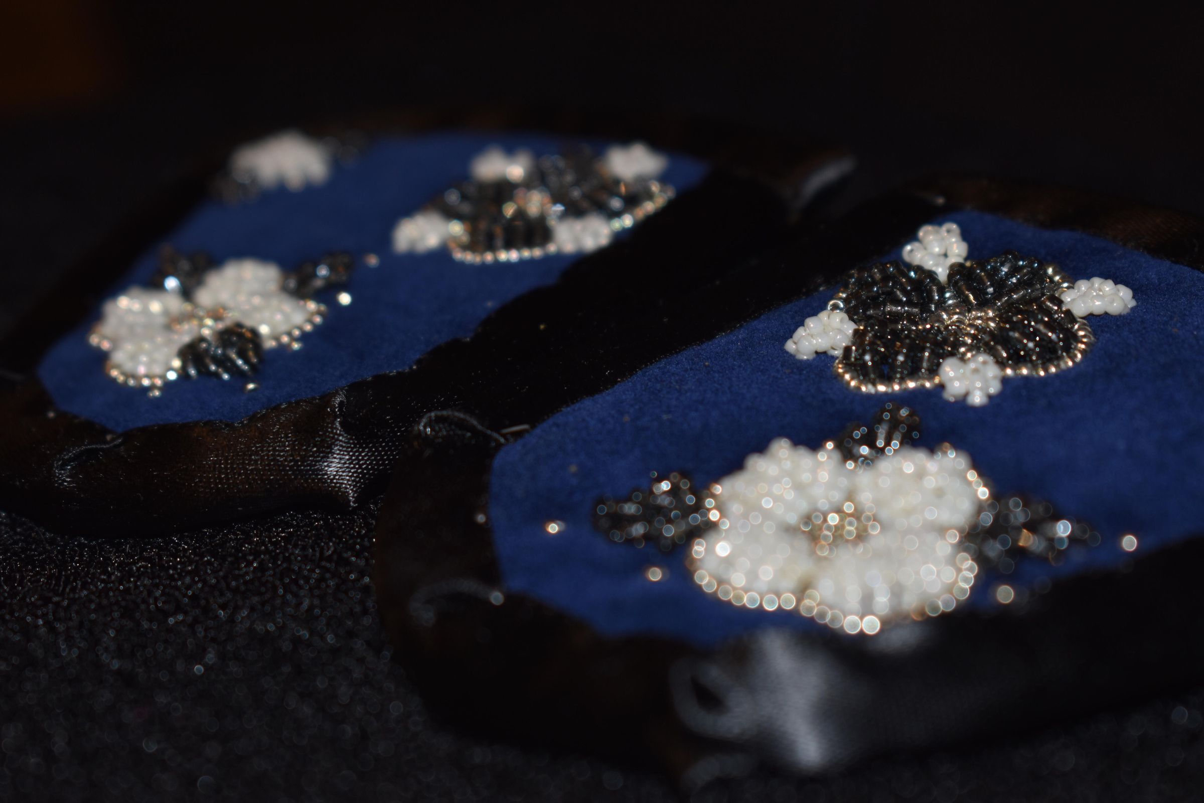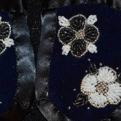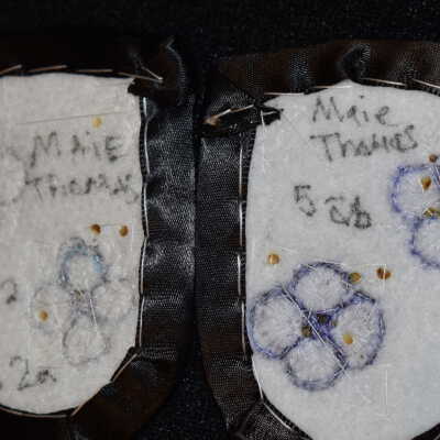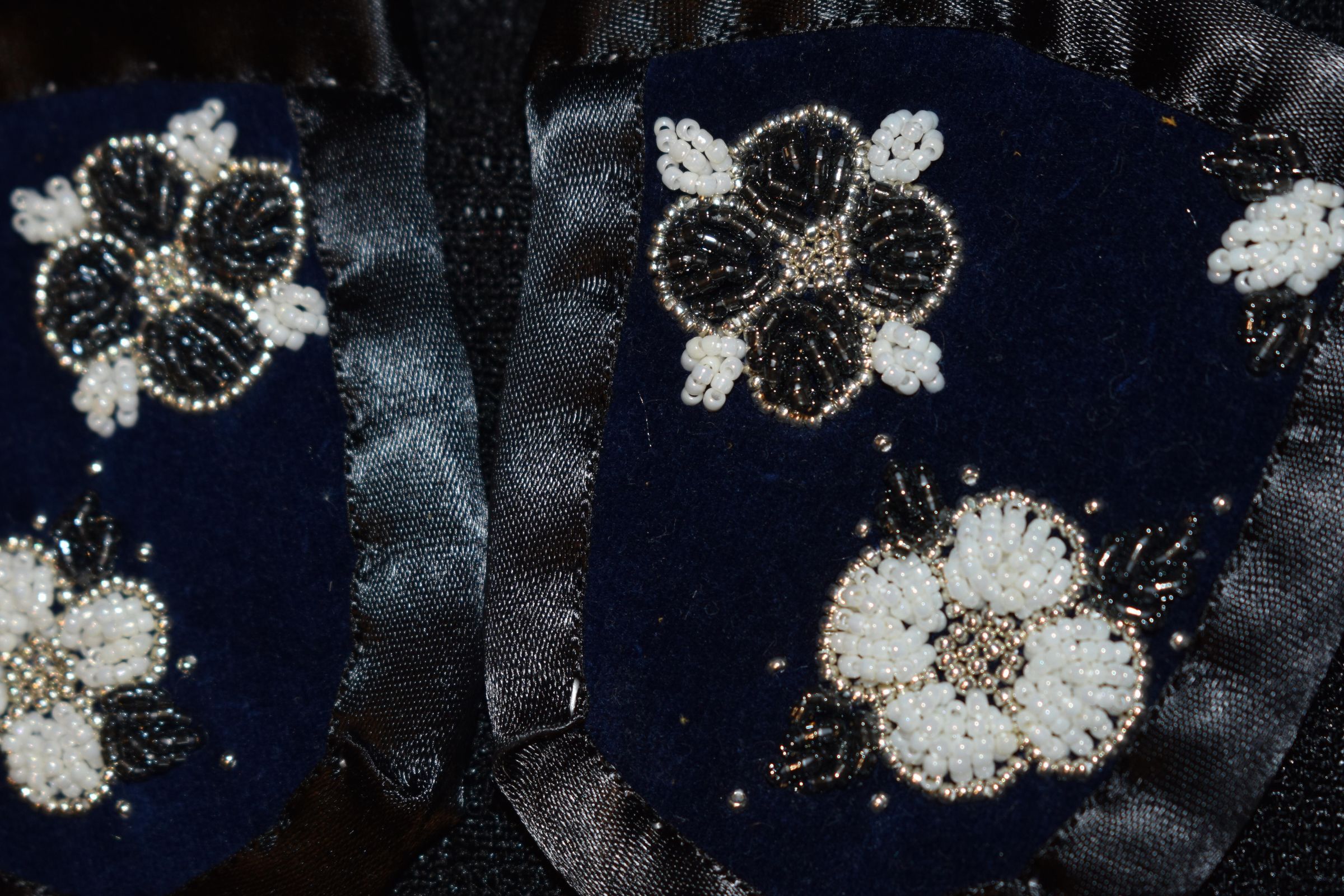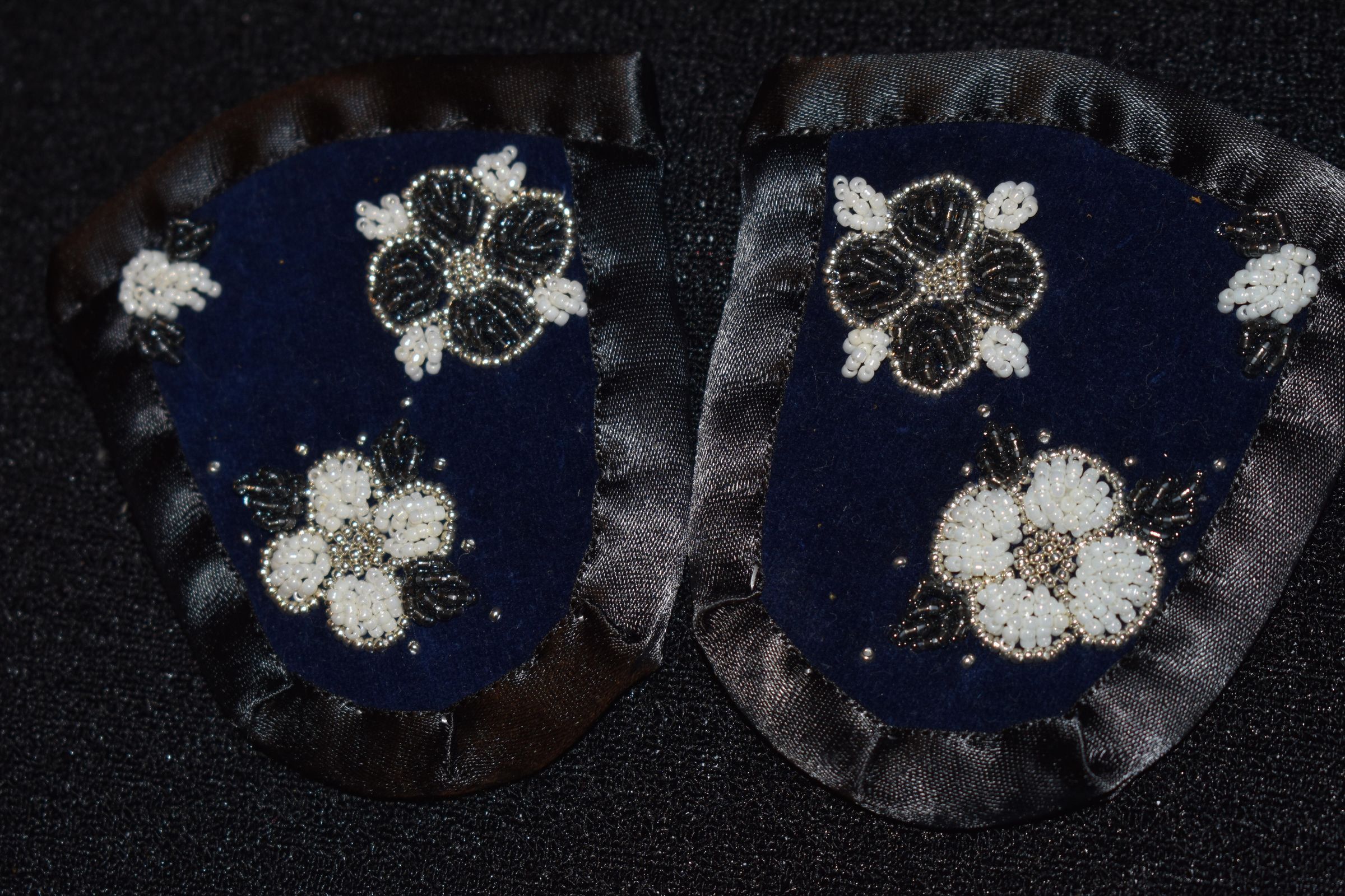 Vamps donated by Kanohkwahawi- Lorna Maie Thomas. Silver glass seed beads were used, as well as white and dark grey glass delica beads. Beaded on pellon and velveteen, with ribbon edging. Flowers and leaves are raised beadwork.