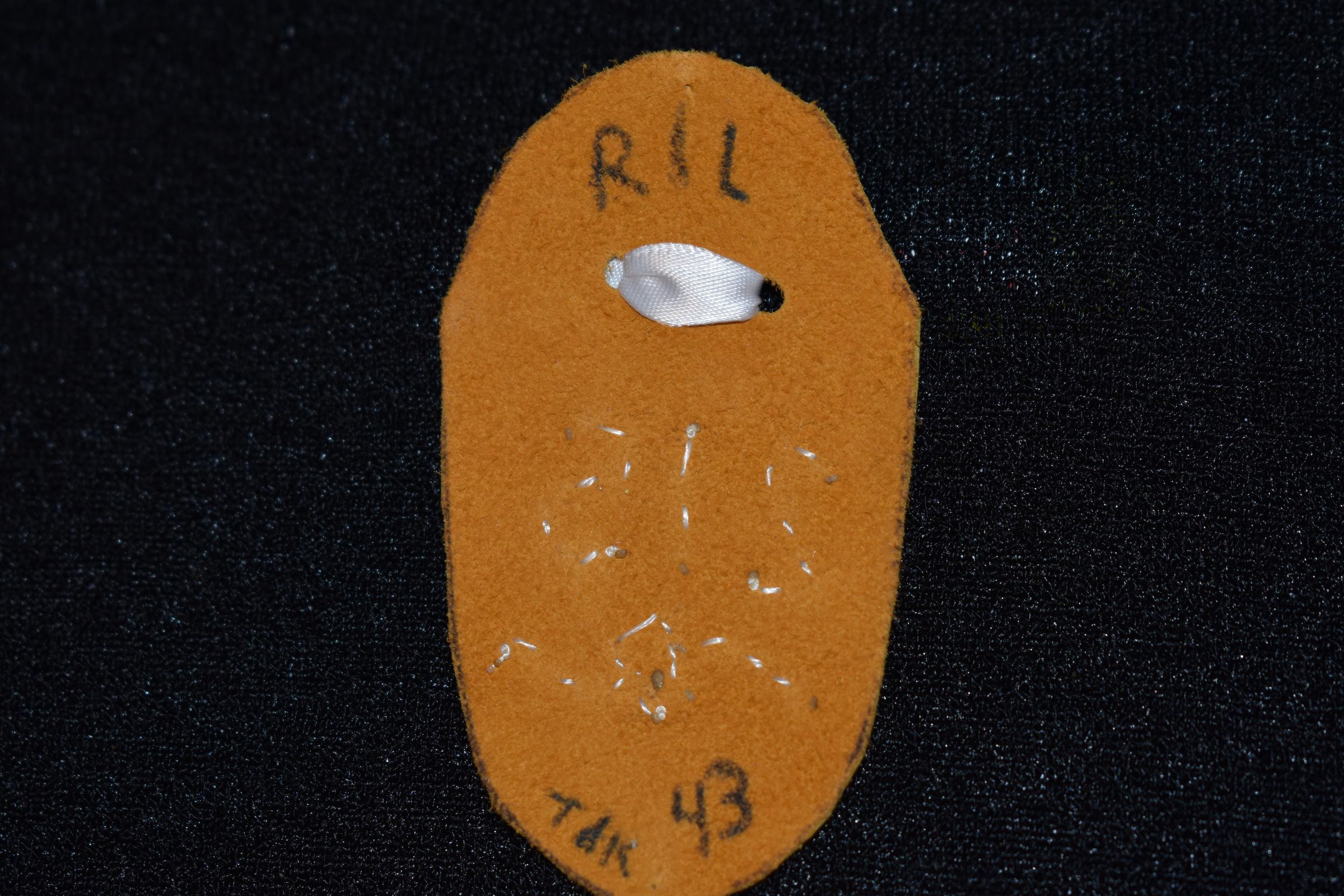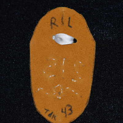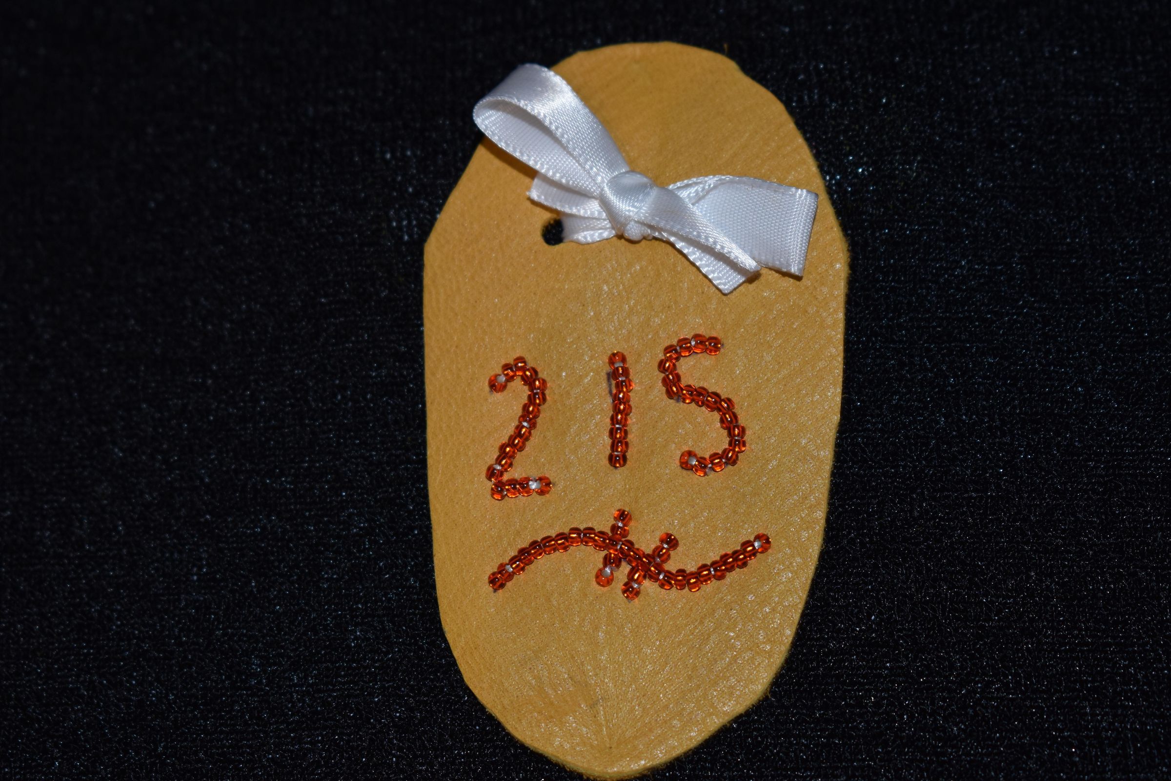 Orange glass seed beads were used to create 215. Ribbon is tied in a bow on top. Beaded on leather.Cataloged By