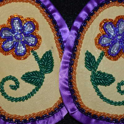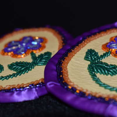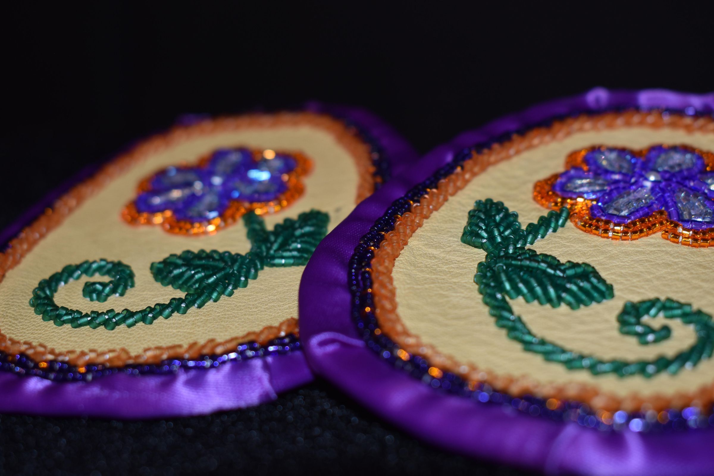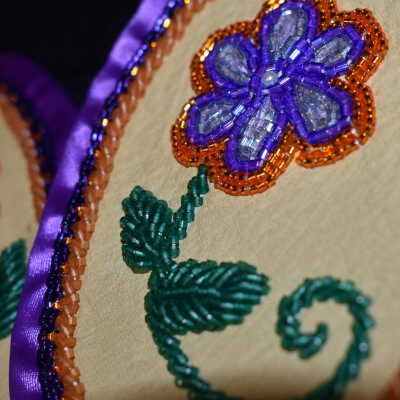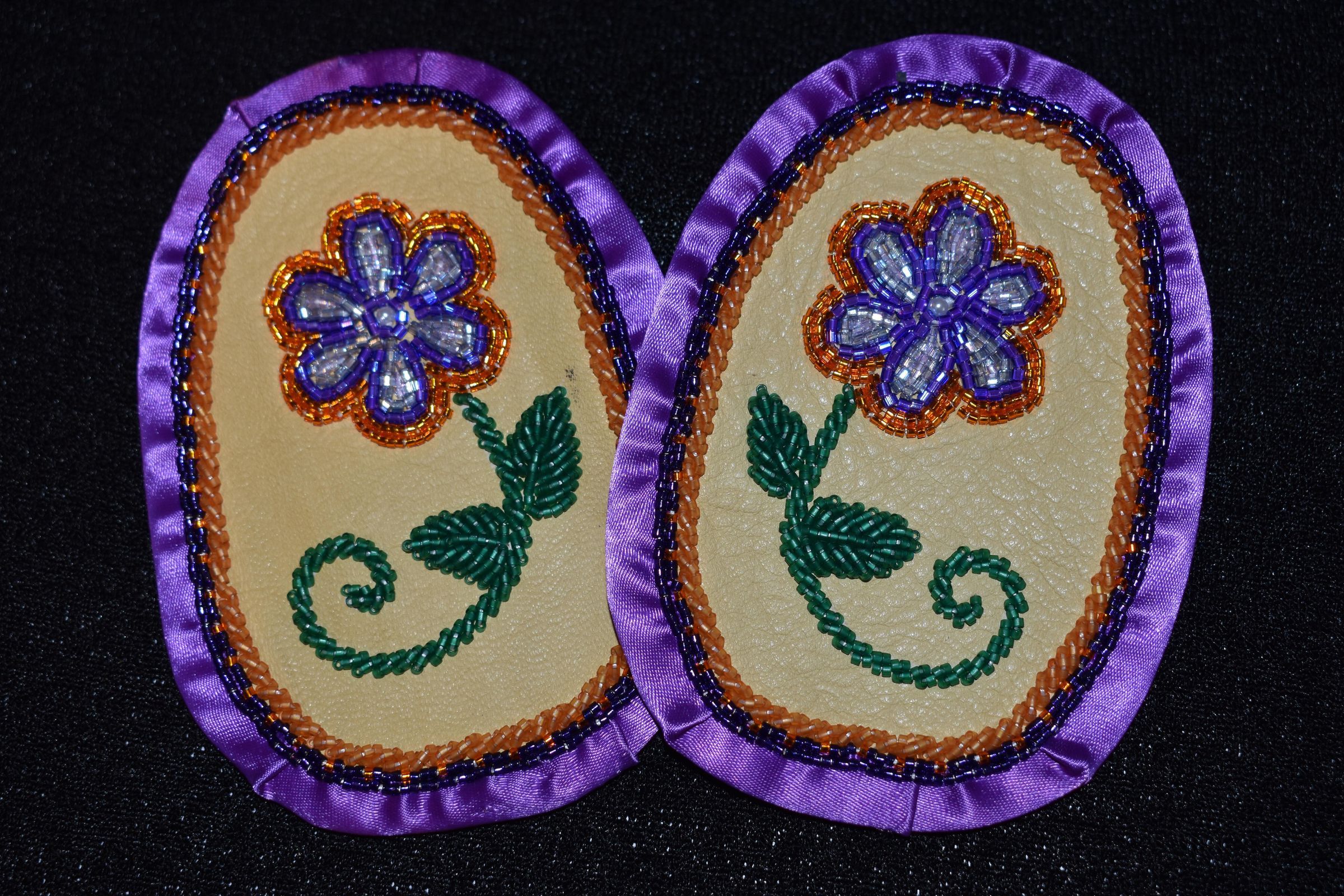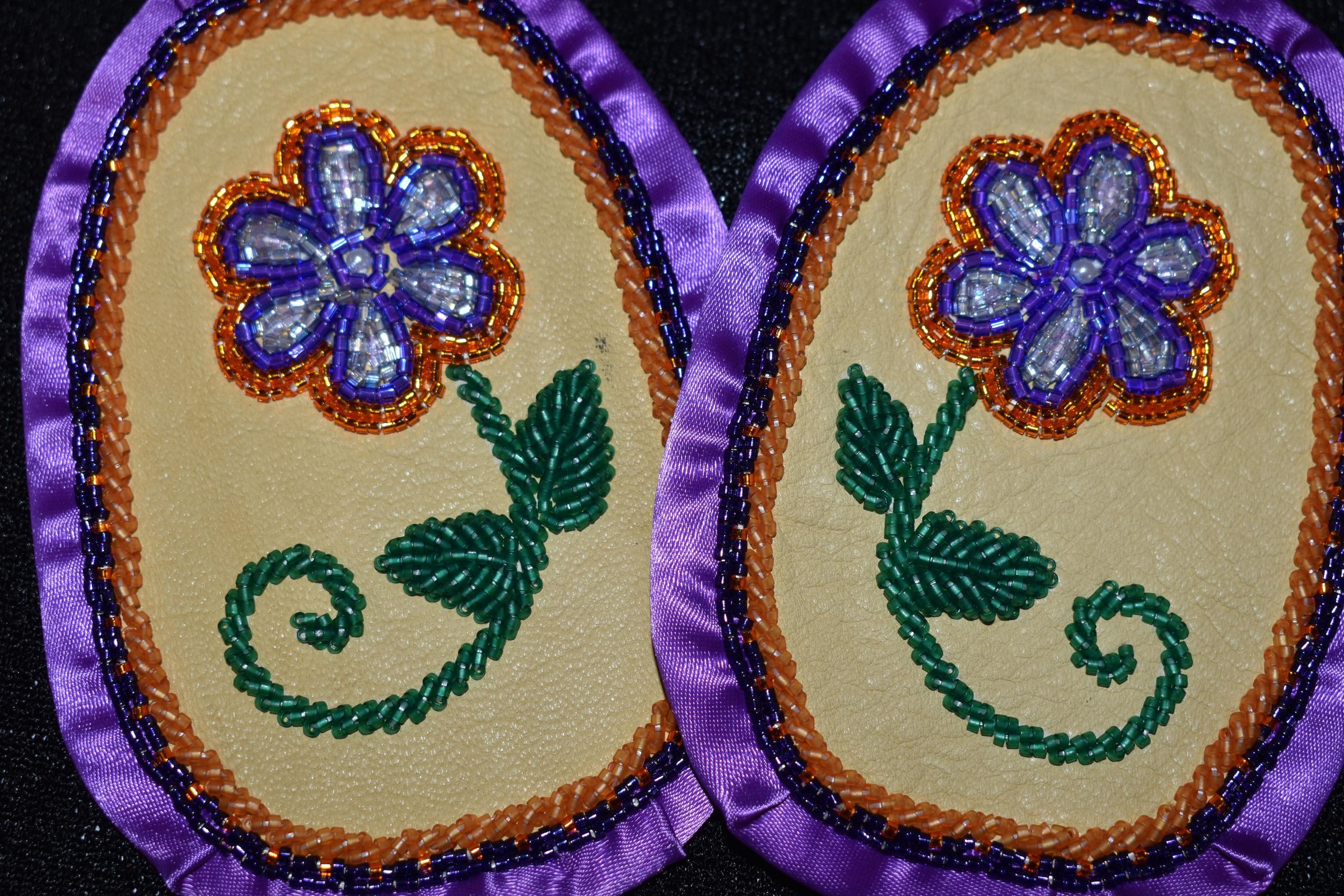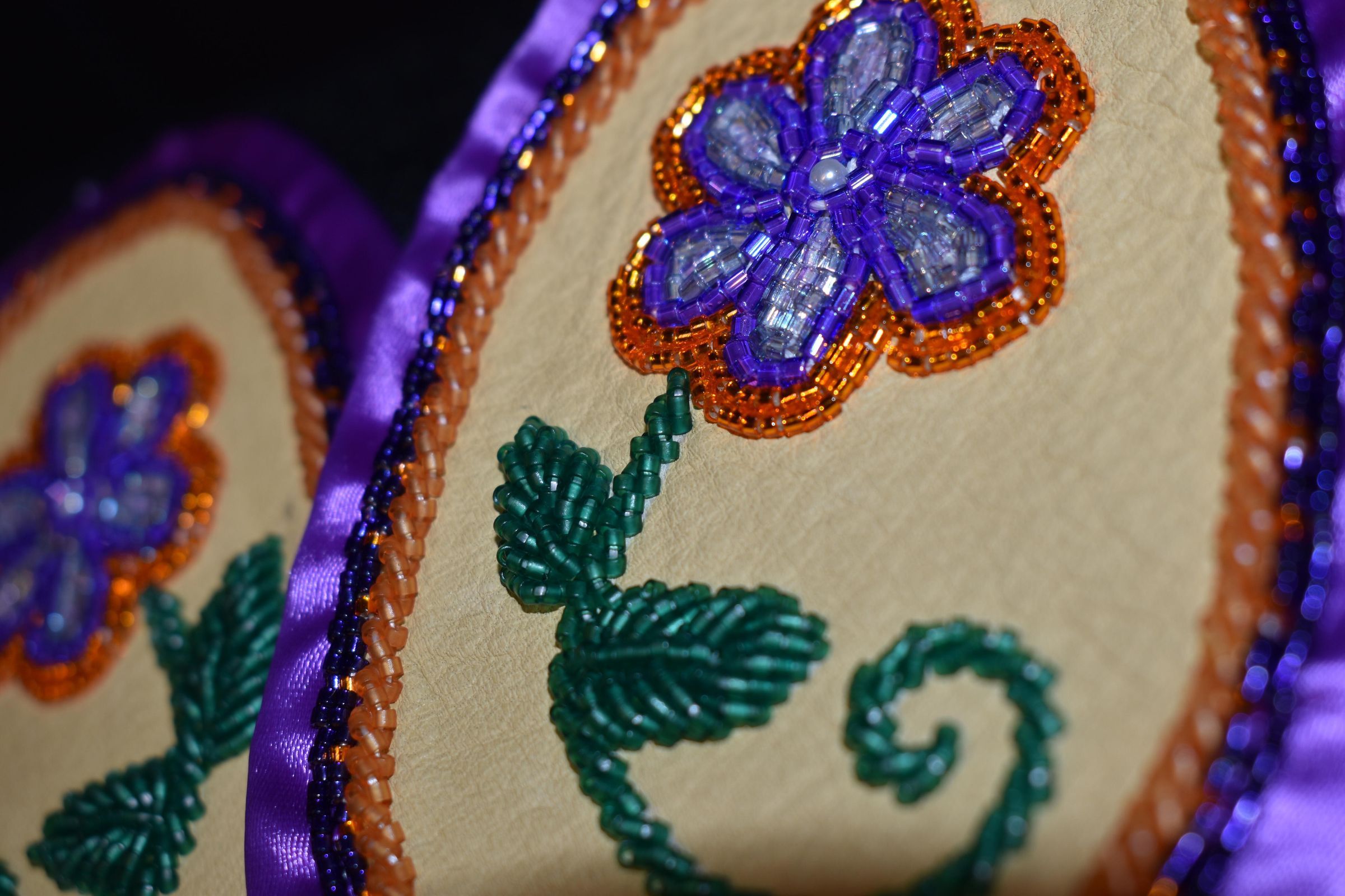 purple and orange glass delica beads were used for the flower and along the ribbon, green glass delica bead were used for the stem and leaves. Bead on leather with ribbon edging, and calico material backing.Cataloged By