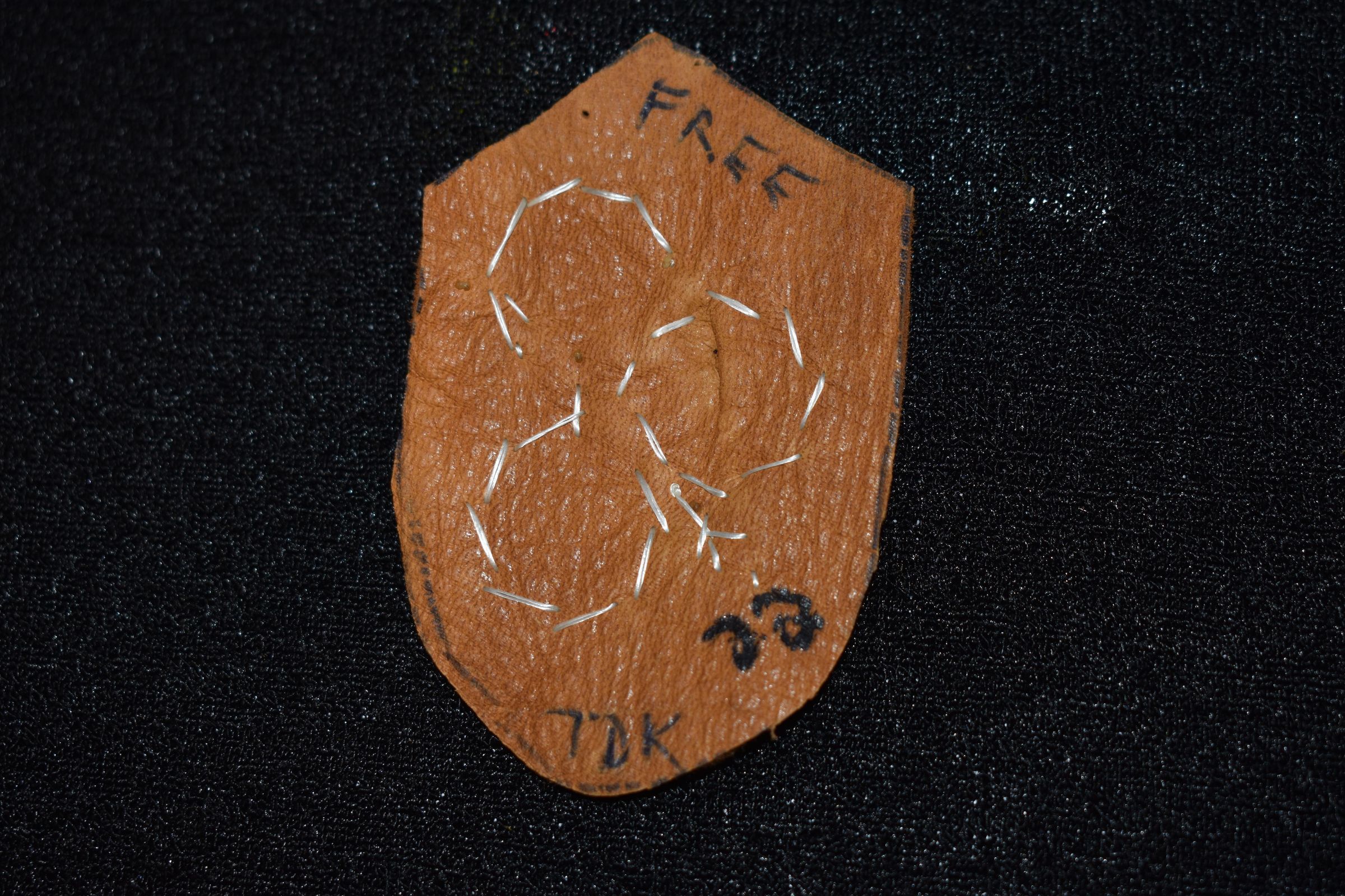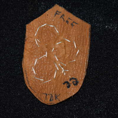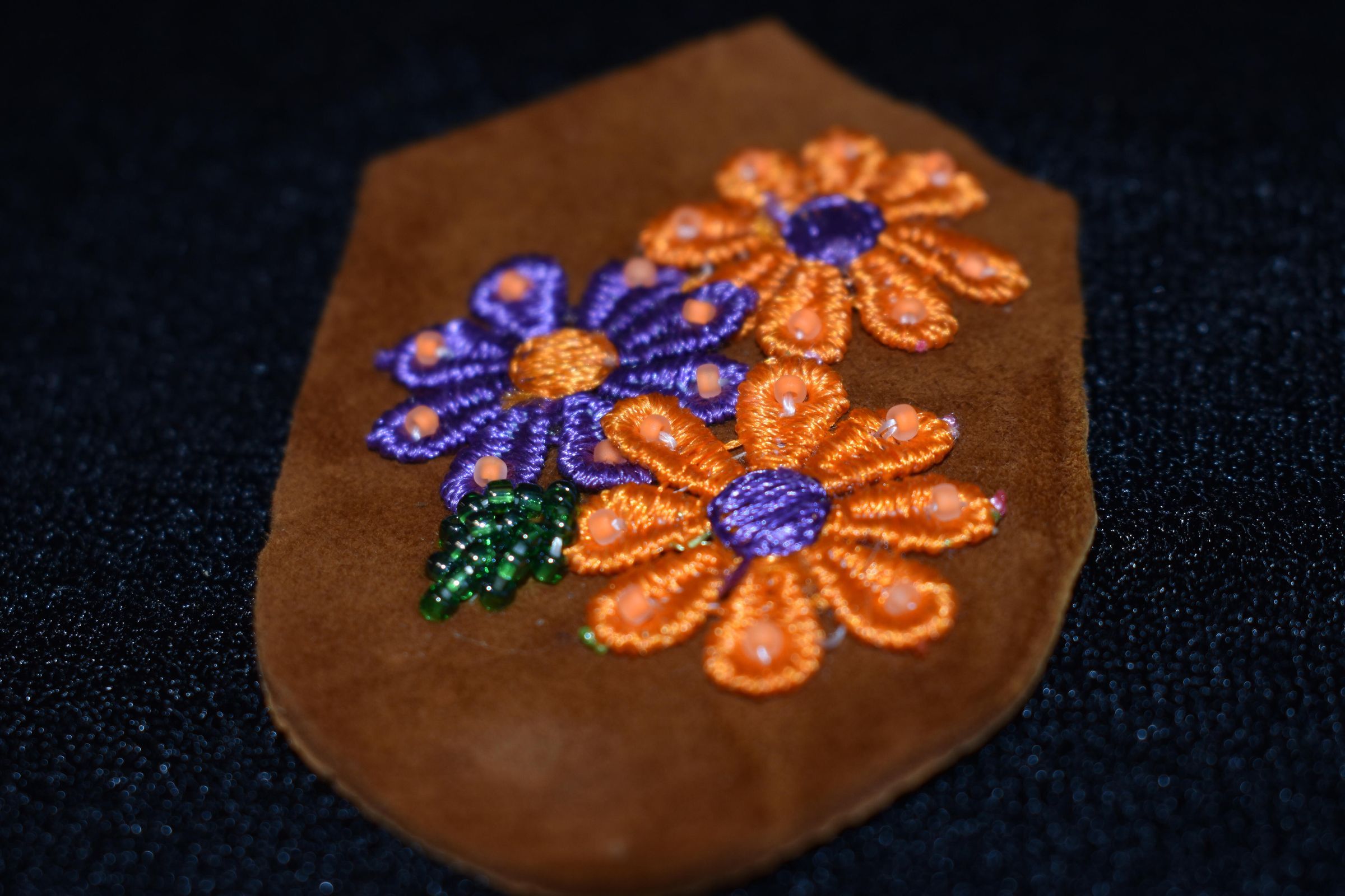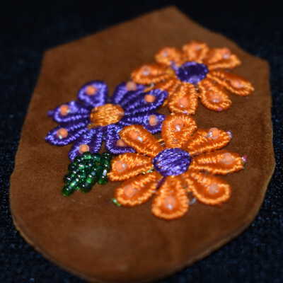 Orange and purple embroidered flowers. Green glass seed beads used for the leaf. All attached to leather.Cataloged By
