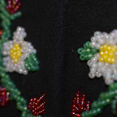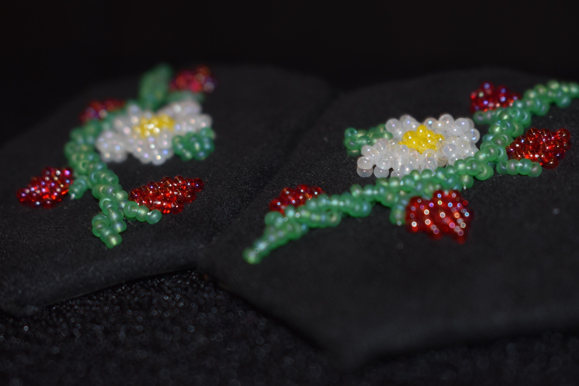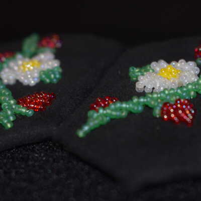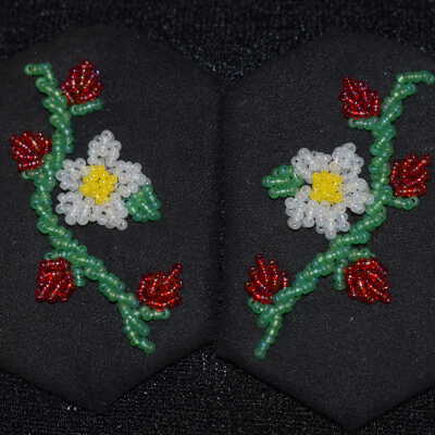Yellow glass seed beads were used for the flower centres, white glass seed beads were used for the flower, green glass seed beads were used for the stems and leaves, red glass seed beads were used for the strawberries.Cataloged By