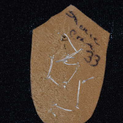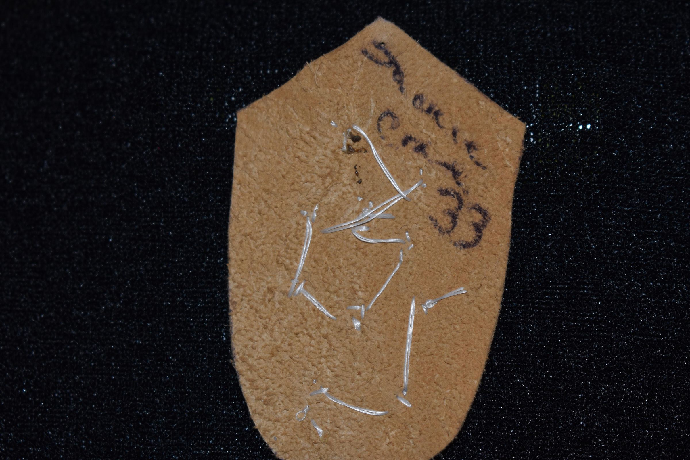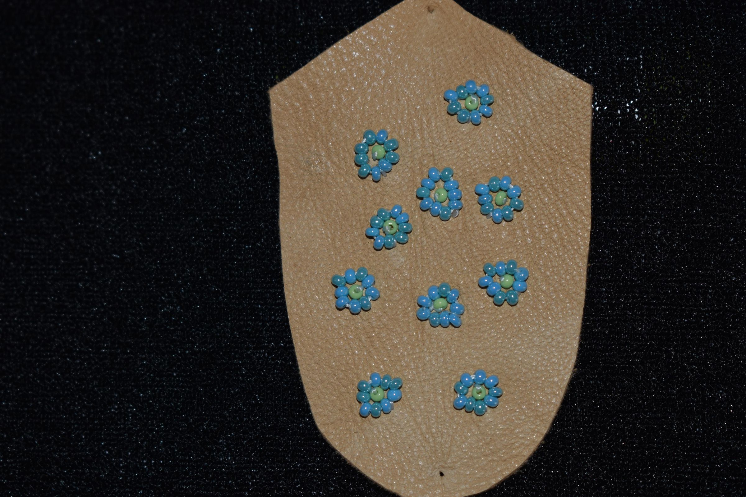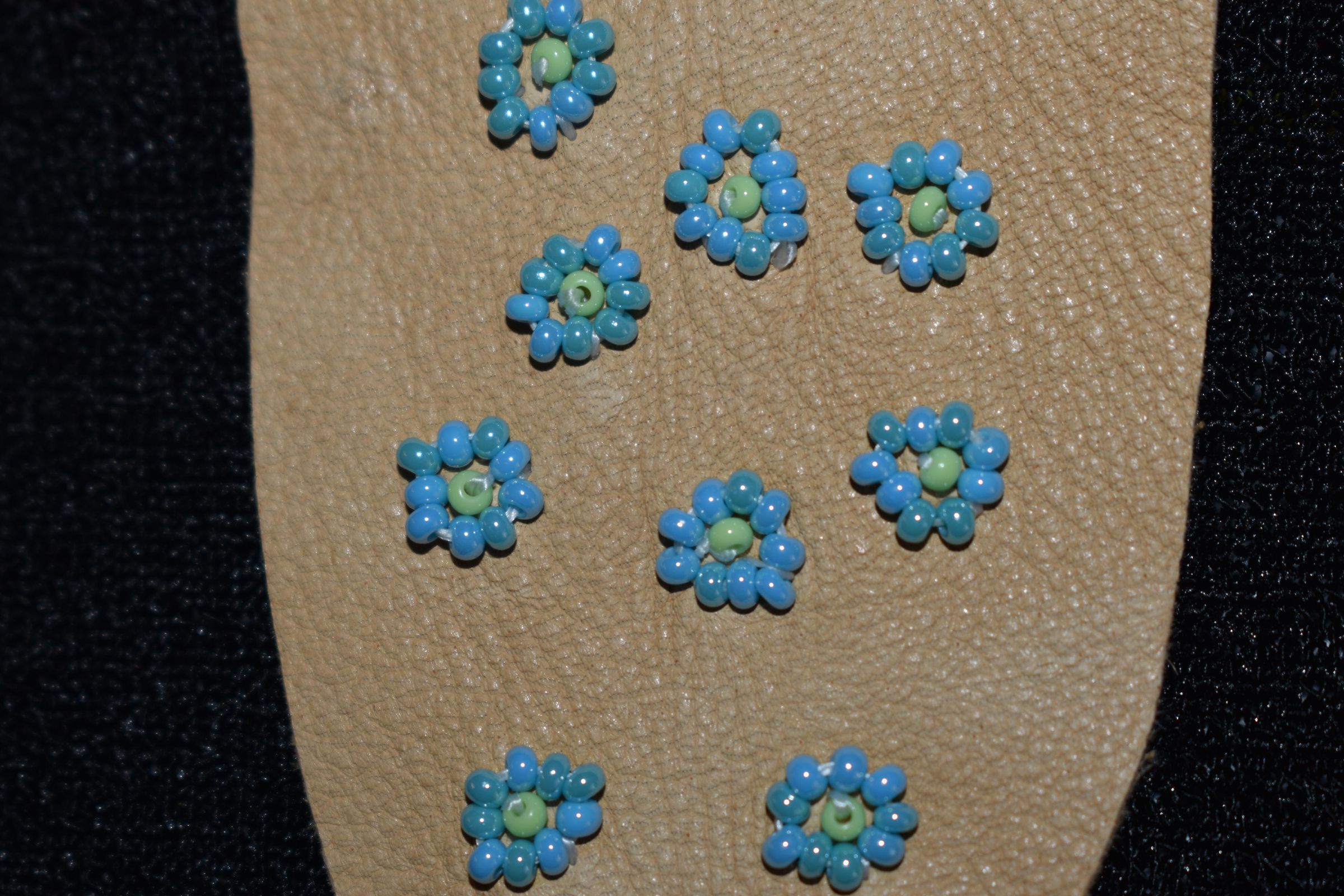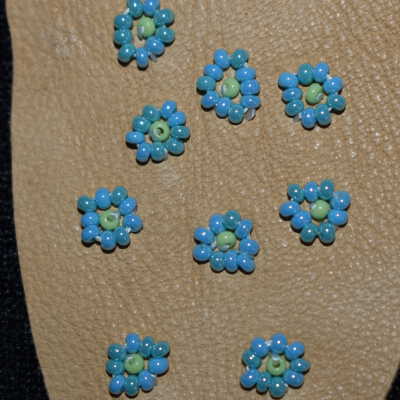 Vamp donated by Jackie Cree. blue and green glass seed beads were used to create small patches of flowers.