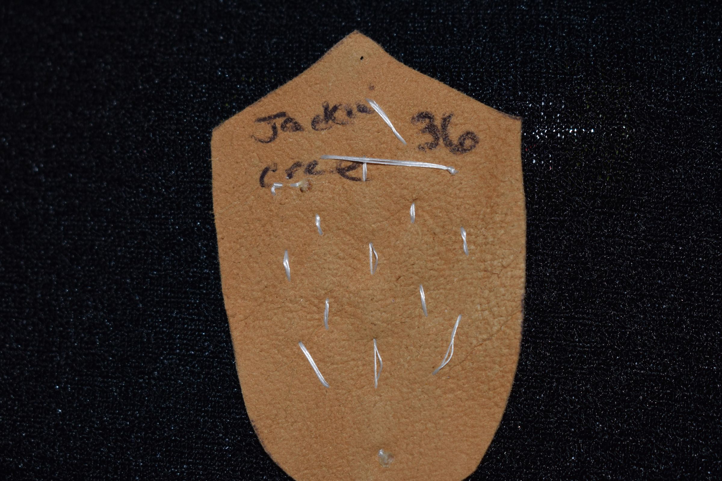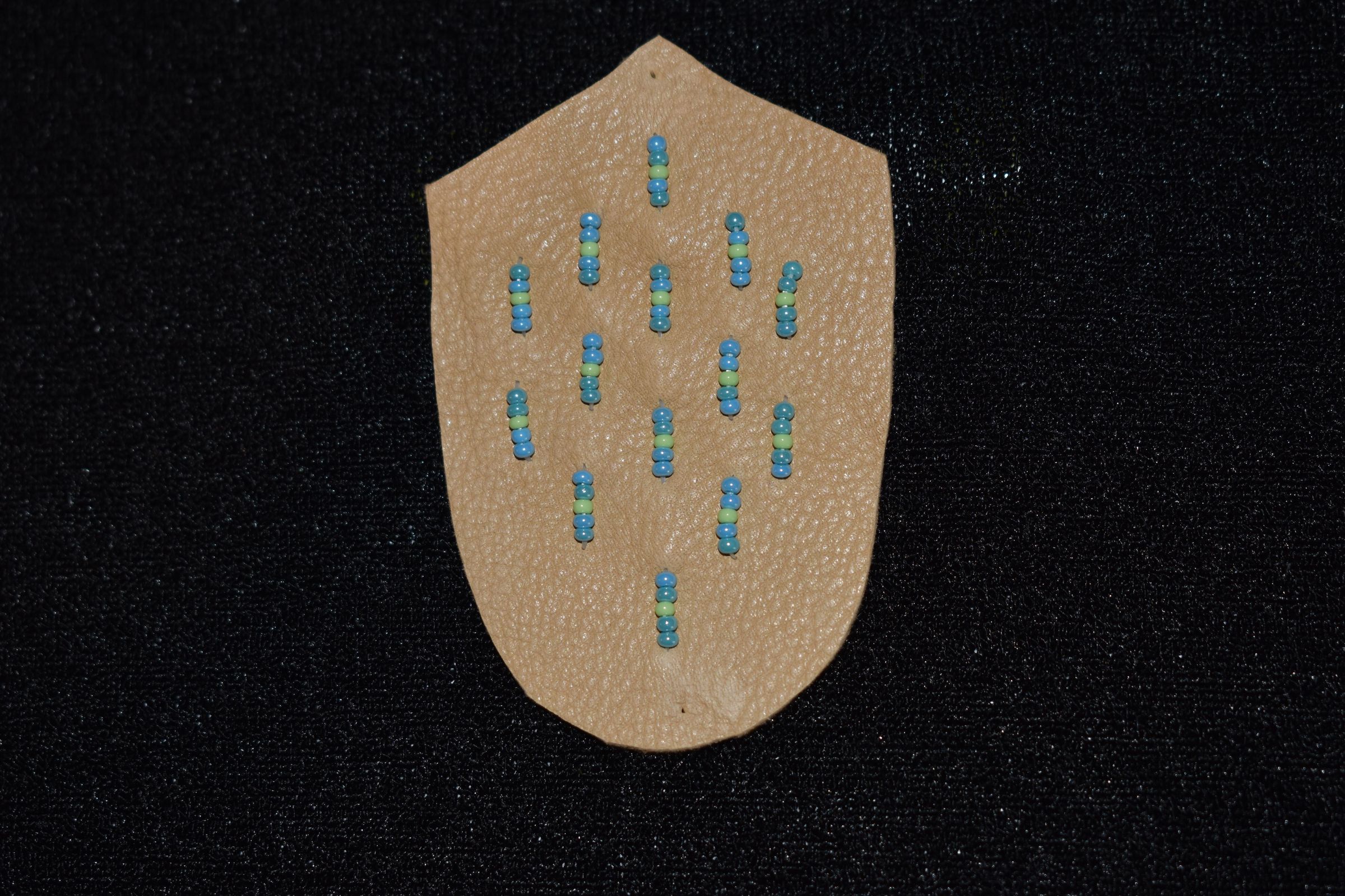 Vamp donated by Jackie Cree. blue and green glass seed beads were sued on tan leather.