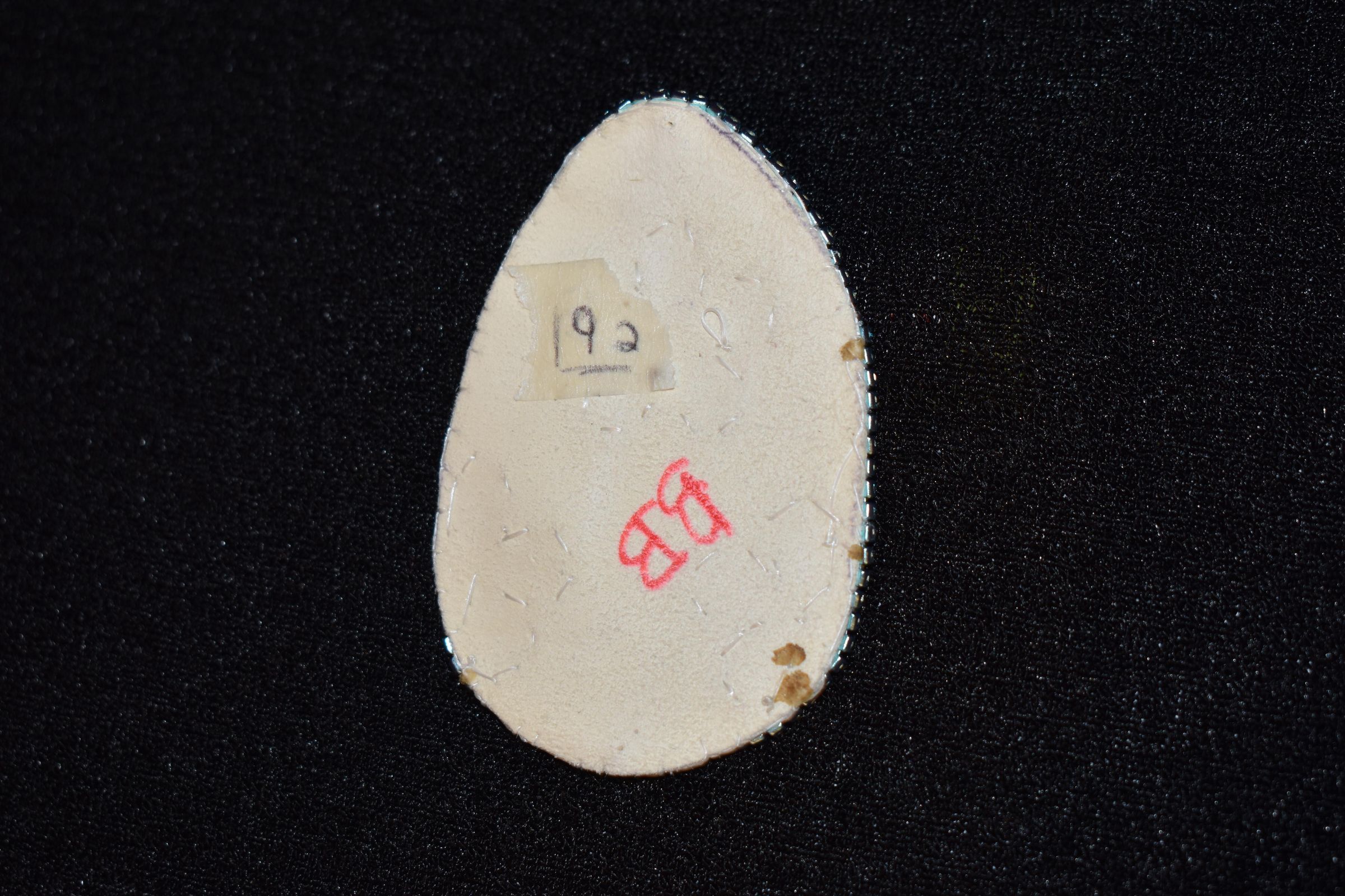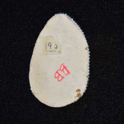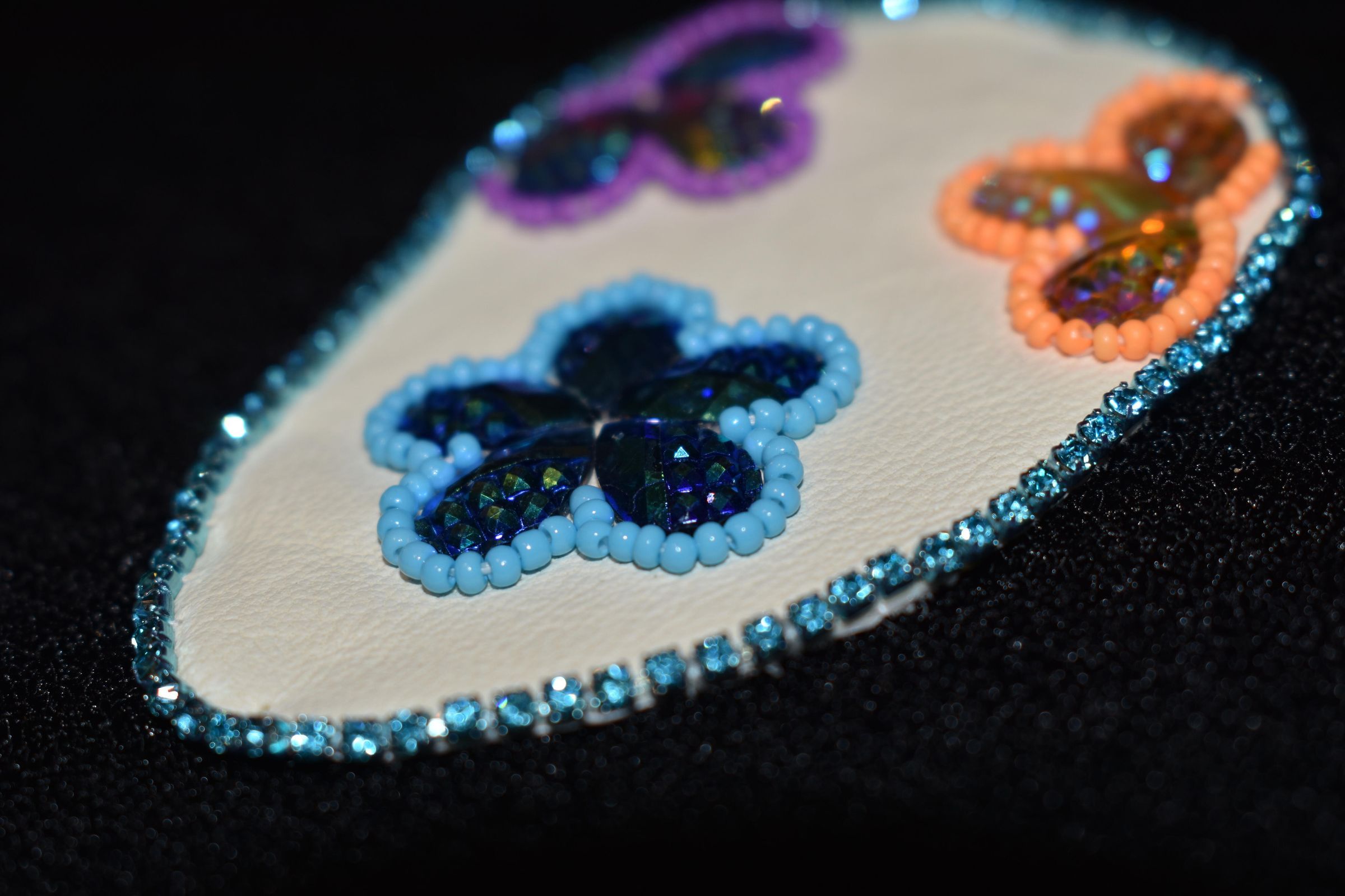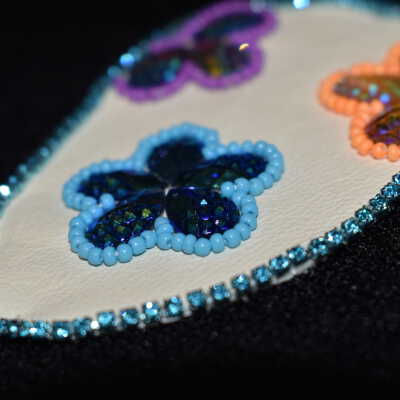 Gem centres were used for the flower with purple, blue, and orange glass seed beads. Blue rhinestone banding along on the edge. Beaded on vinyl.Cataloged By