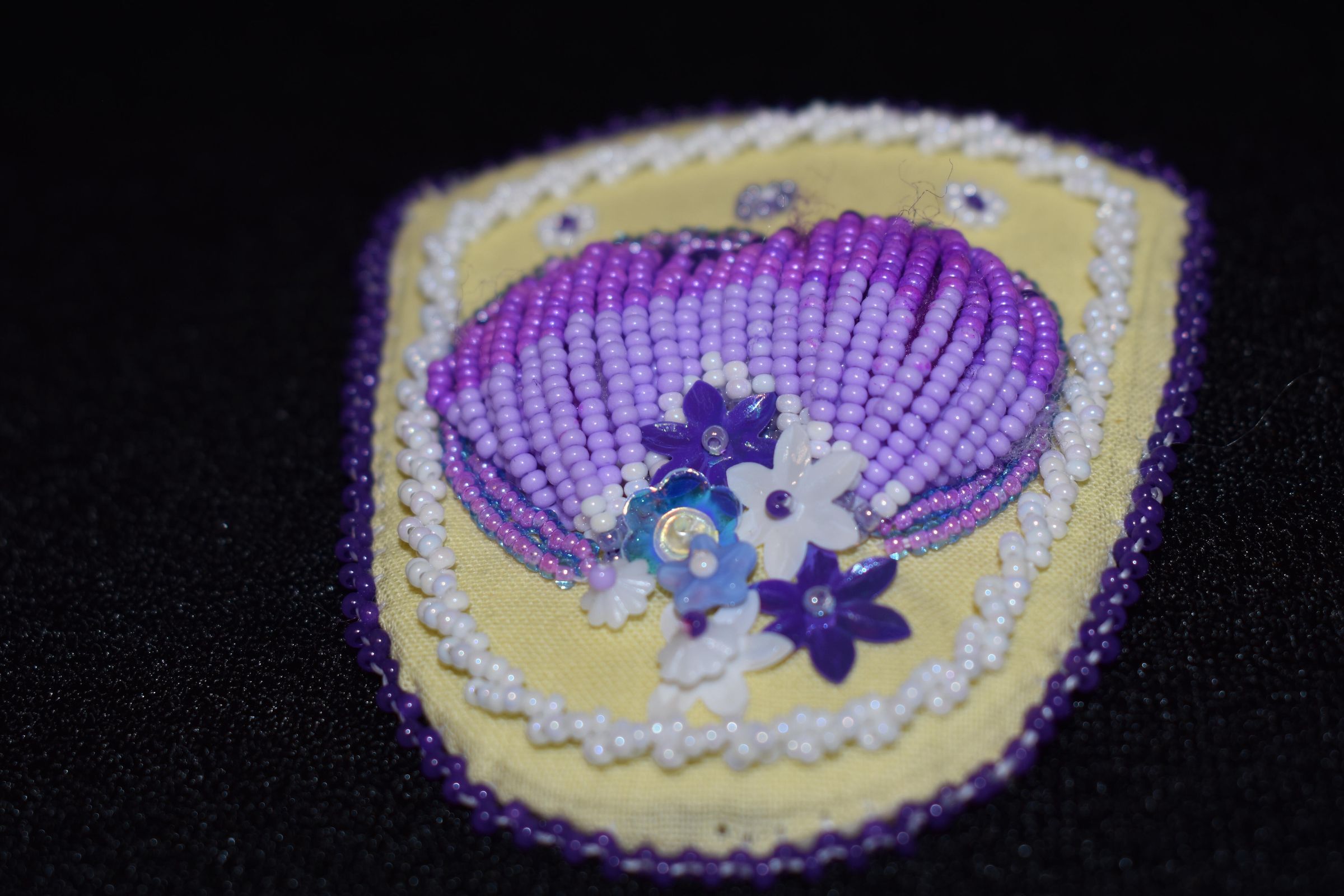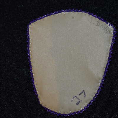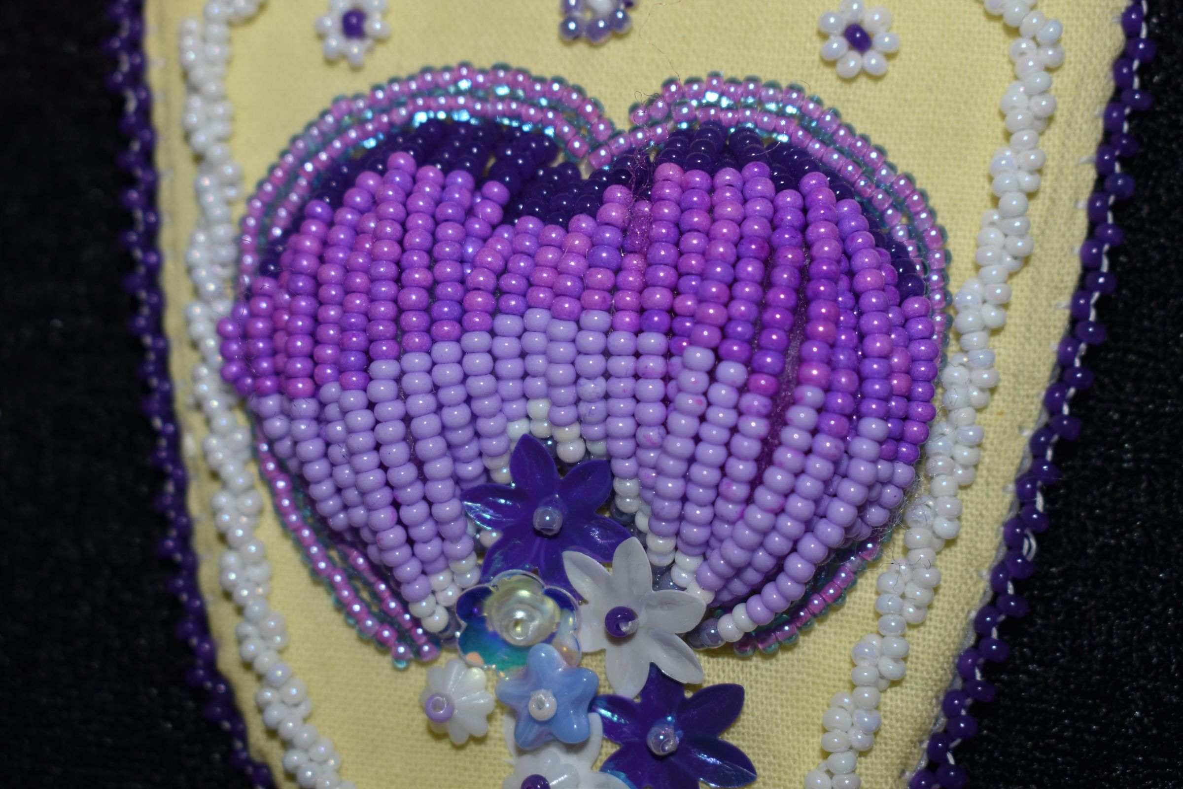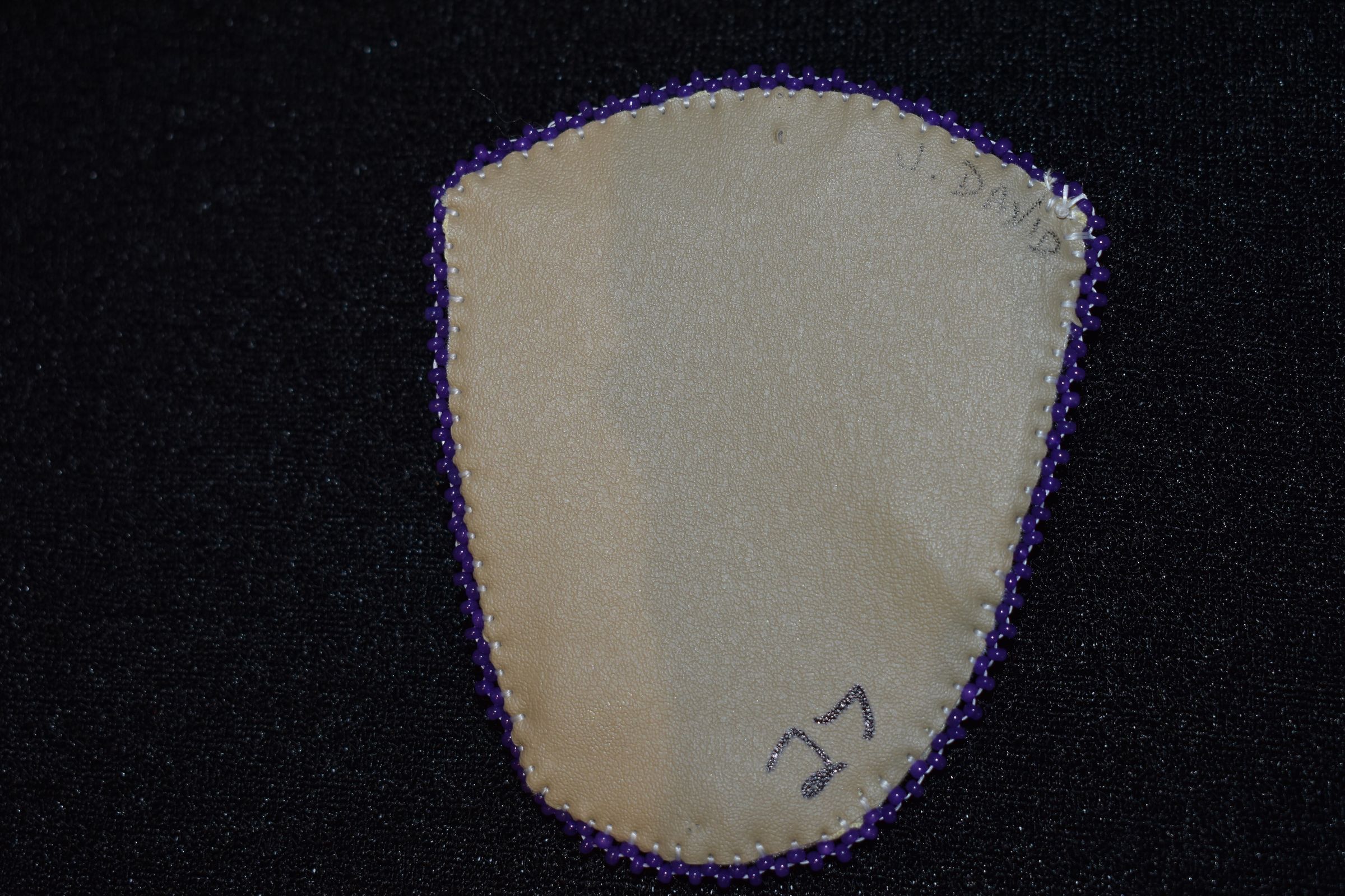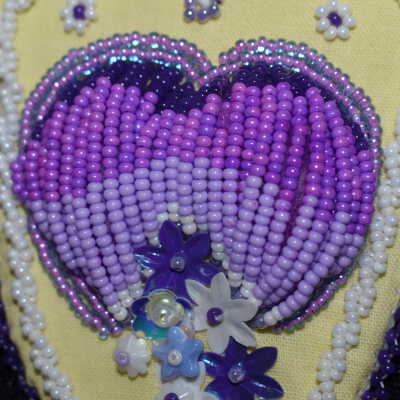 Purple beads used to create a raised heart. Flower shaped sequins were used to create flowers at the bottom of the heart. White beads are rope stitched around the parameter, and purple beads are used for edging. Beaded on pellon and faux suede.Cataloged By