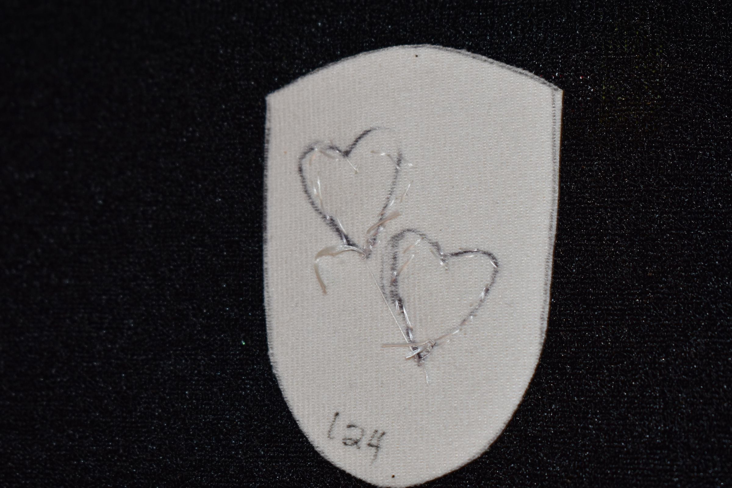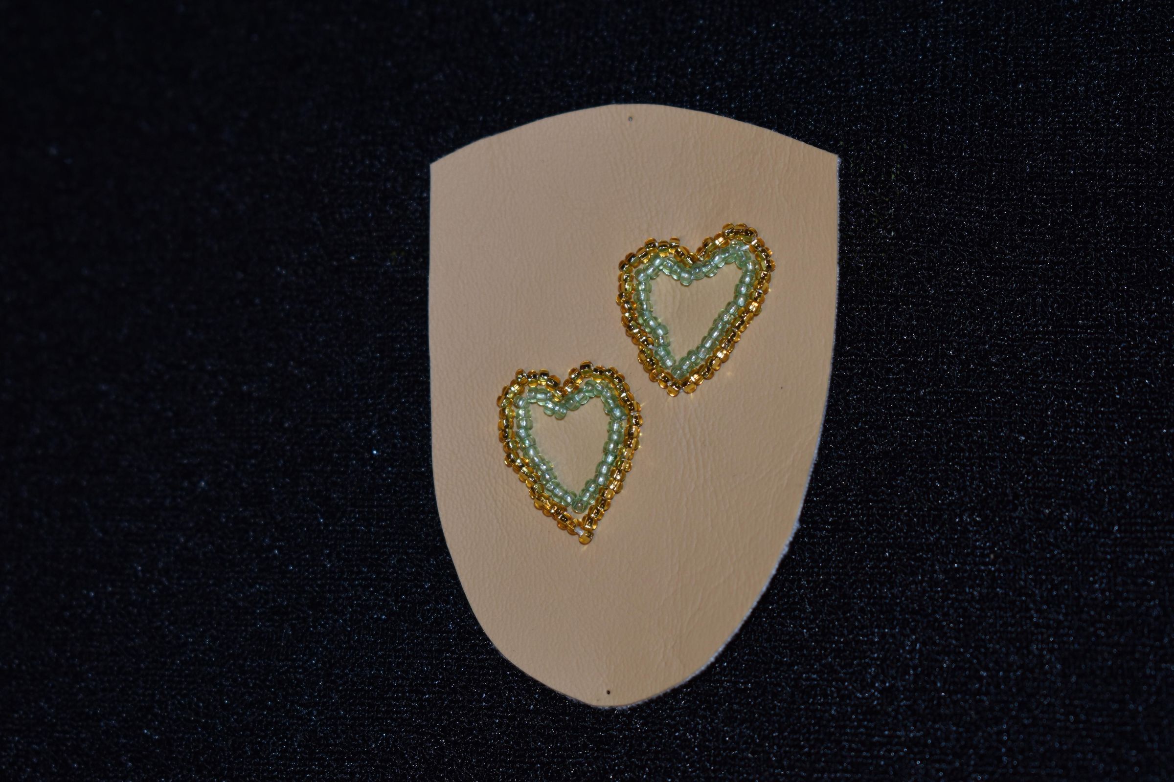 Vamp donated by Jackie Cree. Gold and teal glass seed beads on vinyl.