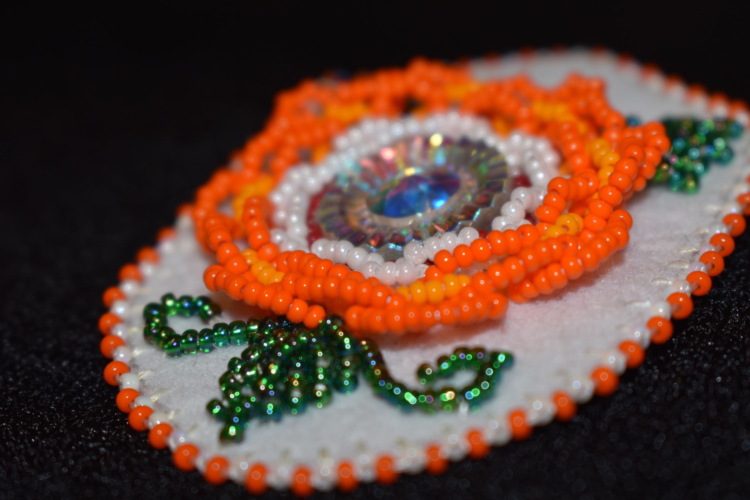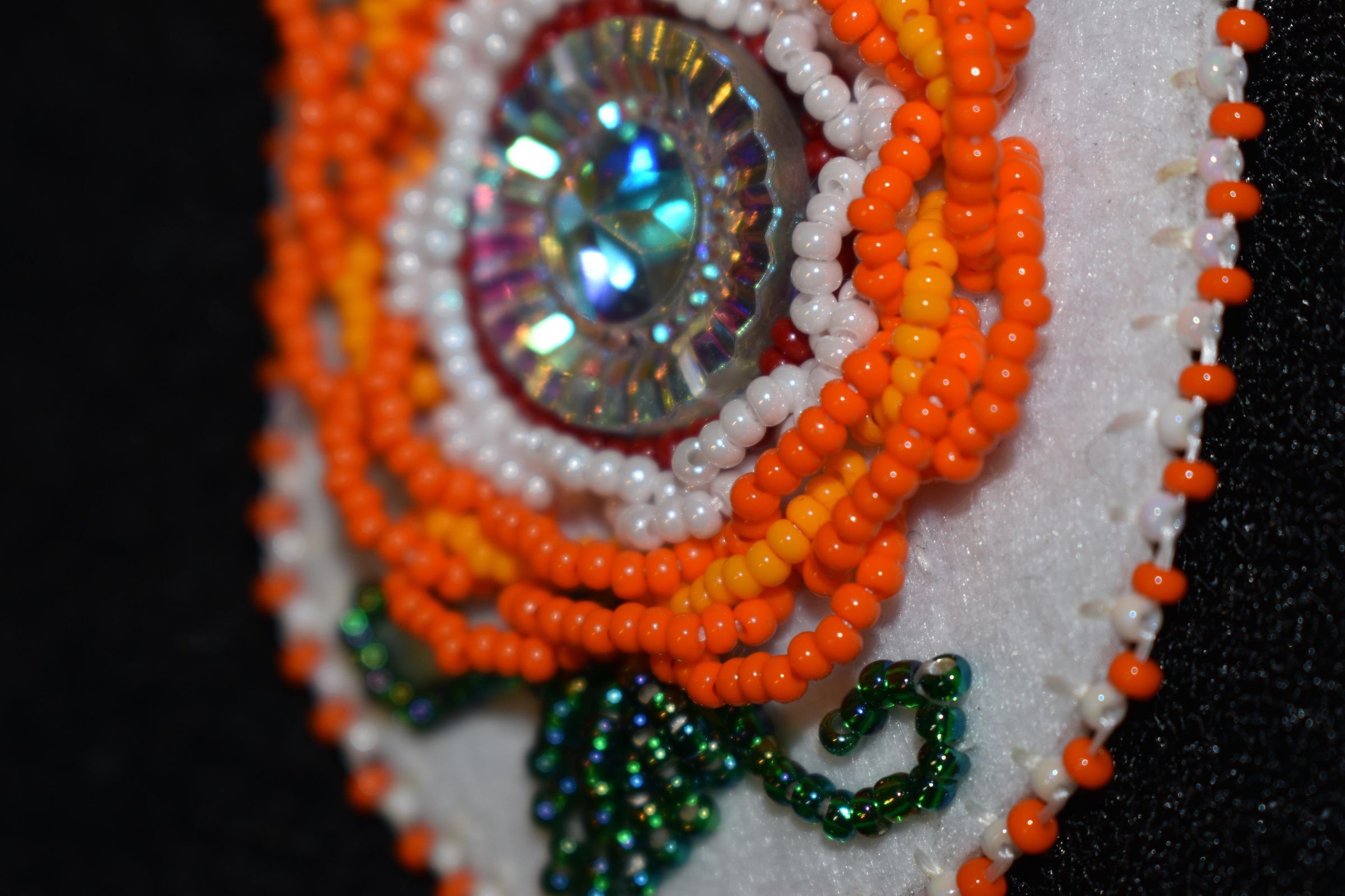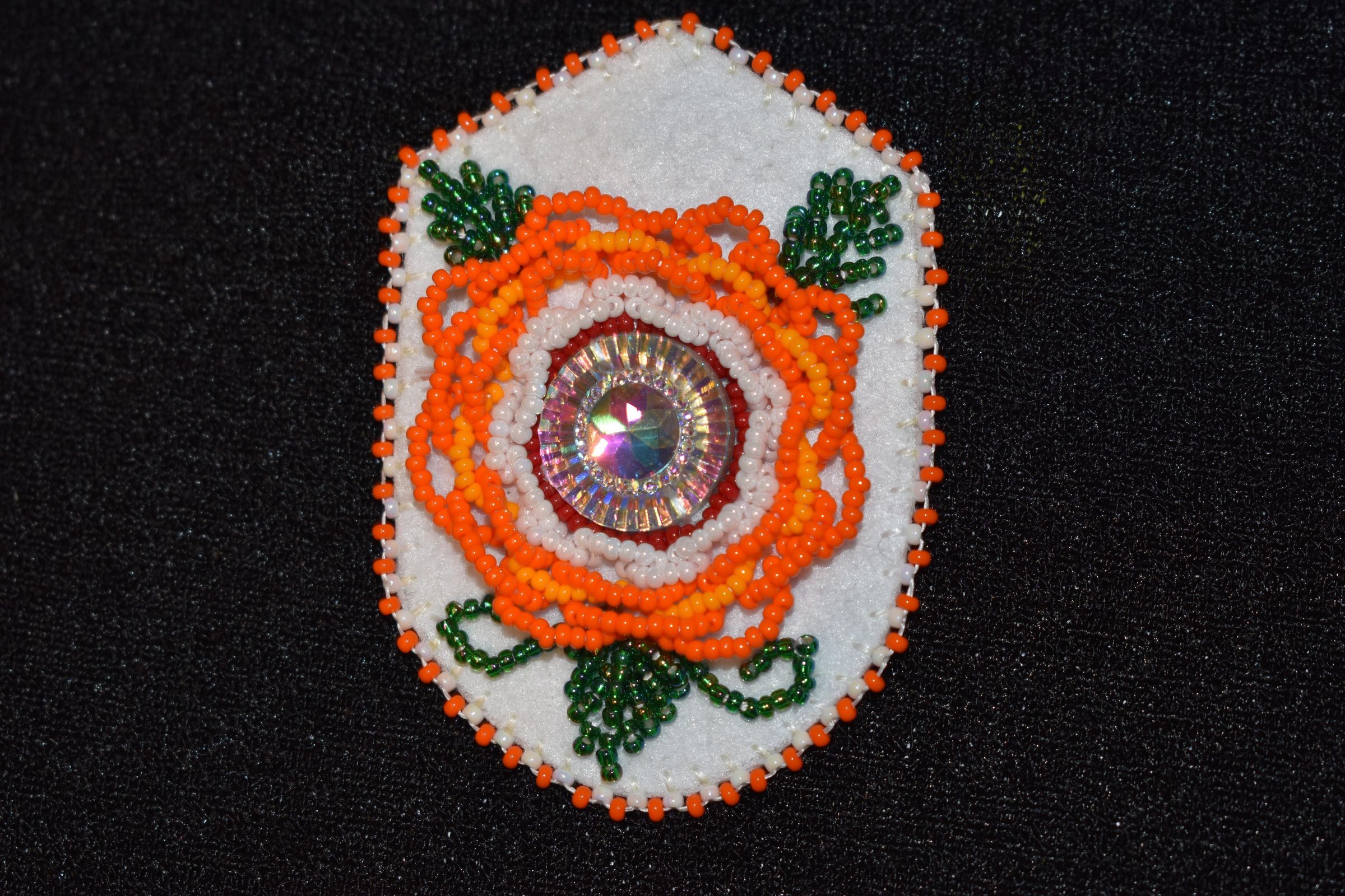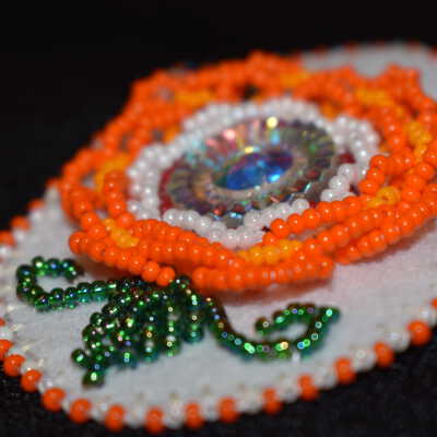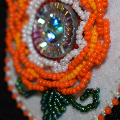 Jewel center, red, white, and orange glass seed beads were used to create the flower. The outer orange petals are lifted slightly. Green glass seed beads were used for the leaves and vines. White and orange glass seed beads were used for the edging. Beaded on pellon and white calico.Cataloged By