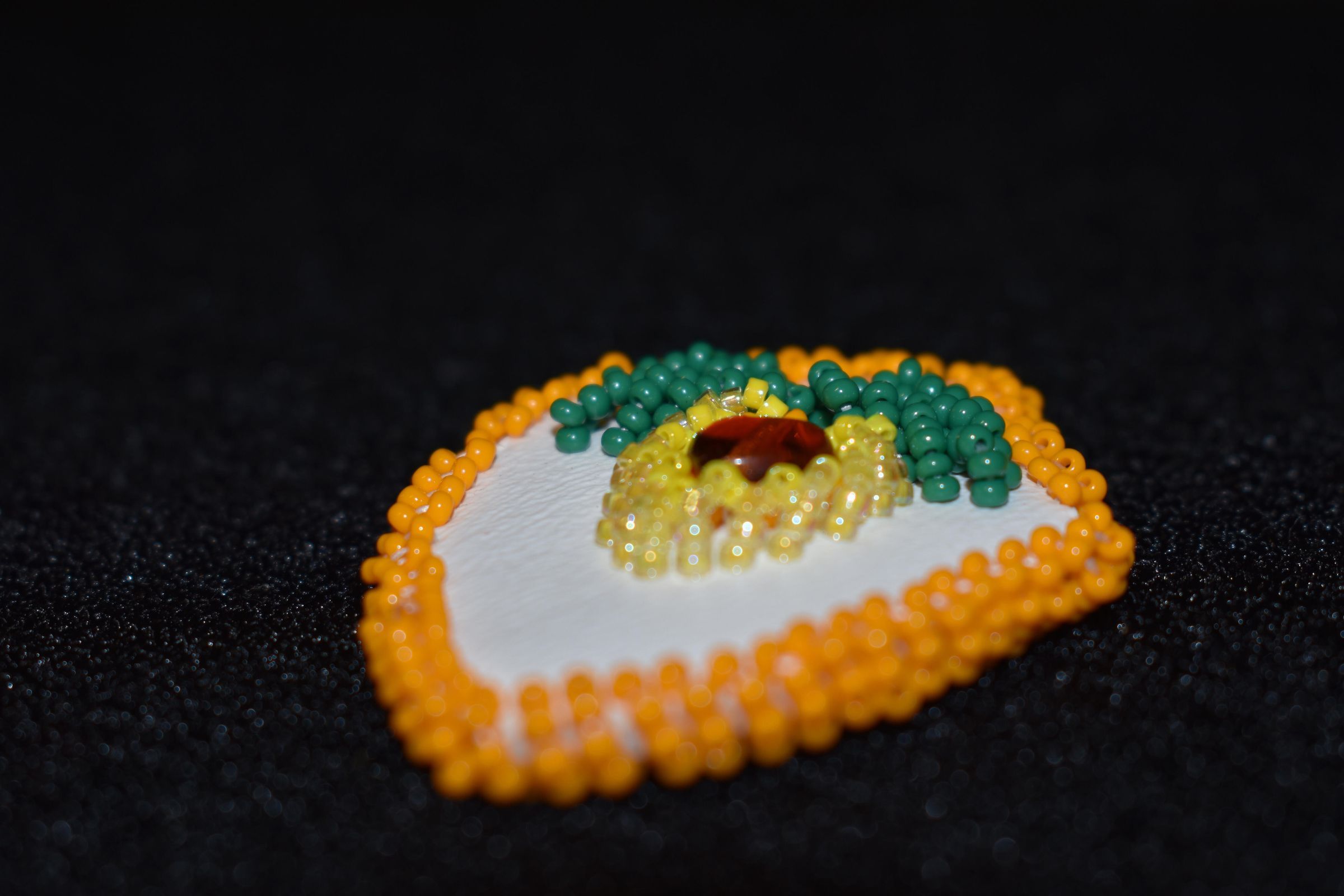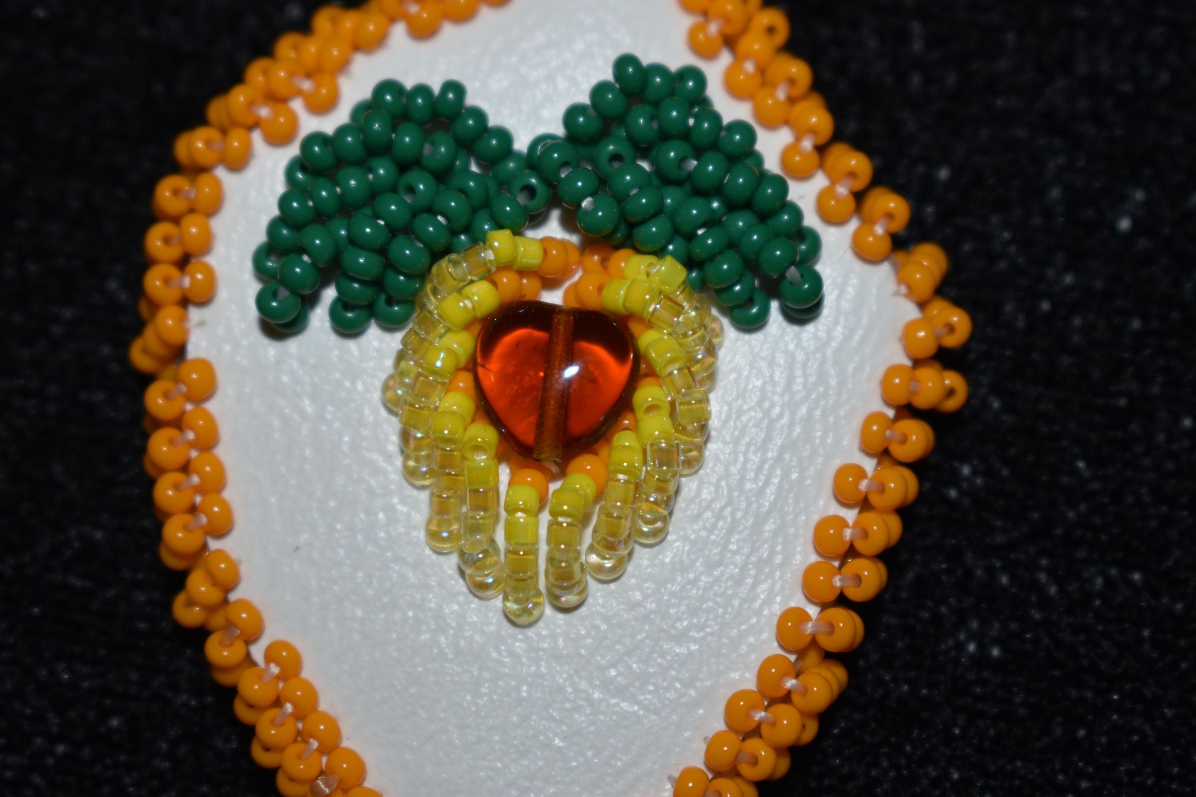 yellow, orange, and green glass seed beads. Beaded on faux leather. Orange centre glass bead.Cataloged By