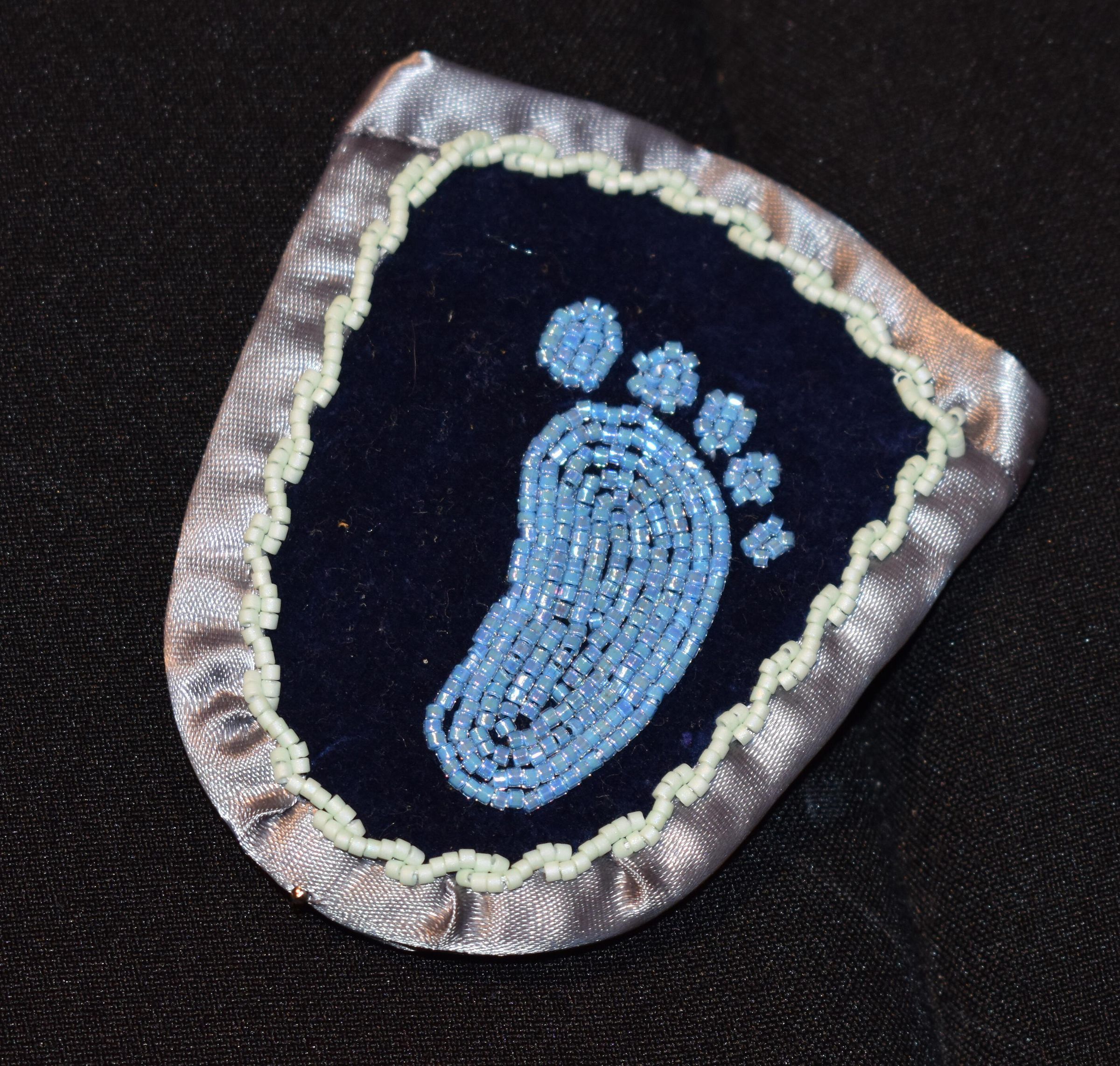 Blue glass delica beads were used for the foot. White glass delica beads were used for along the ribbon. Beaded on melon and velveteen, with grey ribbon edging.Cataloged By