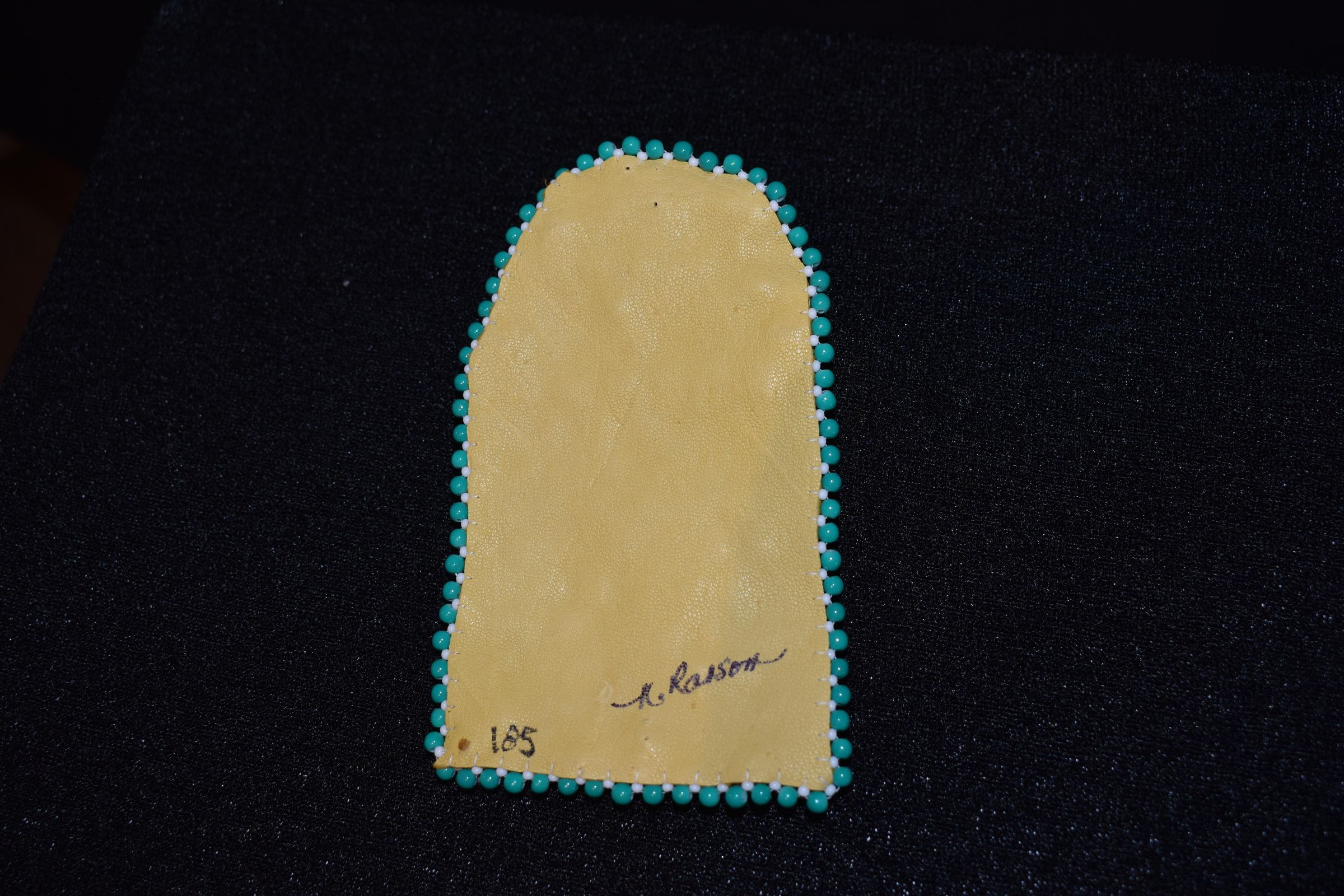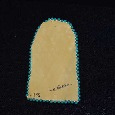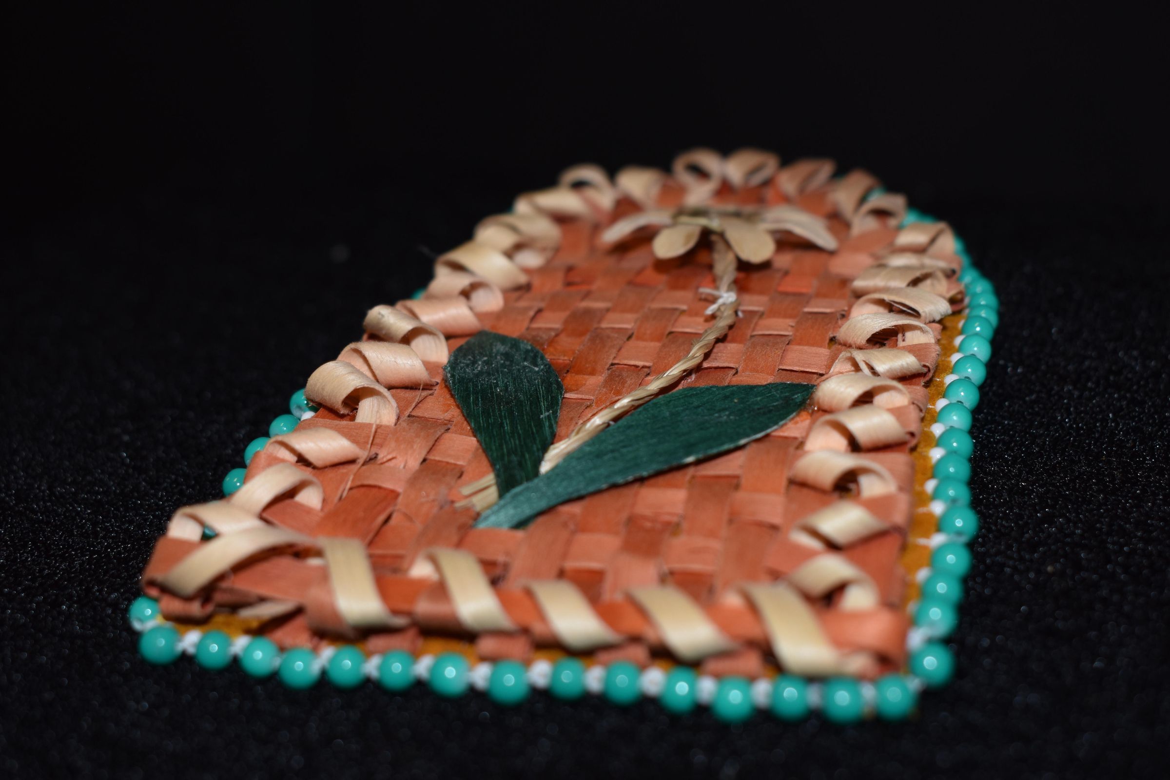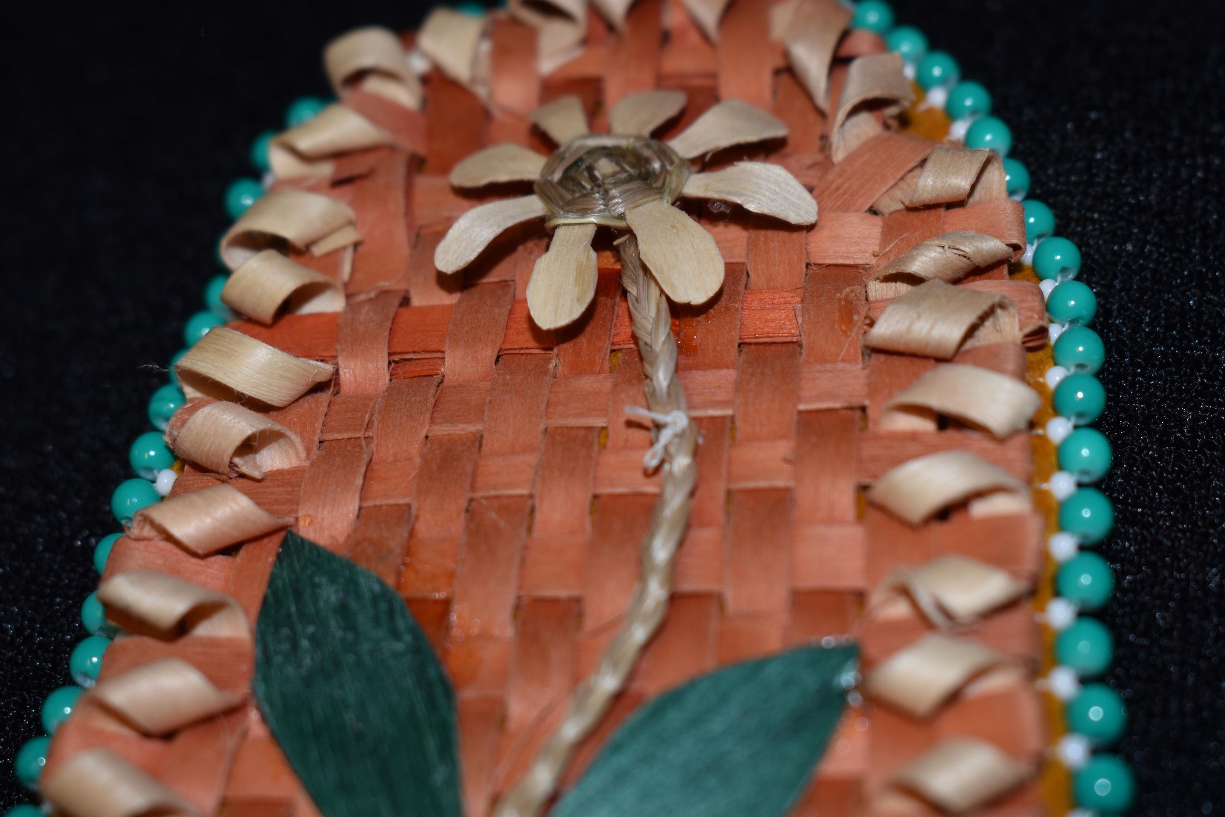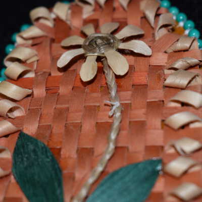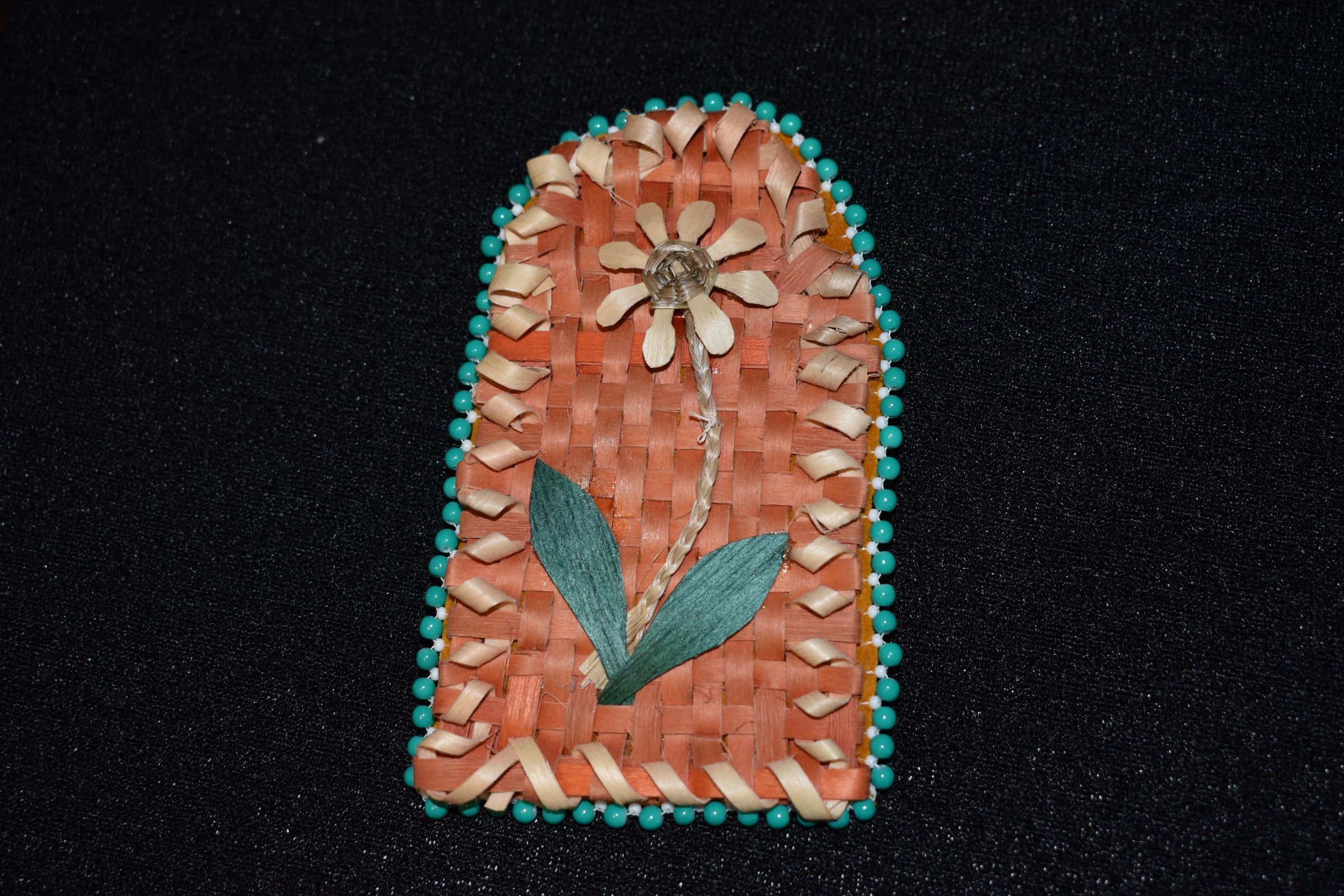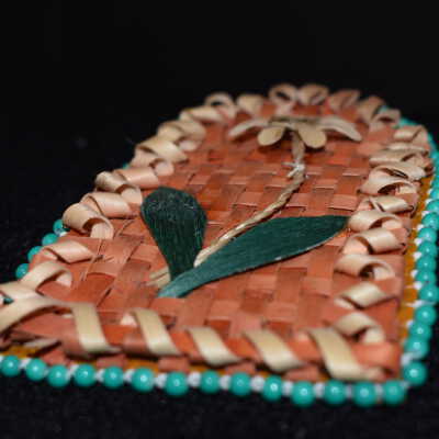 Orange dyed splints wer esset for the background, plain splints and sweetgrass was used for the flower and stem, and dyed green leaves were used for the leaves. Placed on leather, with turquoise and white beads for the edging.Cataloged By