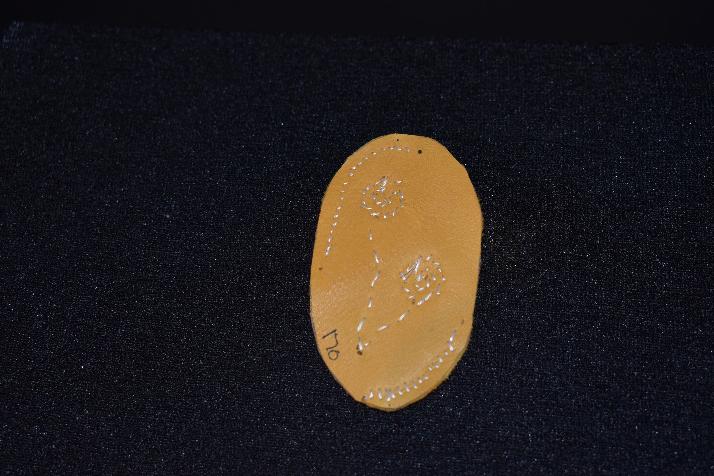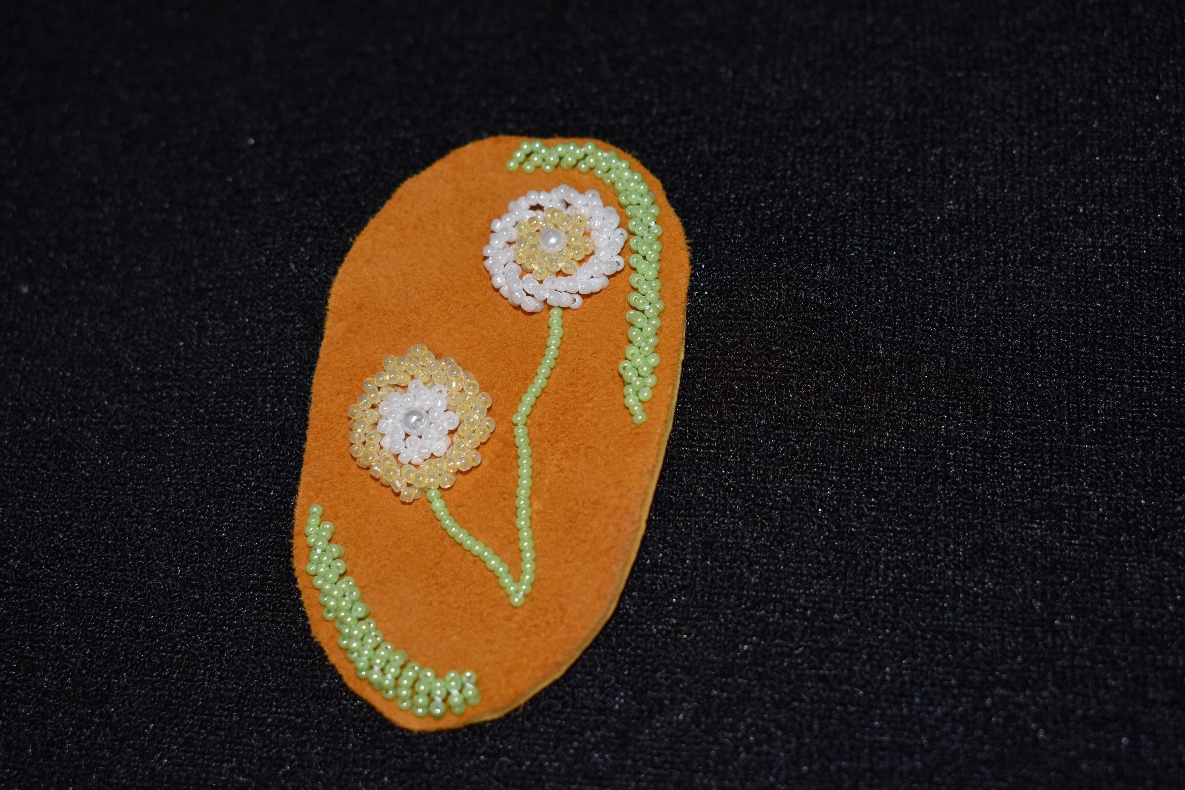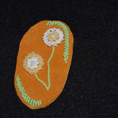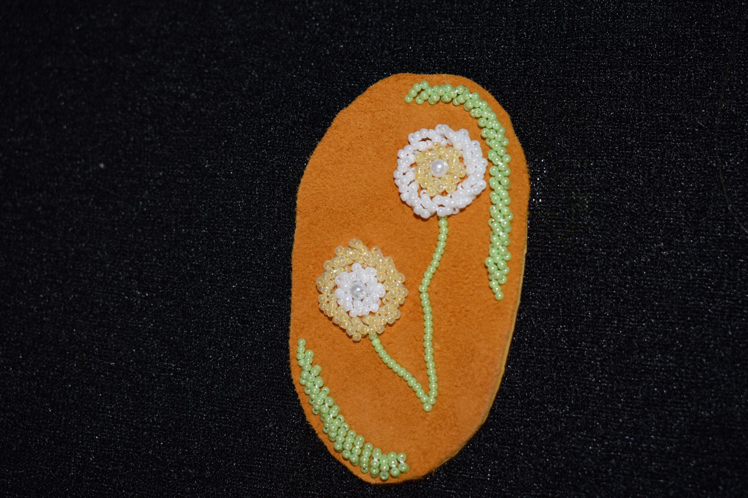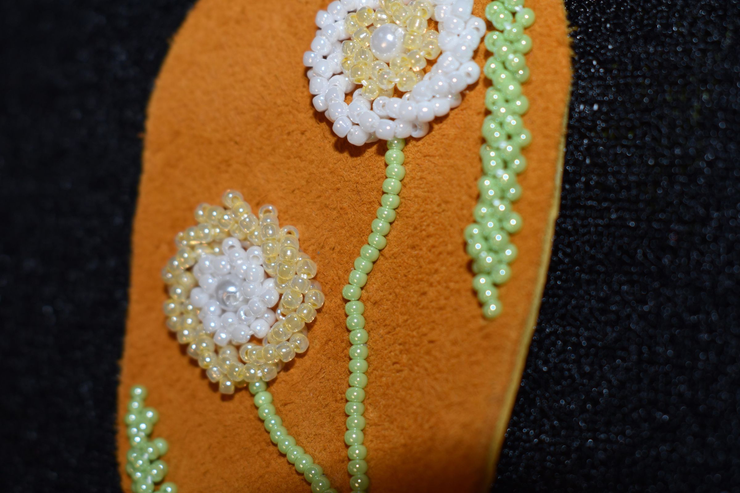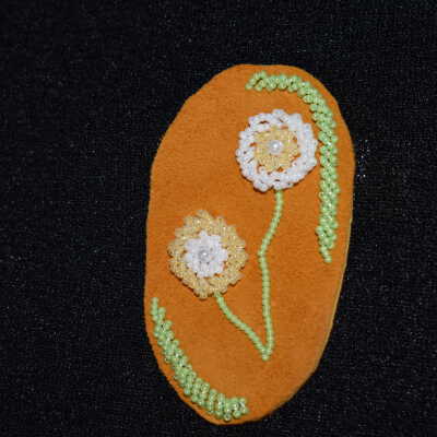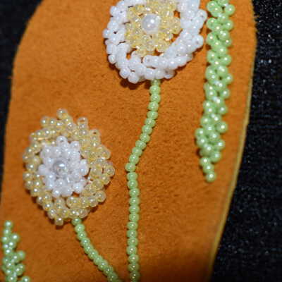 large white bead for the flower centres, white and yellow glass seed beads. Green glass seed beads on the stems and along the edge.Cataloged By