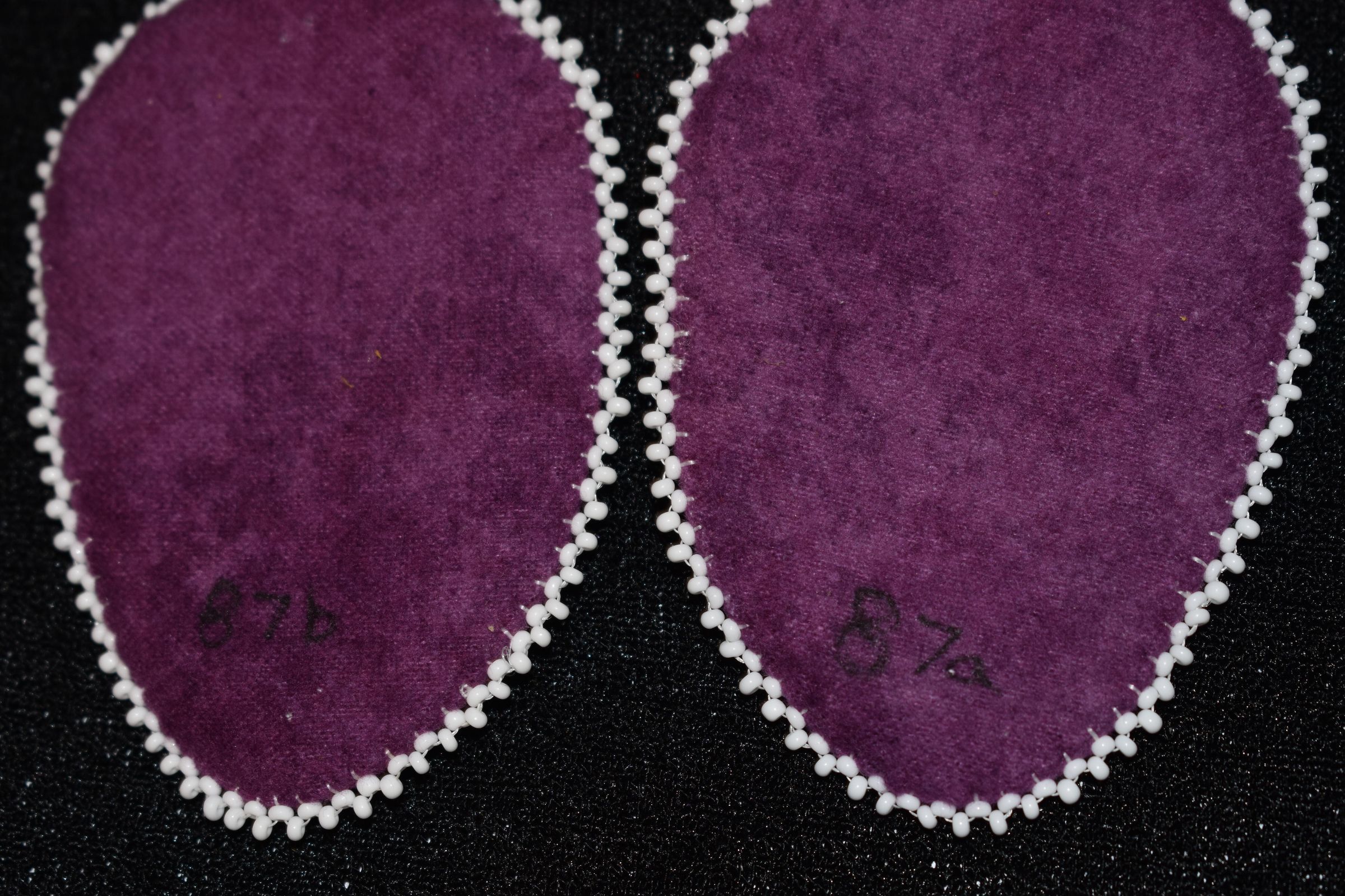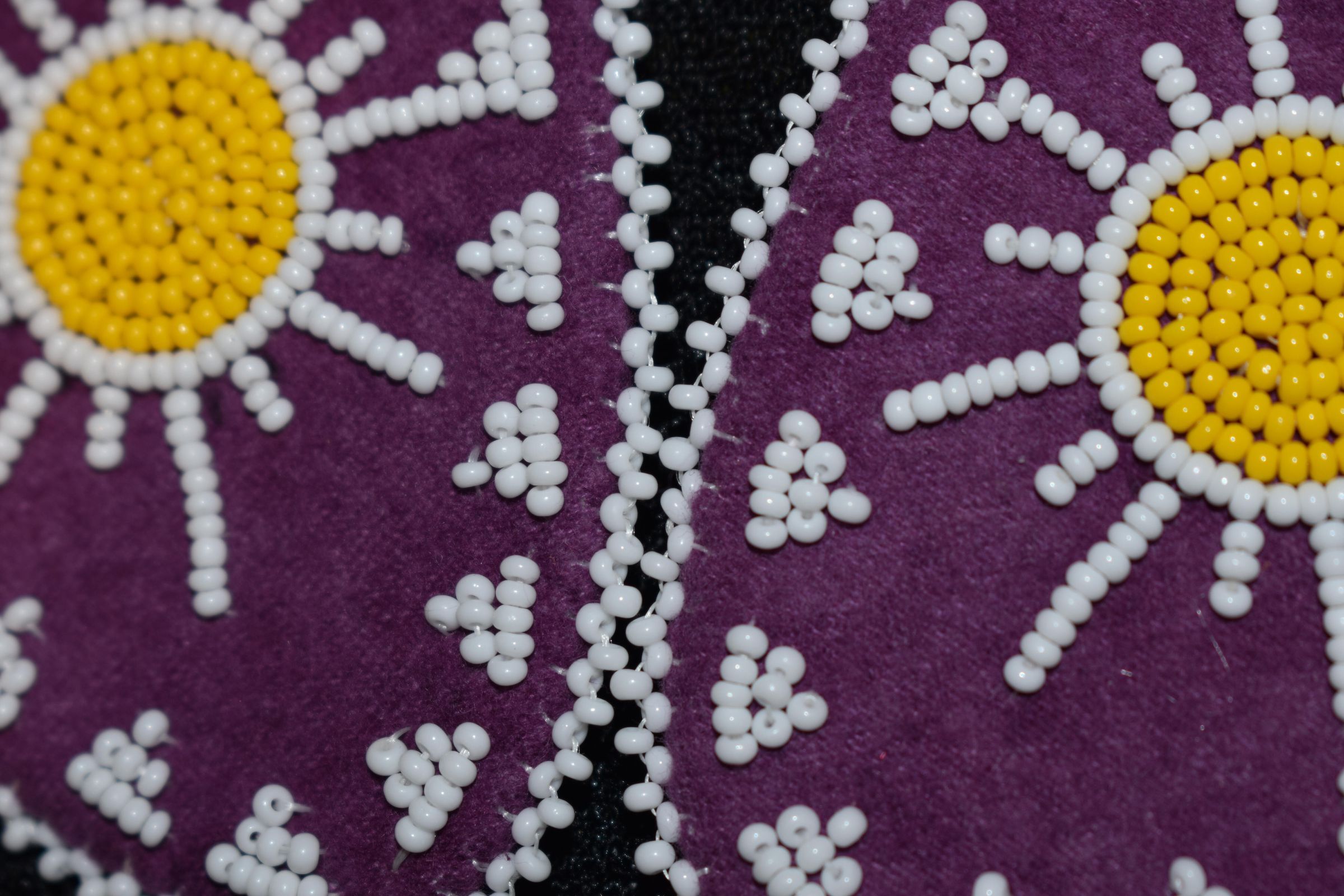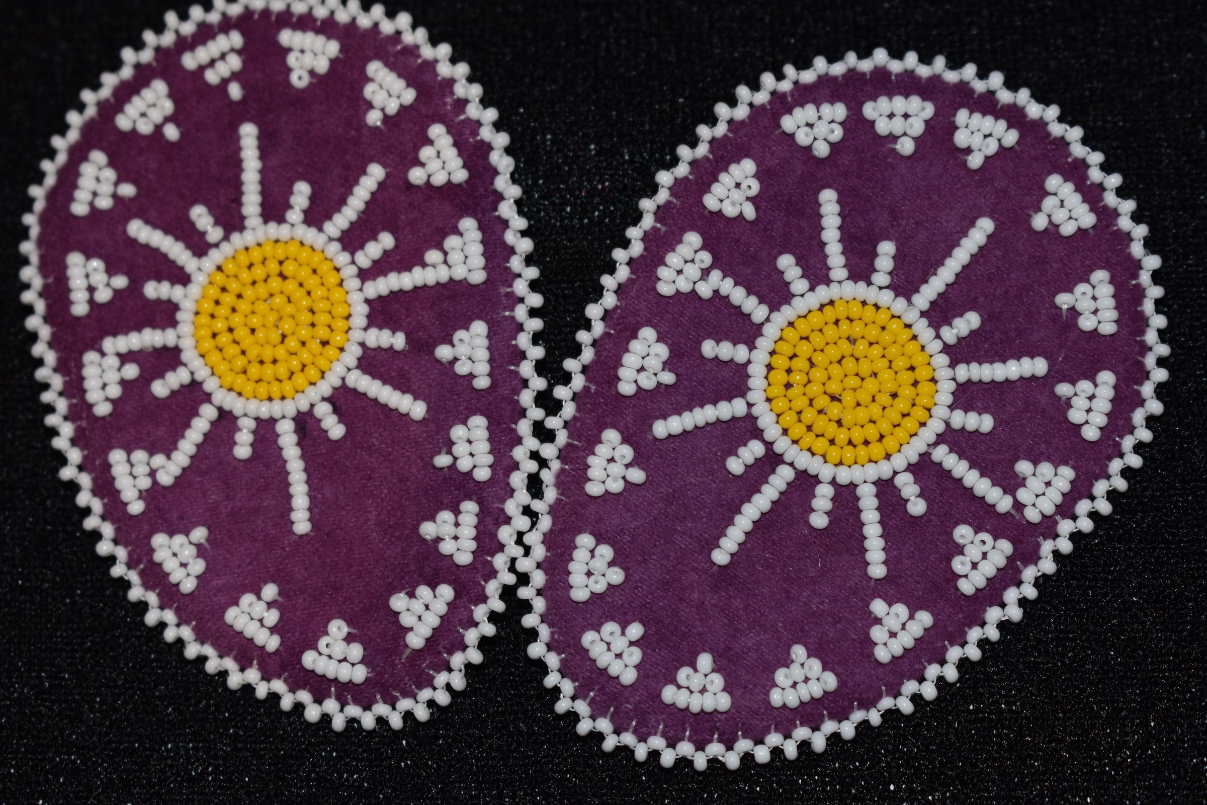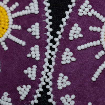 Vamps donated by Becky Benedict. Yellow and white glass seed beads on pellon and purple faux suede.