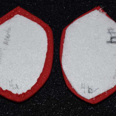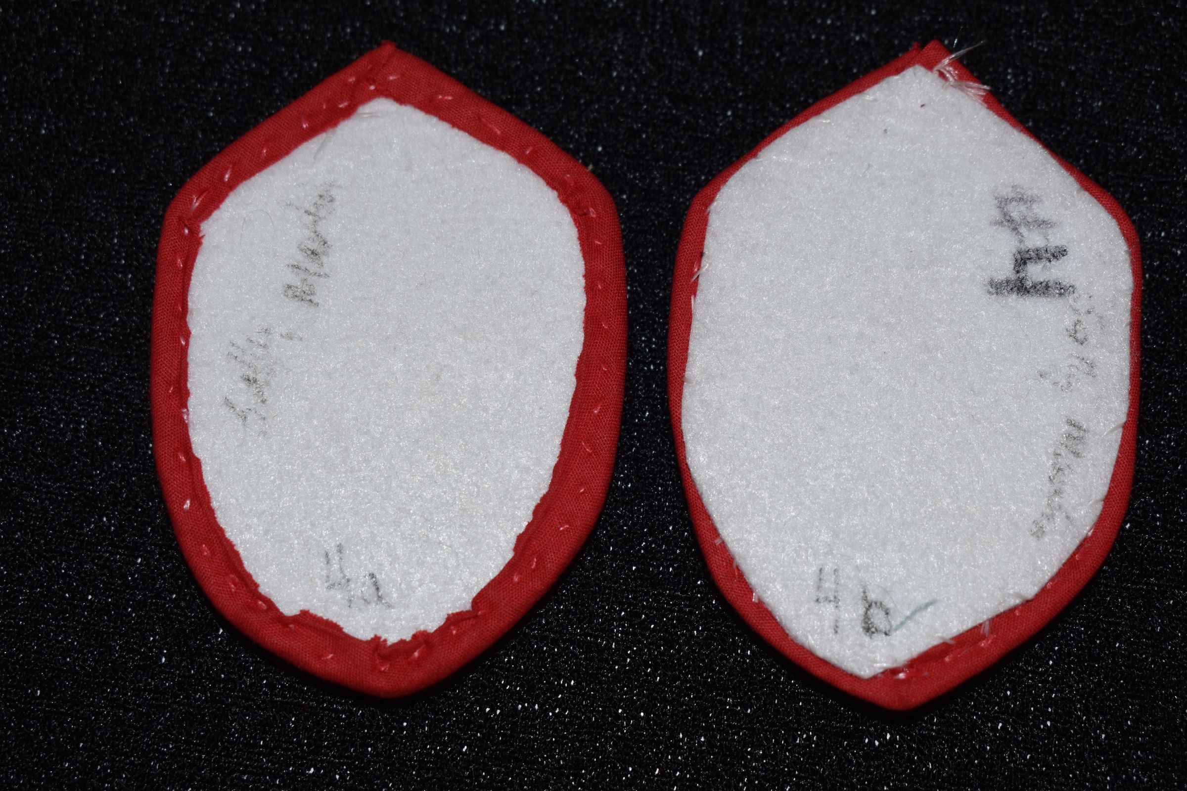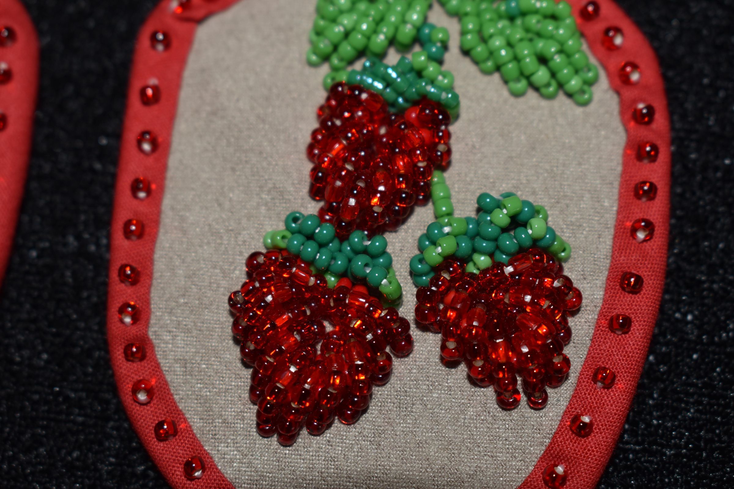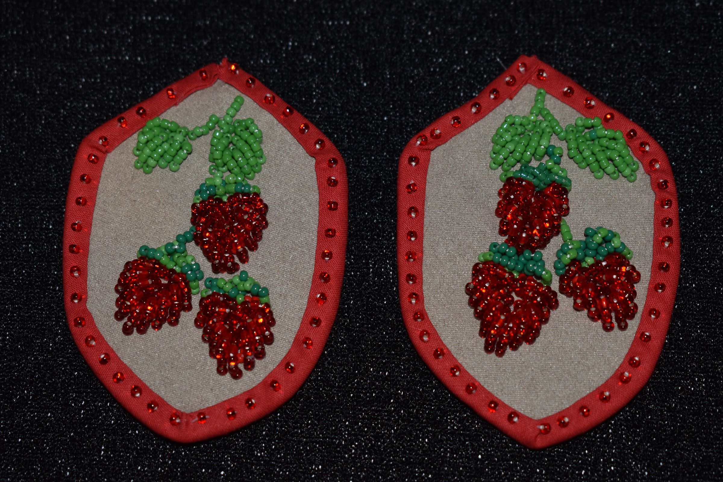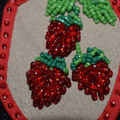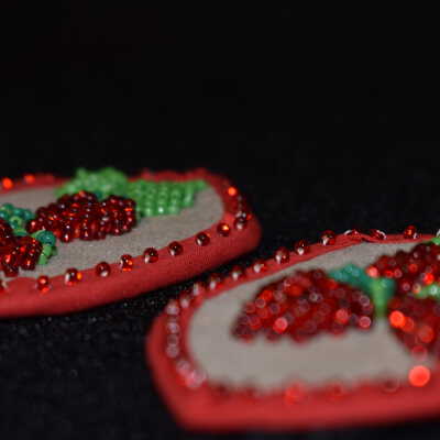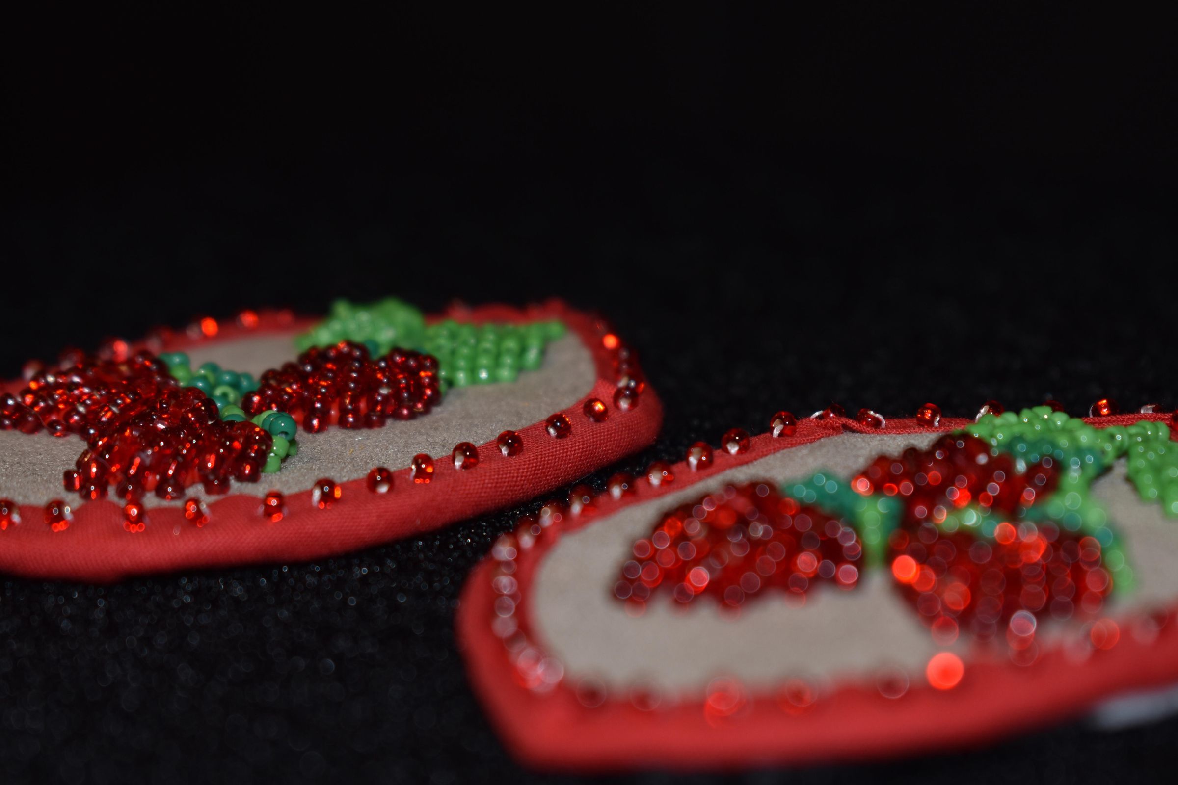 Vamps donated by Sally Martin. Red and green seed beads on felt and faux suede.