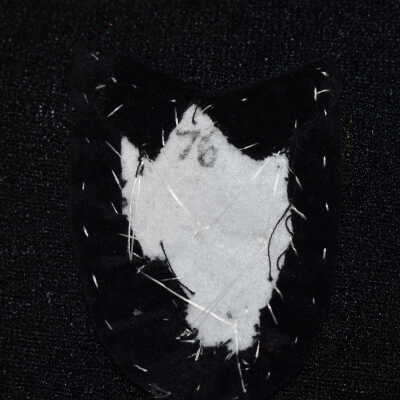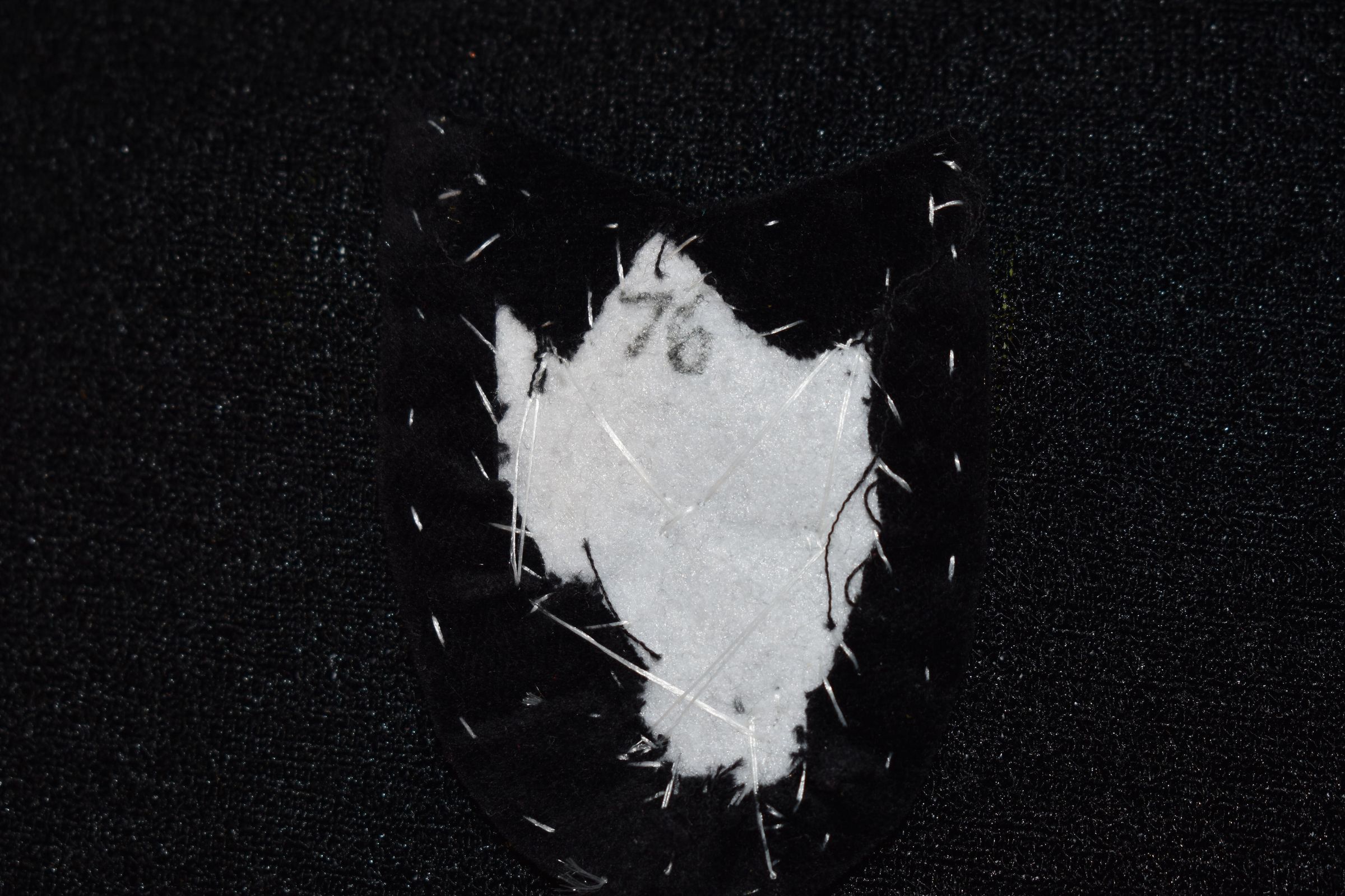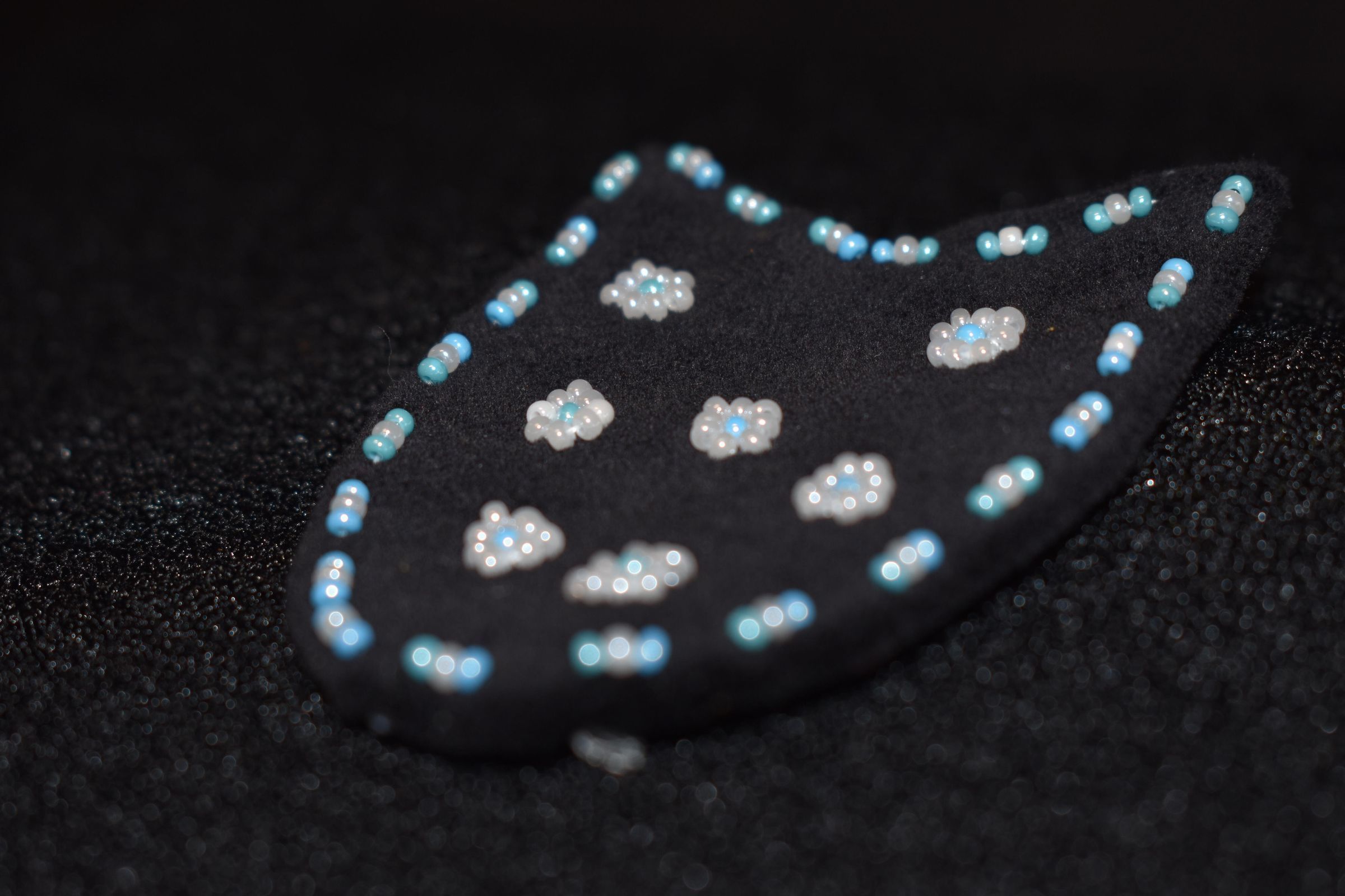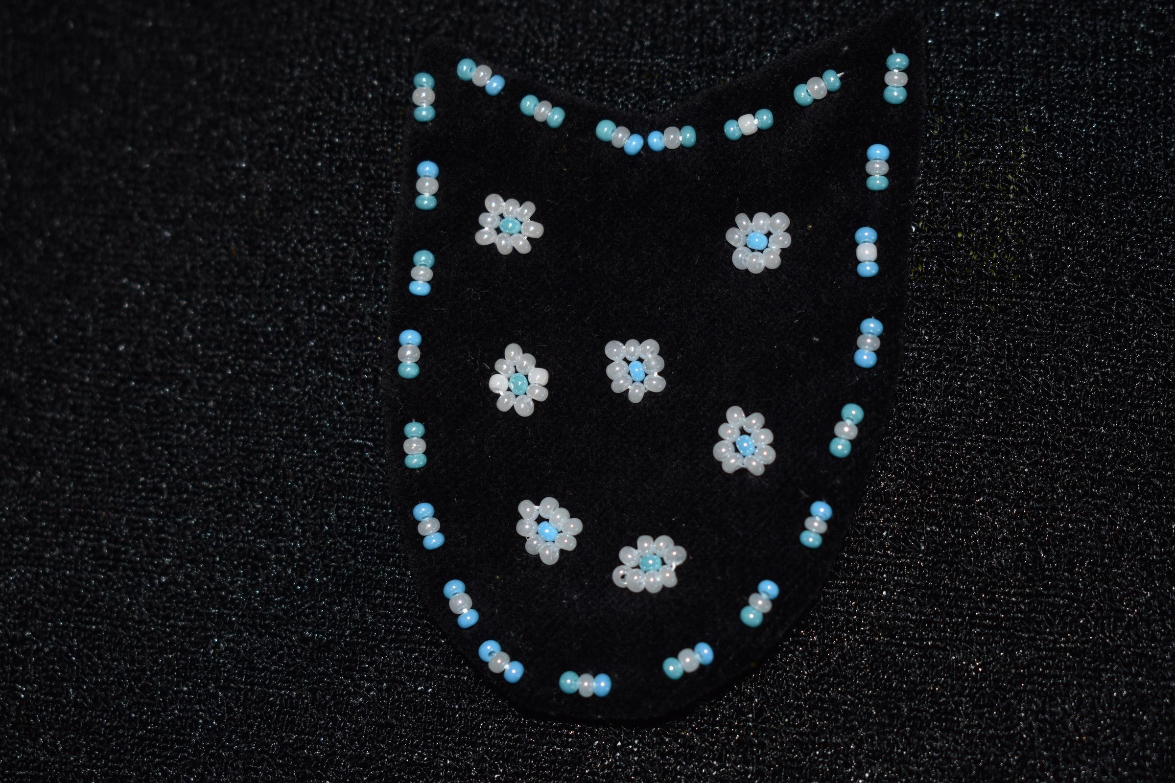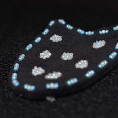 Vamp donated by Jackie Cree. Blue and white glass seed beads on pellon and faux suede.