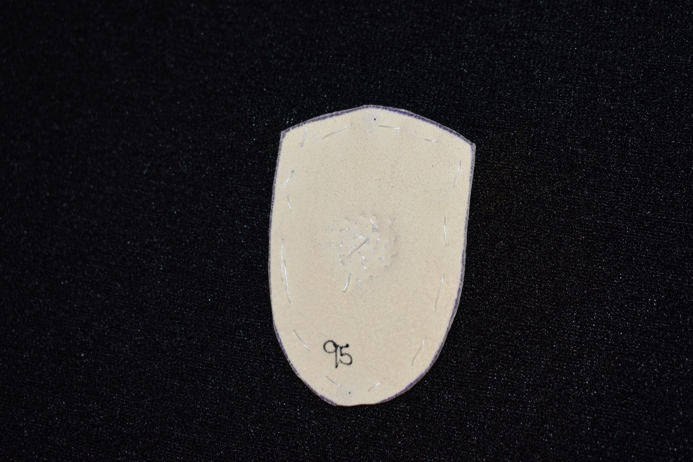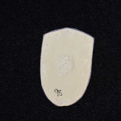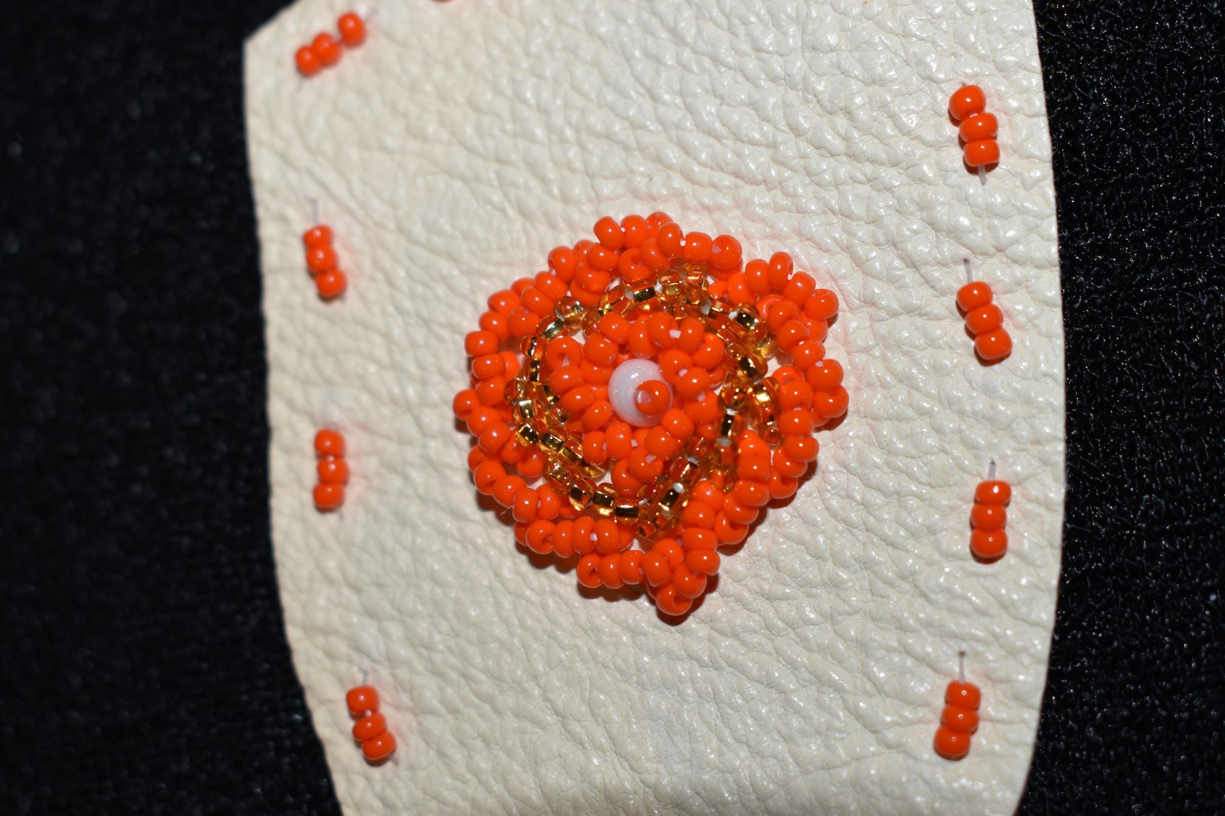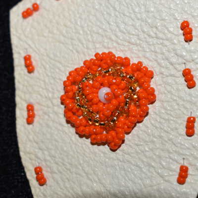 Vamp donated by Jackie Cree. Large white centre bead. Orange and gold glass seed beads on leather.