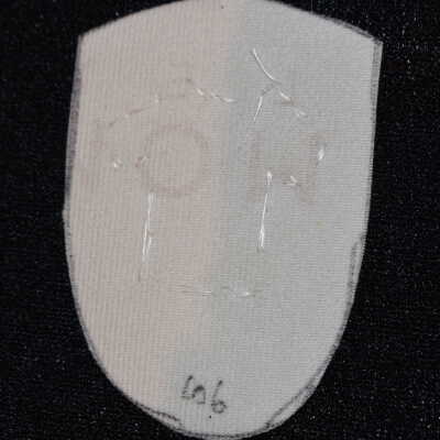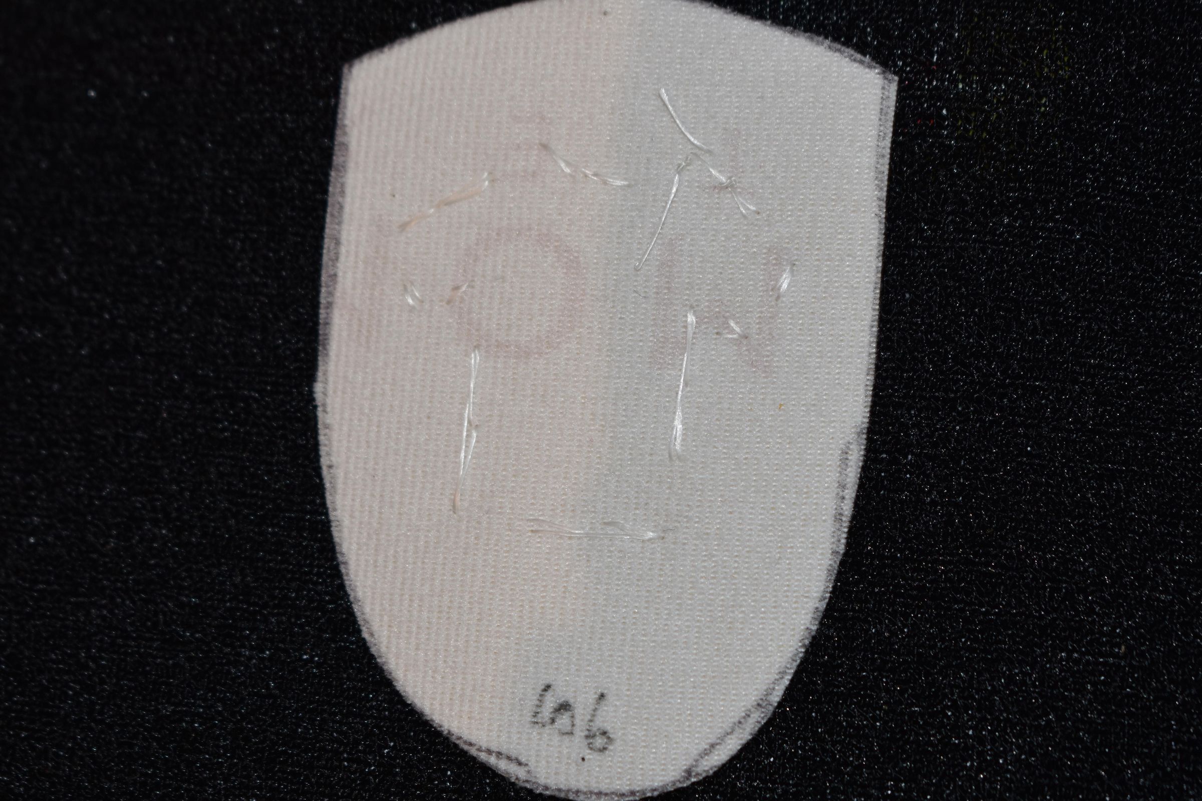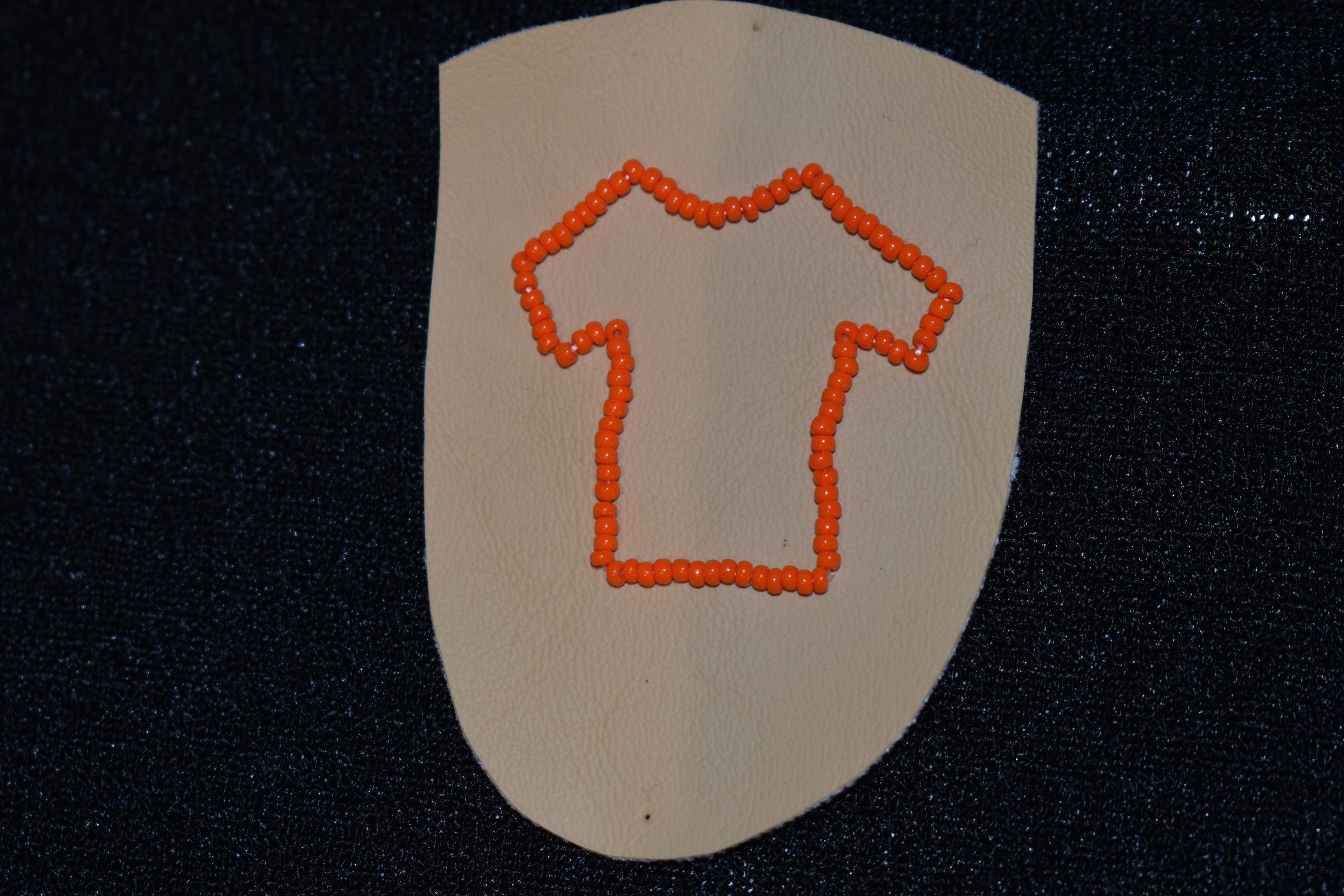 Vamp donated by Jackie Cree. Orange glass seed beads were used to make a t-shirt on vinyl.