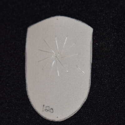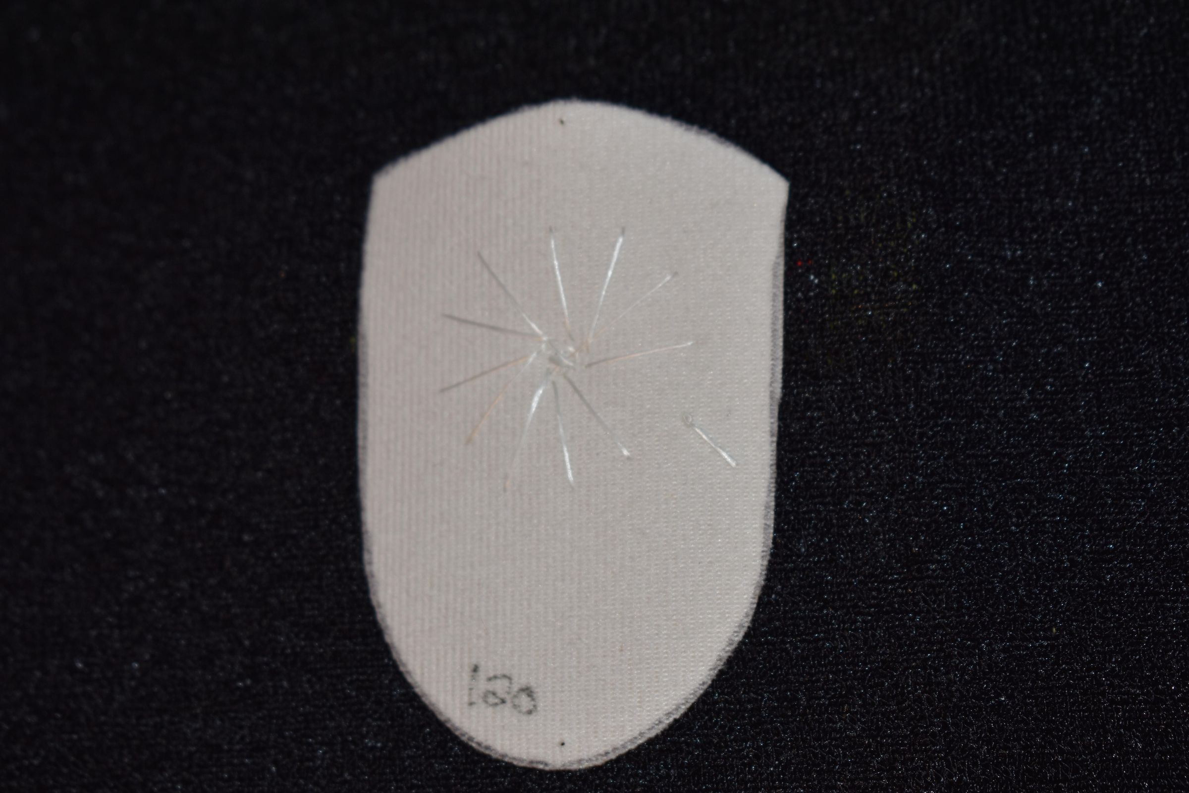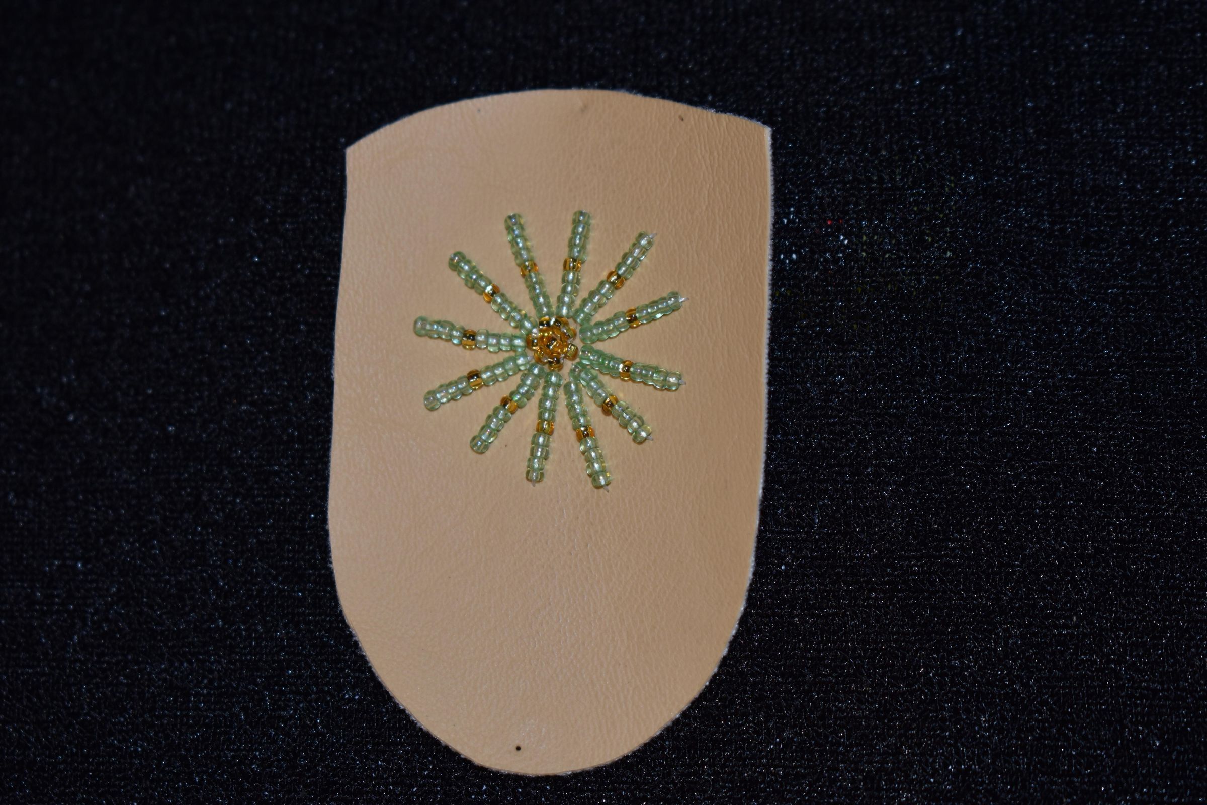 Vamp donated by Jackie Cree. Gold and teal glass seed beads on vinyl.