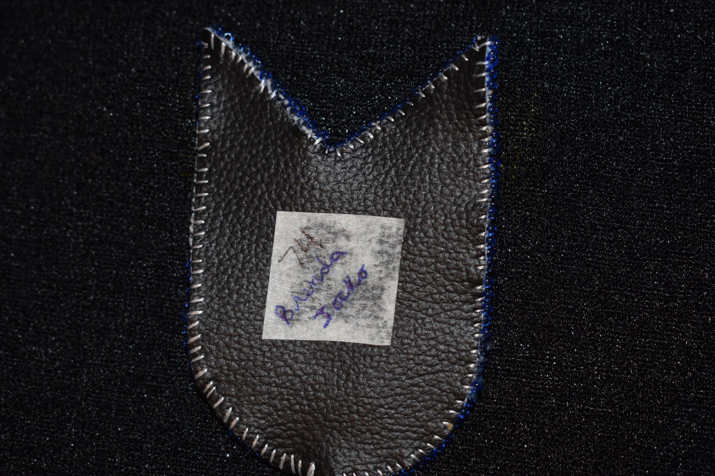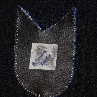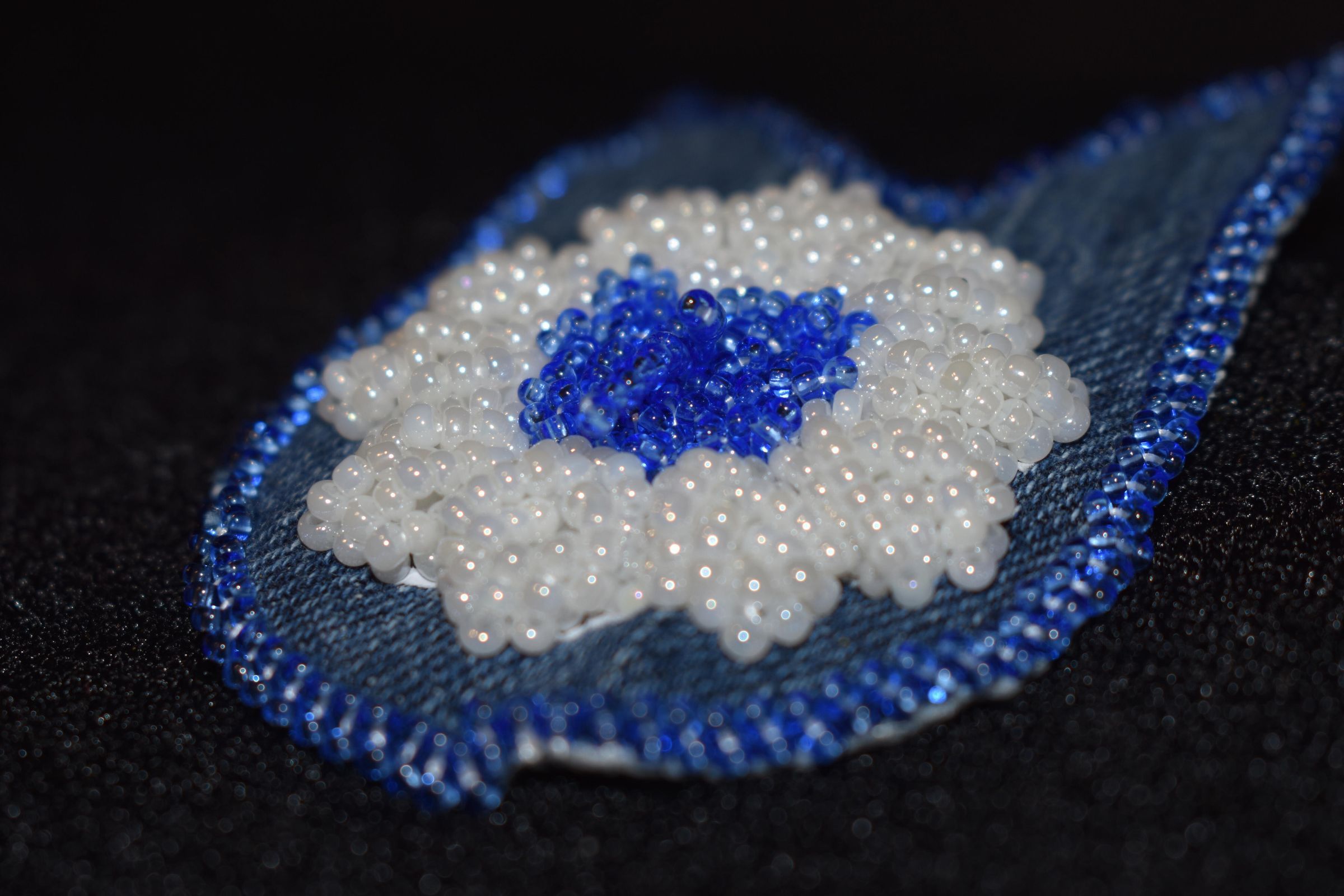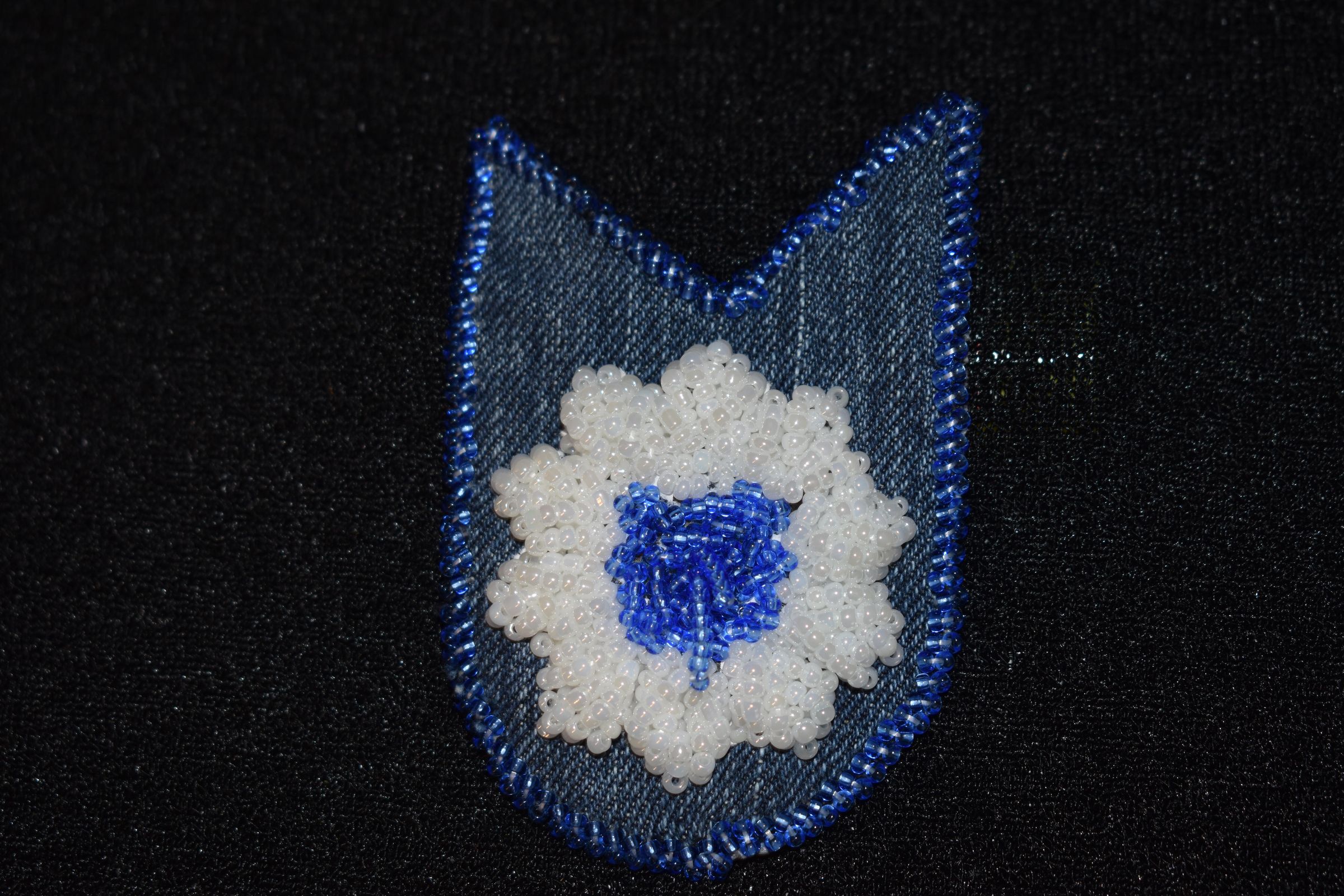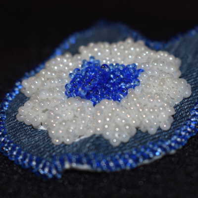 Blue glass seed beads were used to make a centre for the flower. White glass seed beads were used to make petals. Bead on a seperate material then sewn onto the denim material. backed with vinyl, edged with glue glass seed beads.Cataloged By